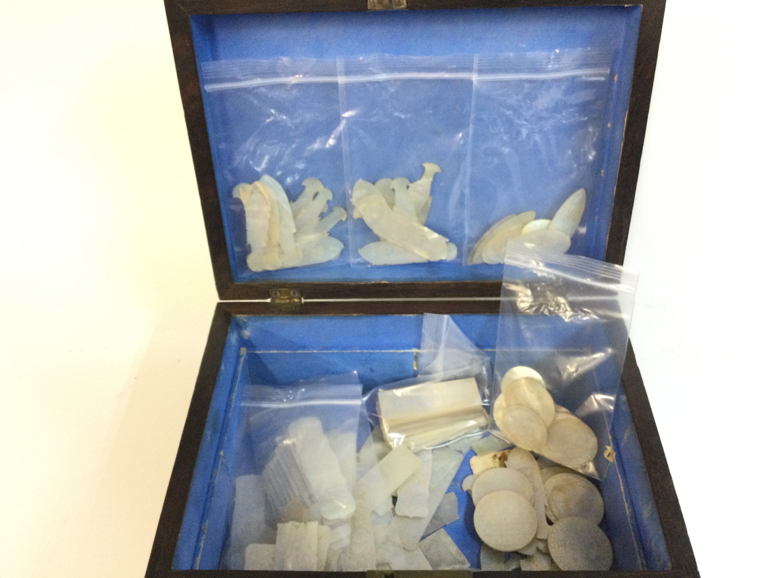 Approximately 90 Chinese mother of pearl gaming counters in an antique box . Postage category B