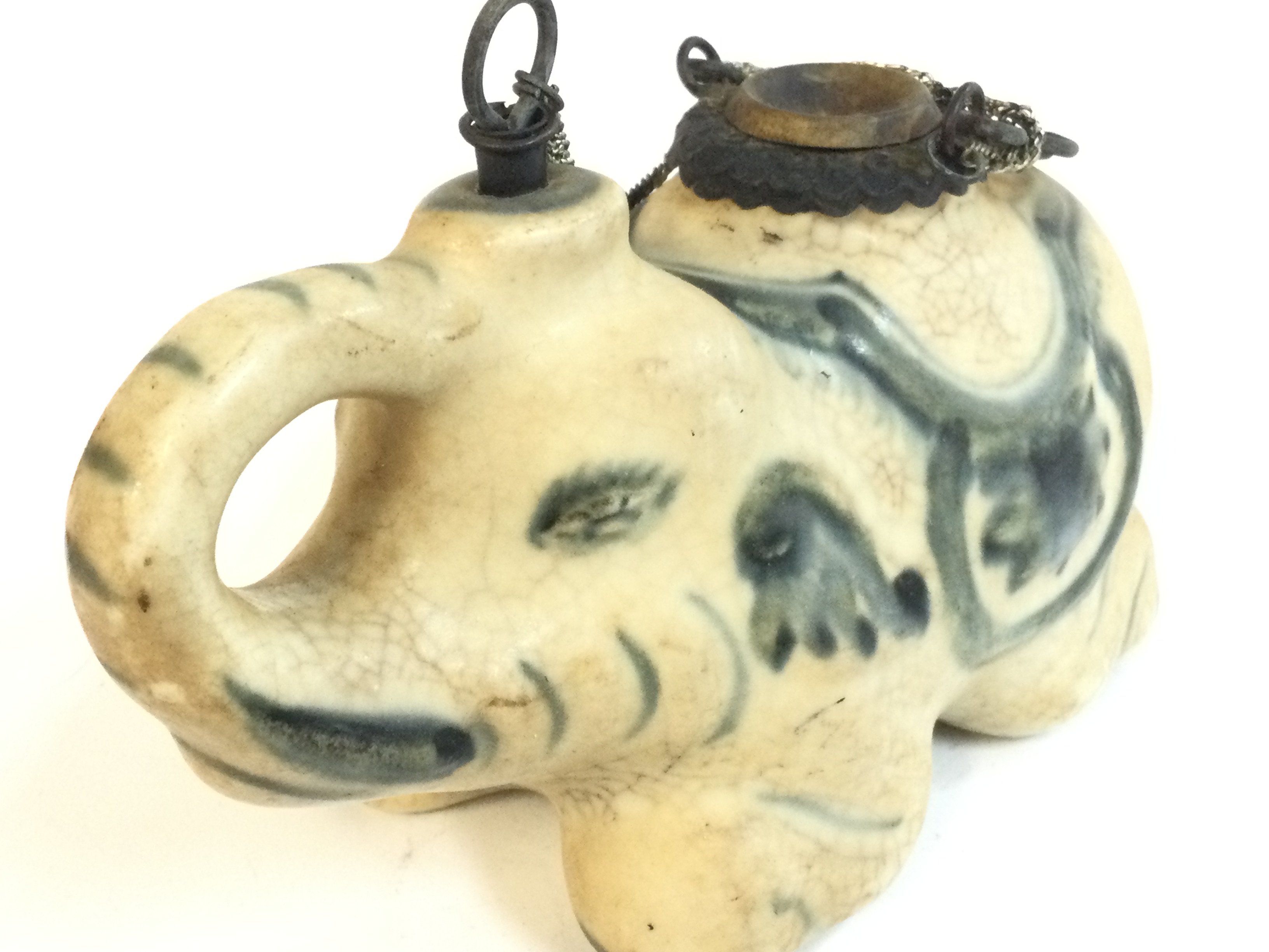 A Chinese porcelain elephant opium smoking pipe 15cm long 10cm tall approximately
