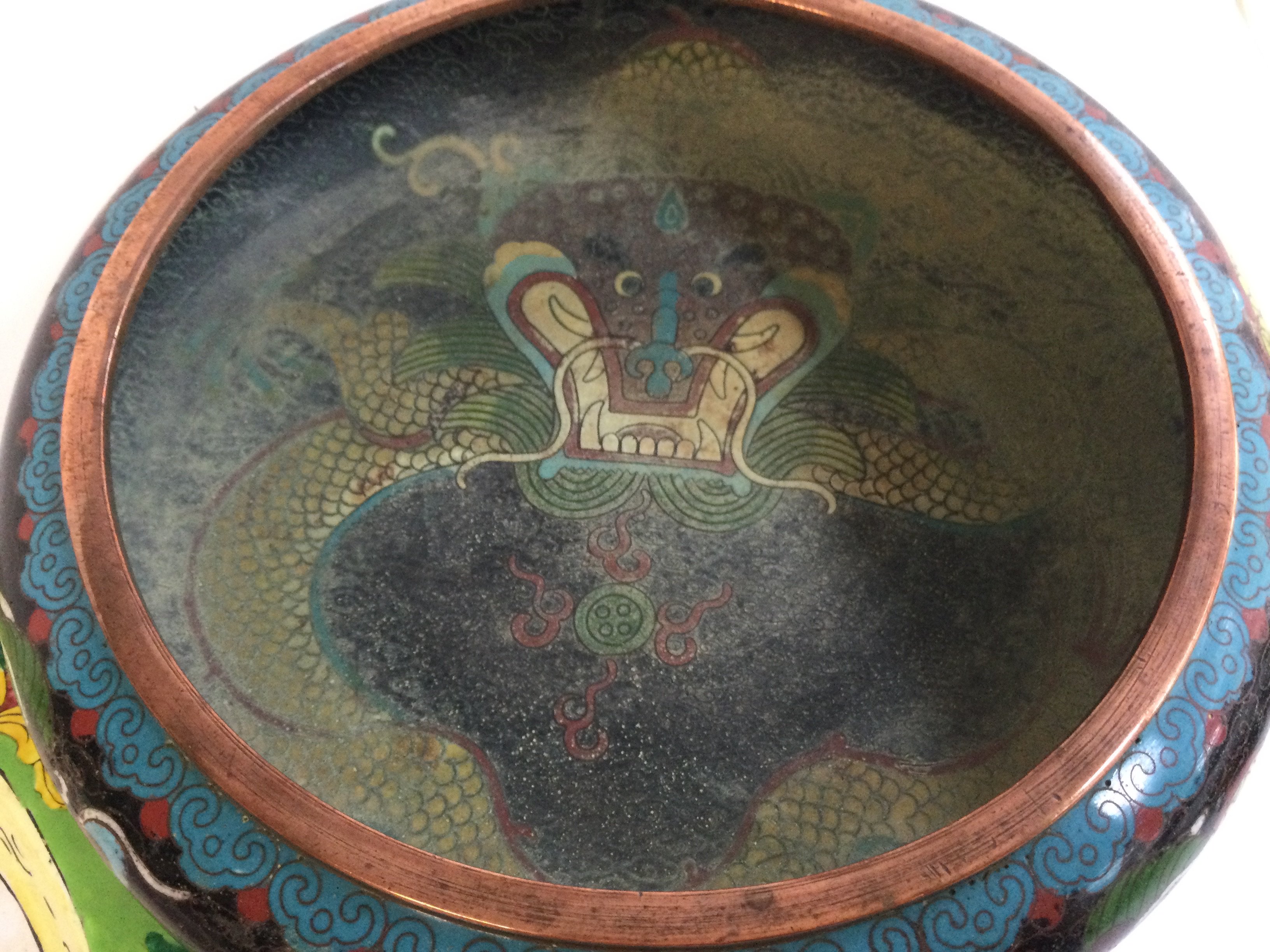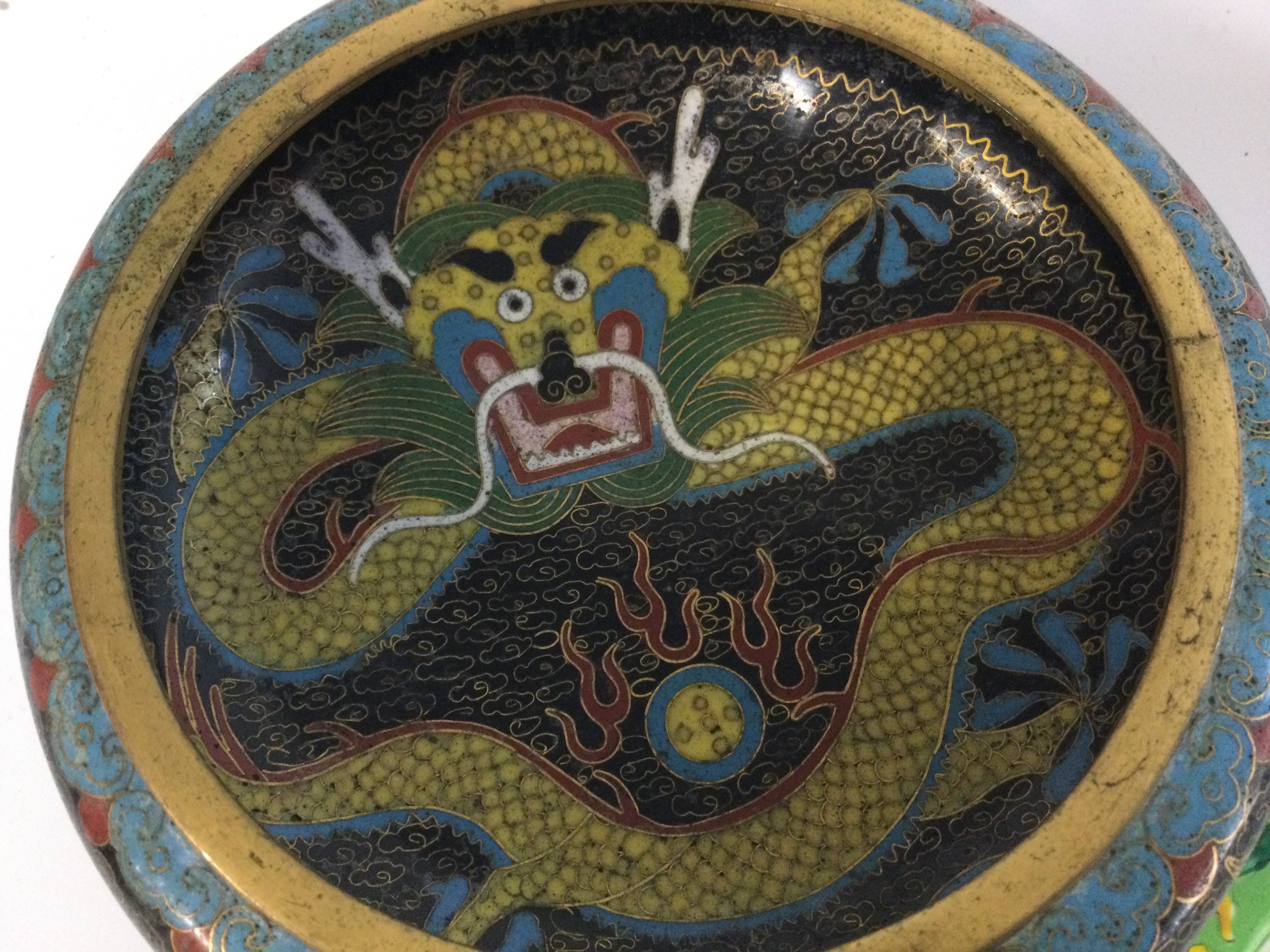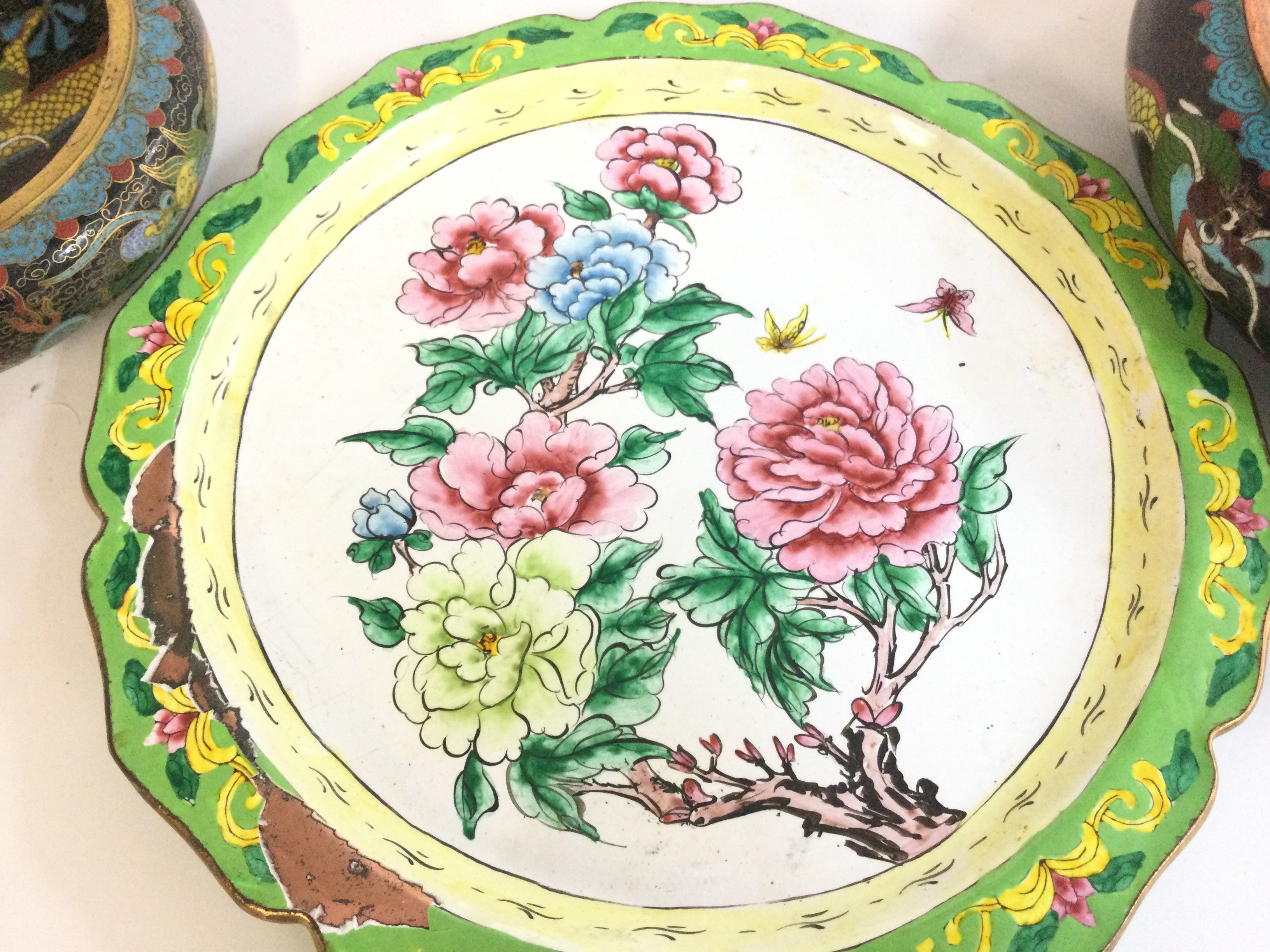Two Chinese cloisonne enamel bowls, one signed and Chinese cloisonne plate . 15, 25 and 22cm wide. Postage category C
