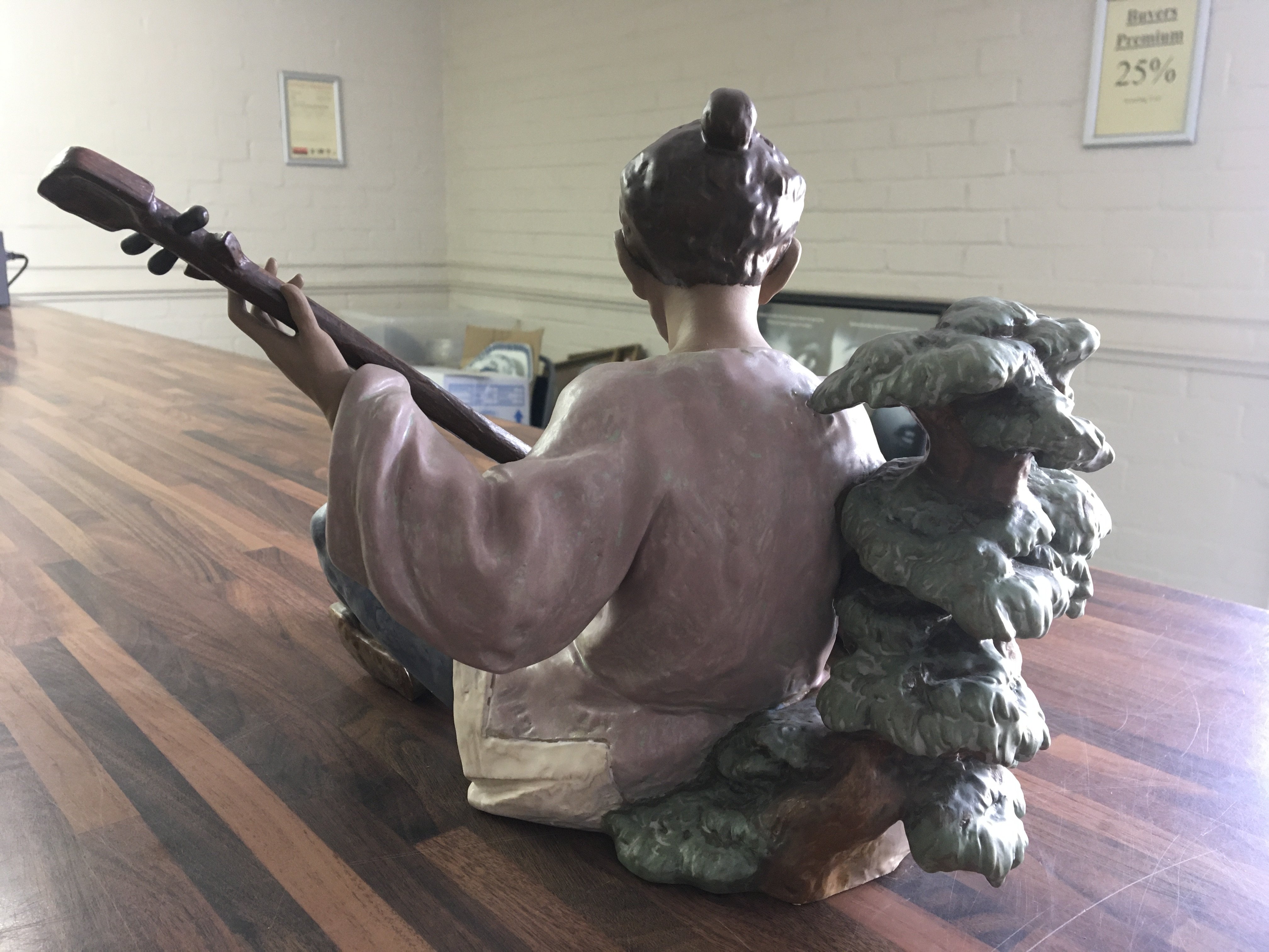 A large boxed Lladro figure of an oriental gentleman playing an instrument. 38cm in height approximately. No obvious damage or restoration