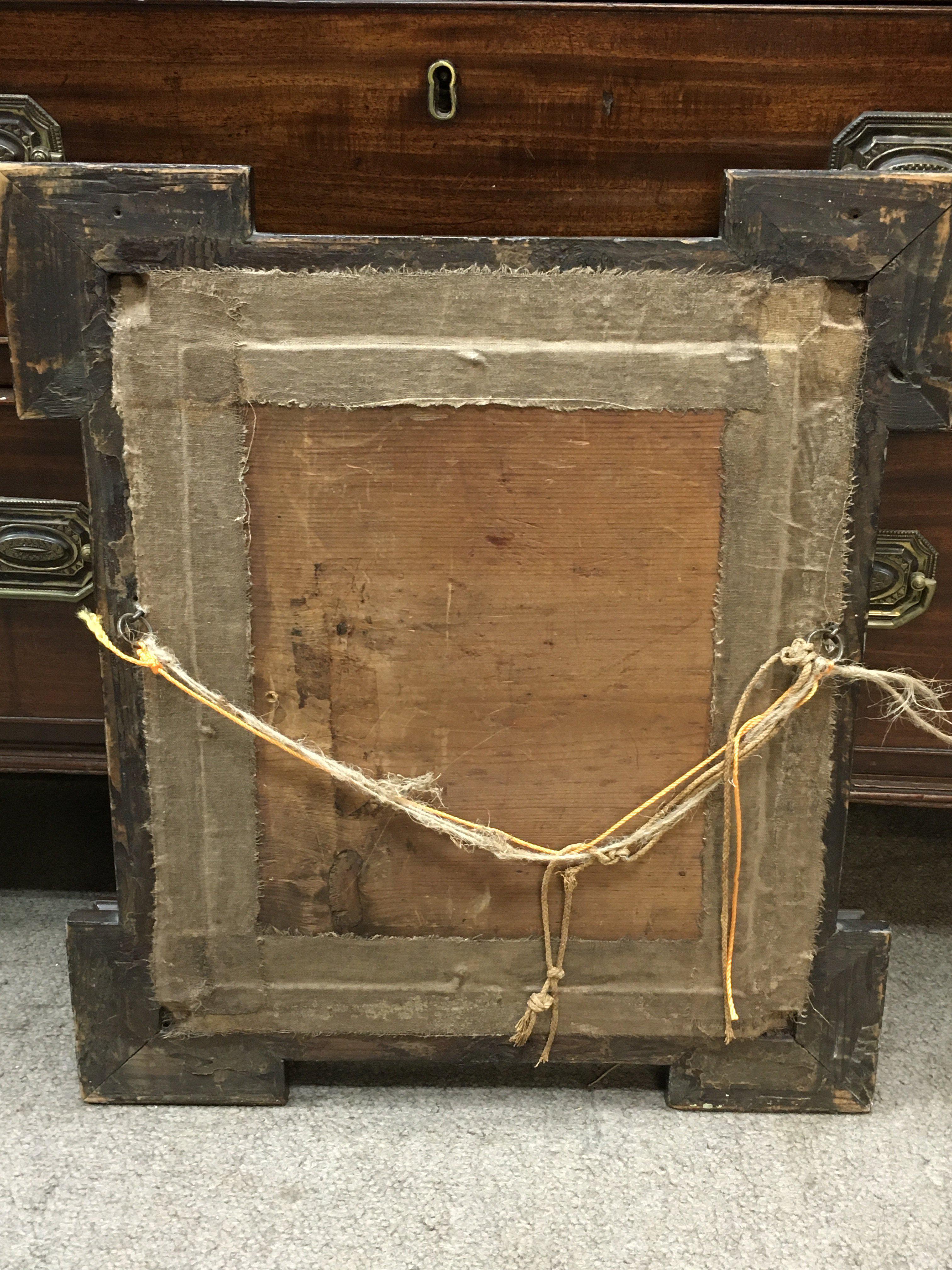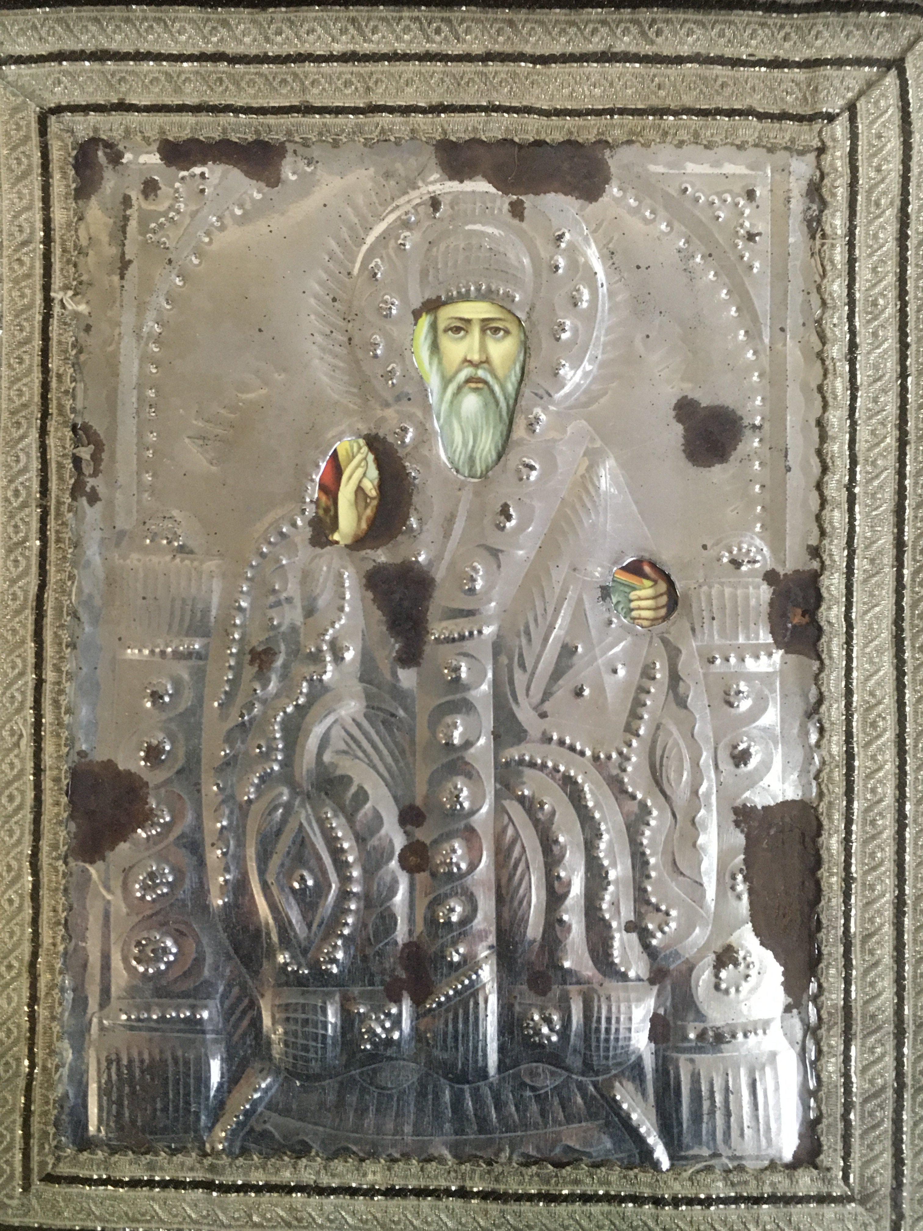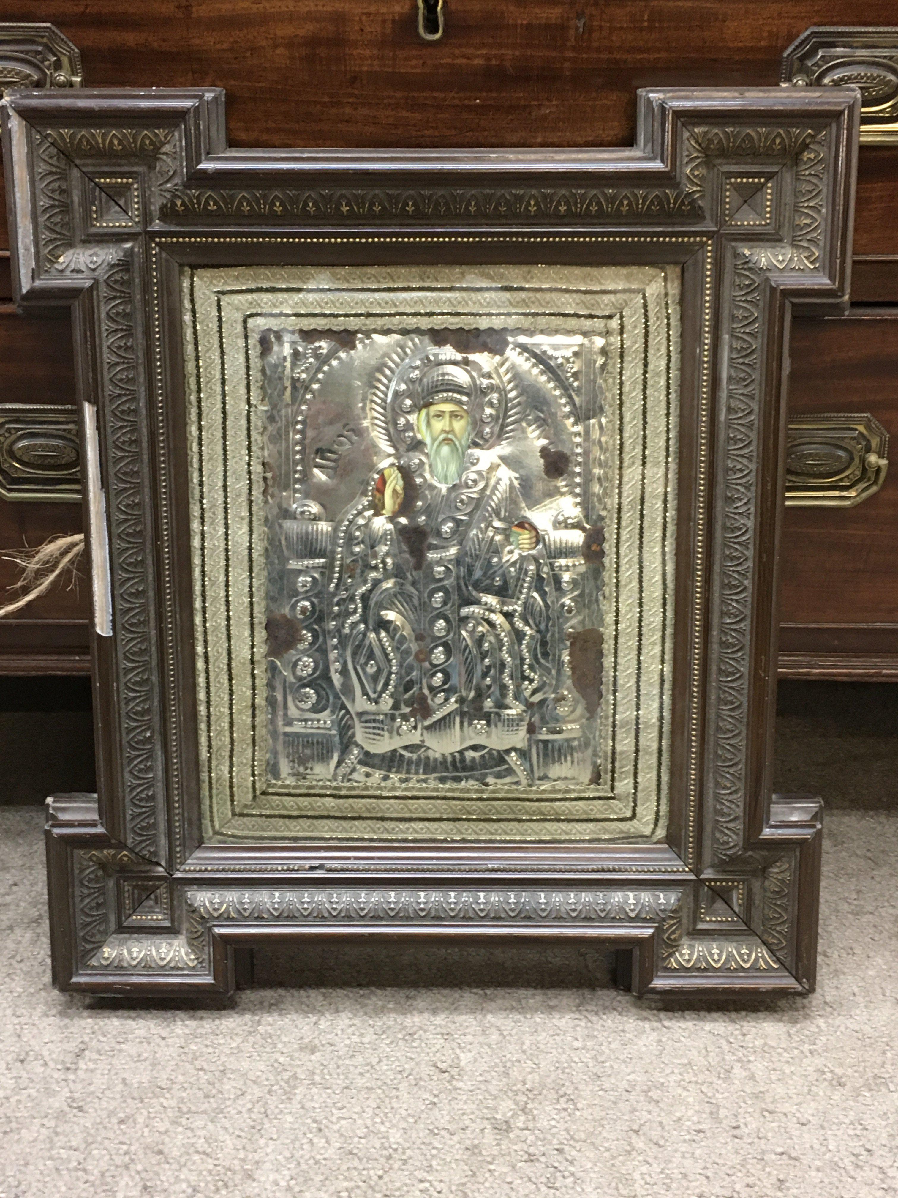 A Russian Icon on wood with a silver background . frame size 40x46cm.