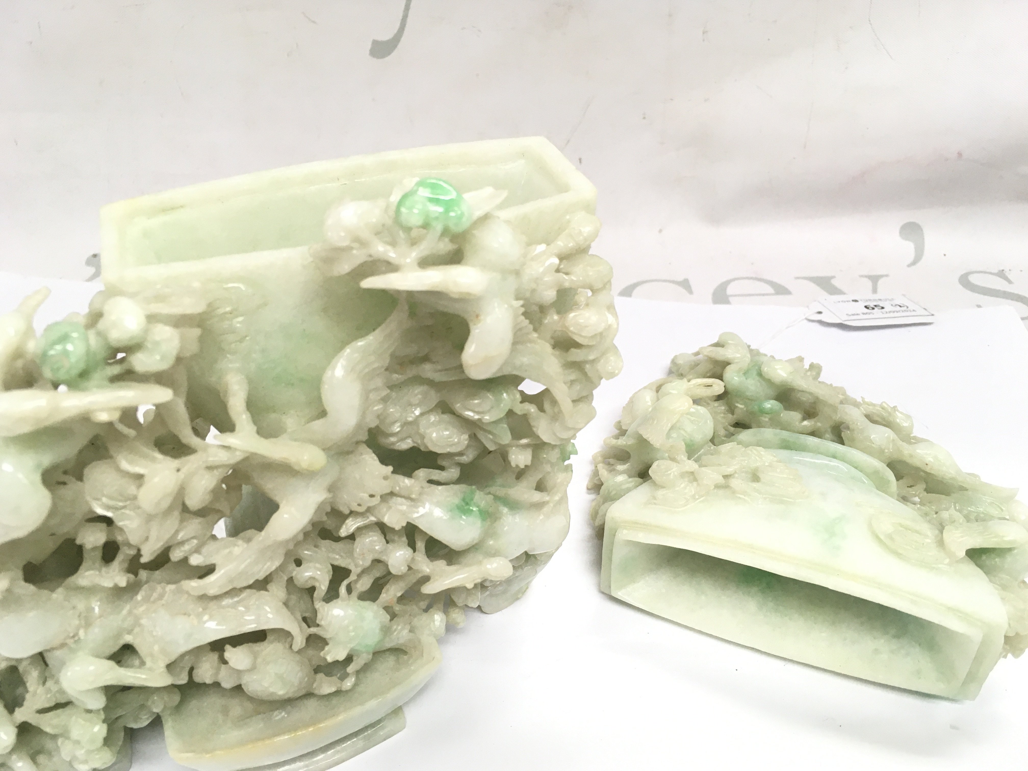 An impressive 20th century Apple Green dye Jade lidded pot surrounded by cranes and other animals, with box. Approximately 25cm tall 16cm wide . This lot cannot be posted