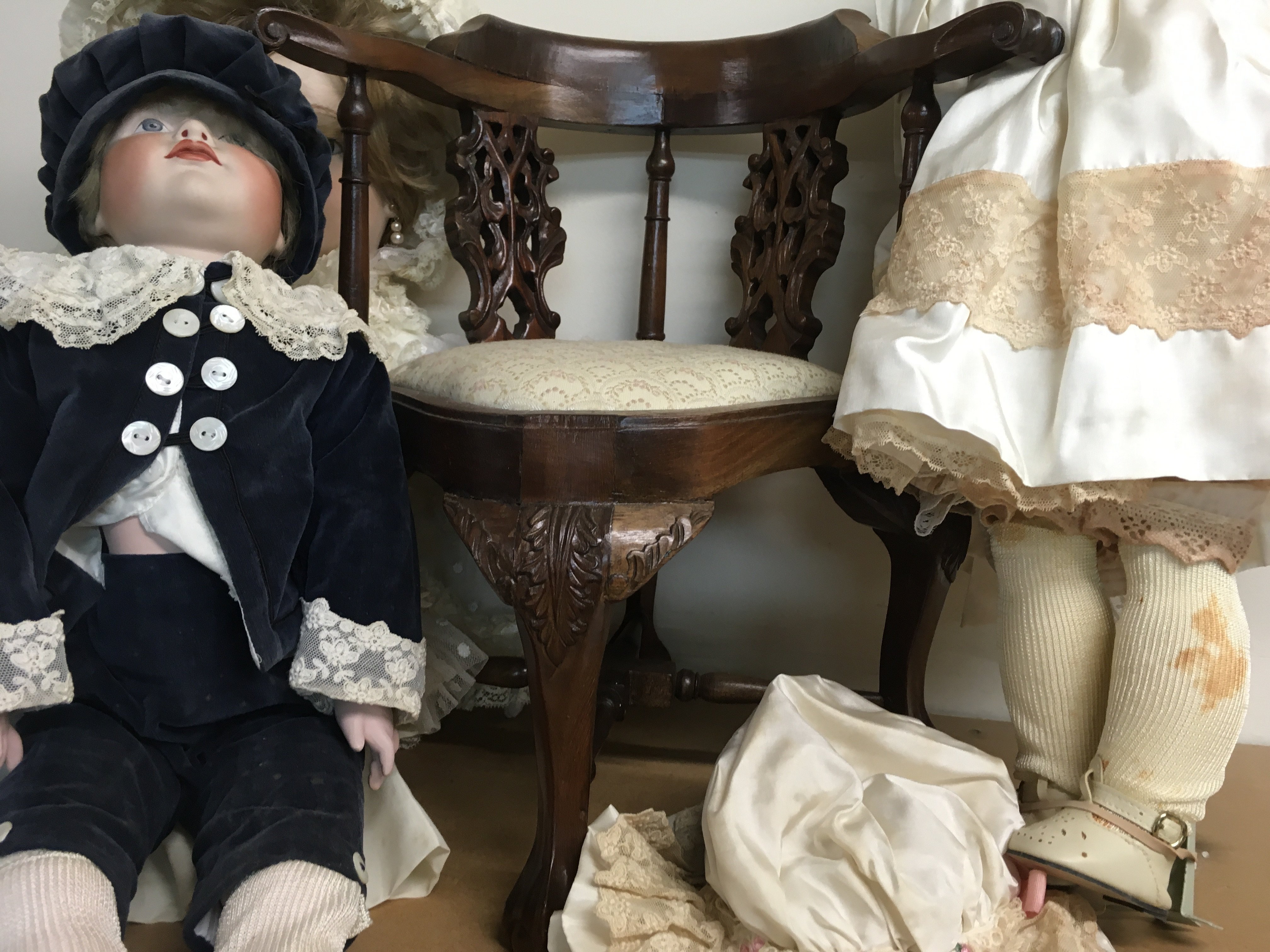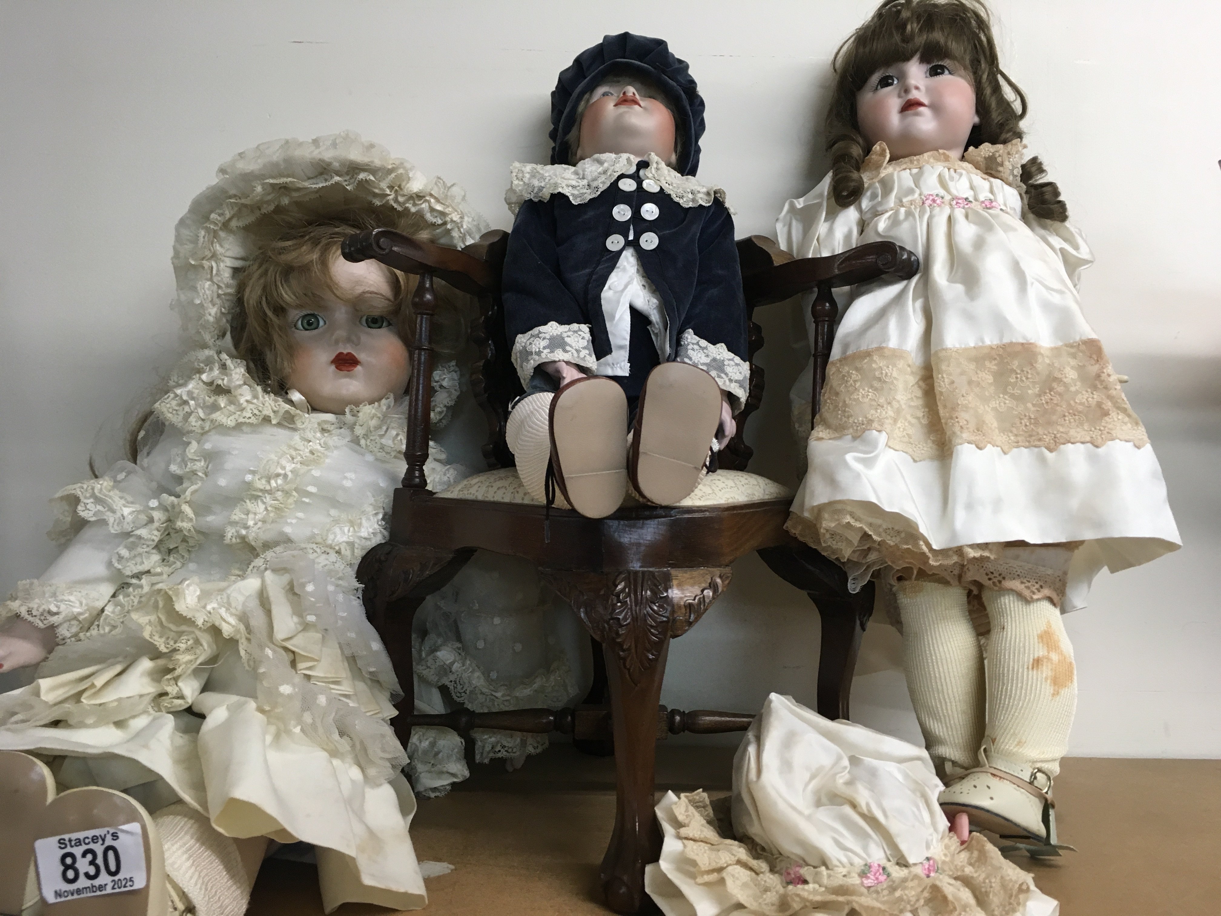 Three Victorian style dolls together with a reproduction dolls corner chair (No reserve) .