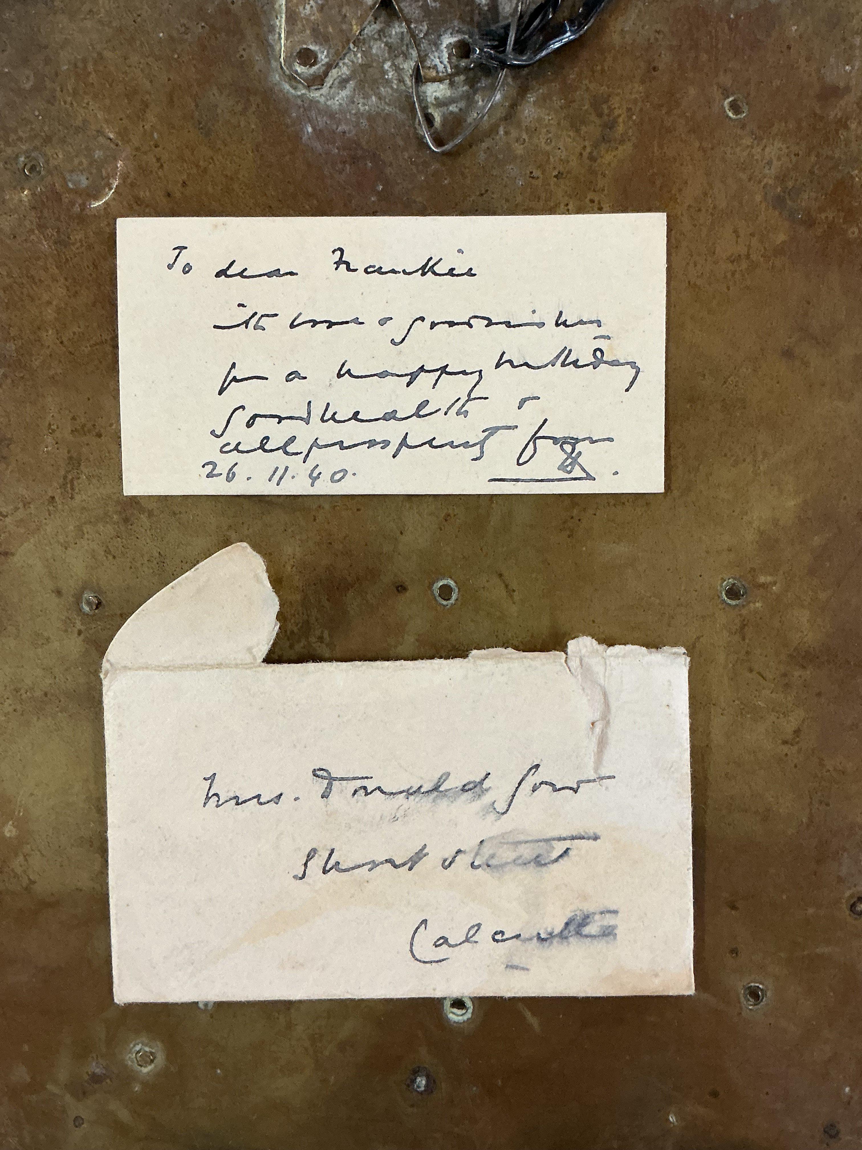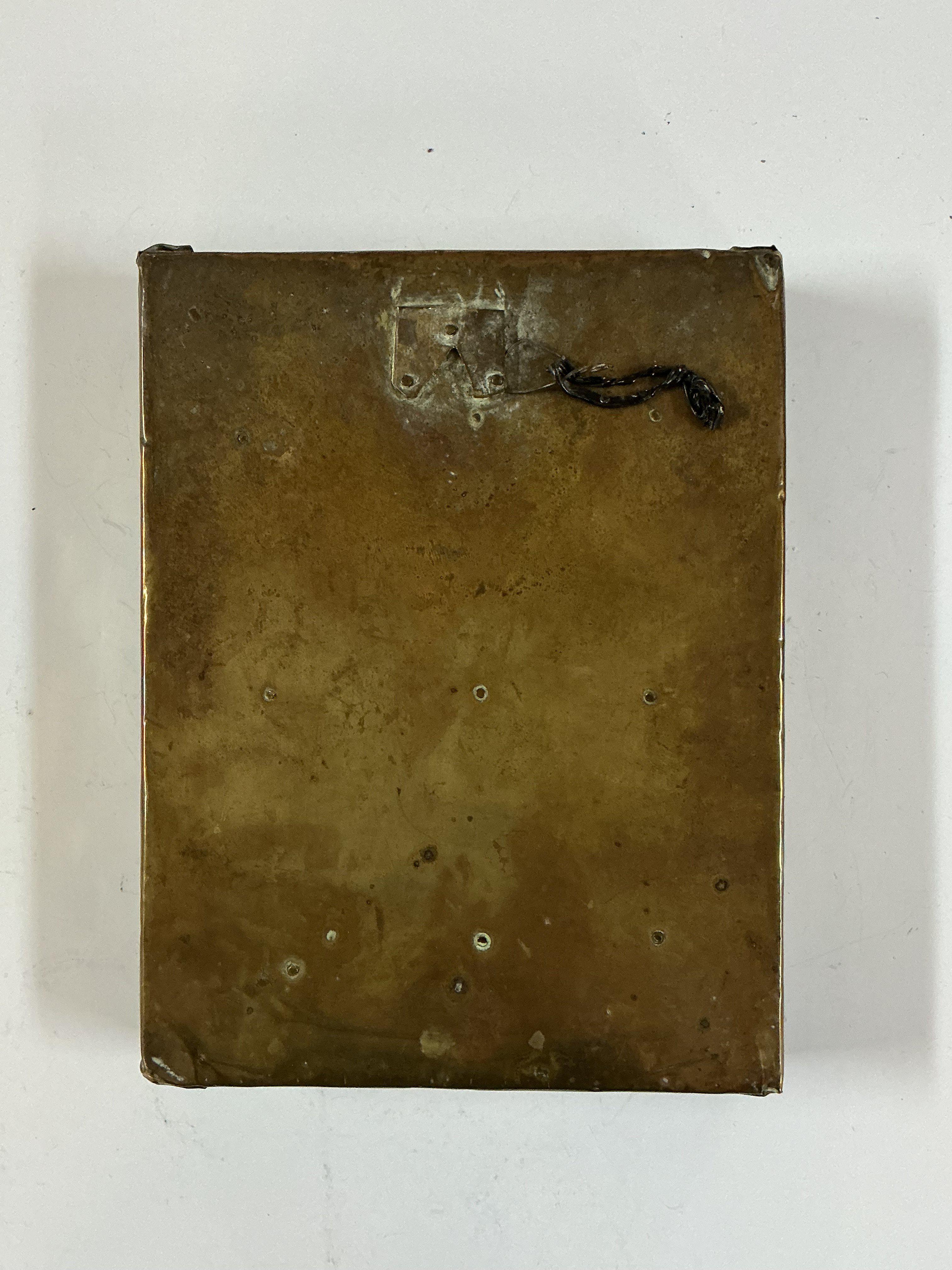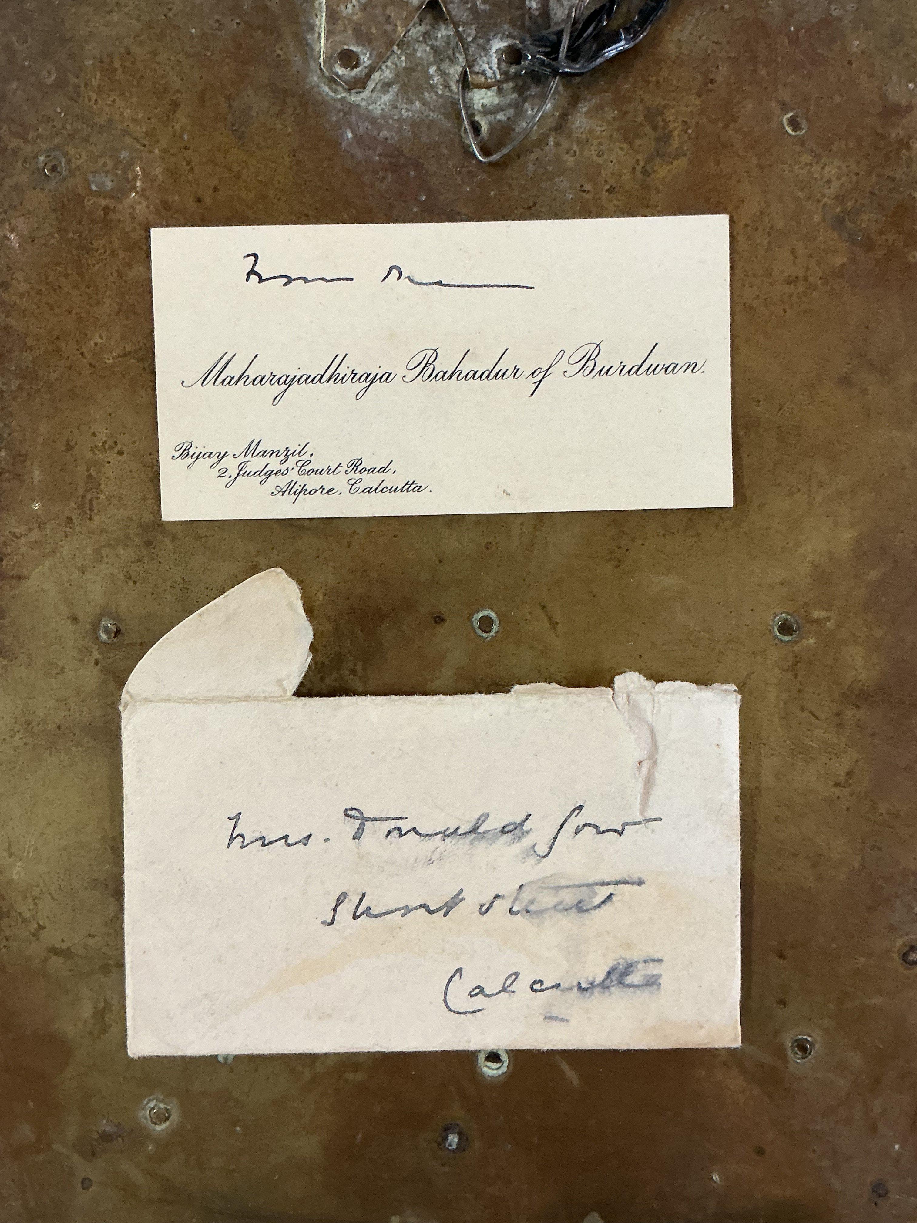 A Gilt Copper Votive Plaque Tibet / Nepal, Late 19th Century Centred by a seated Buddha on lotus base, with all over floral inlaid stone sprays, within a rectangular panel, and floral stone inlaid border. 20cm x 15.4cm. Prov. From the estate of Maharaja Bahadur of Burdwan" refered to as Sir Bijay Chand Mahtab (18811941), gifted to the vendors mother from the Maharaja of Burdwan in 1940 - (see attached gift card ). She said she'd admired it hanging on the wall at his Palace Residence - she first visited there early/mid 1930s. Whilst living, working near by and then married in India and became close to the Maharaja and his family until his death.