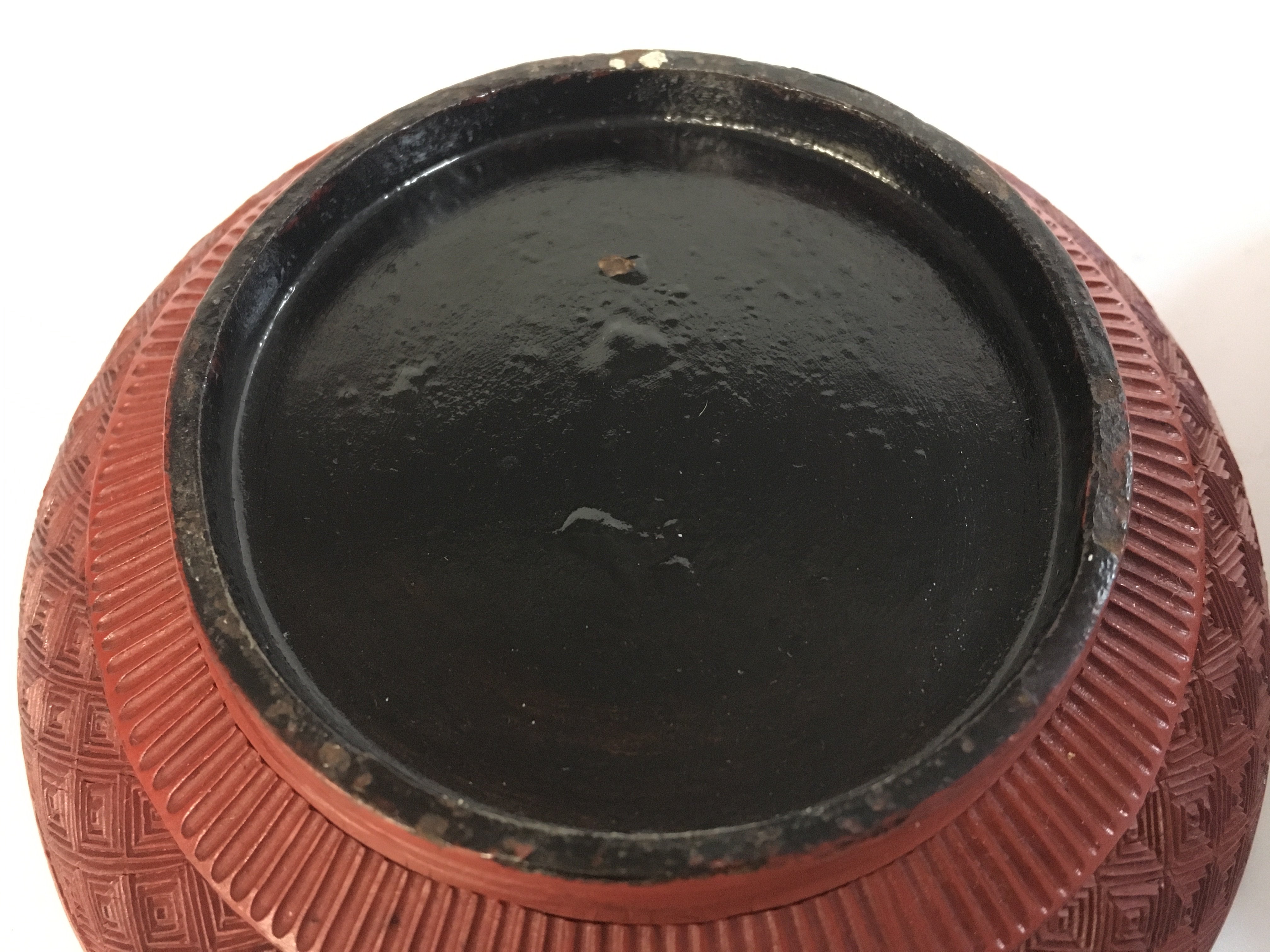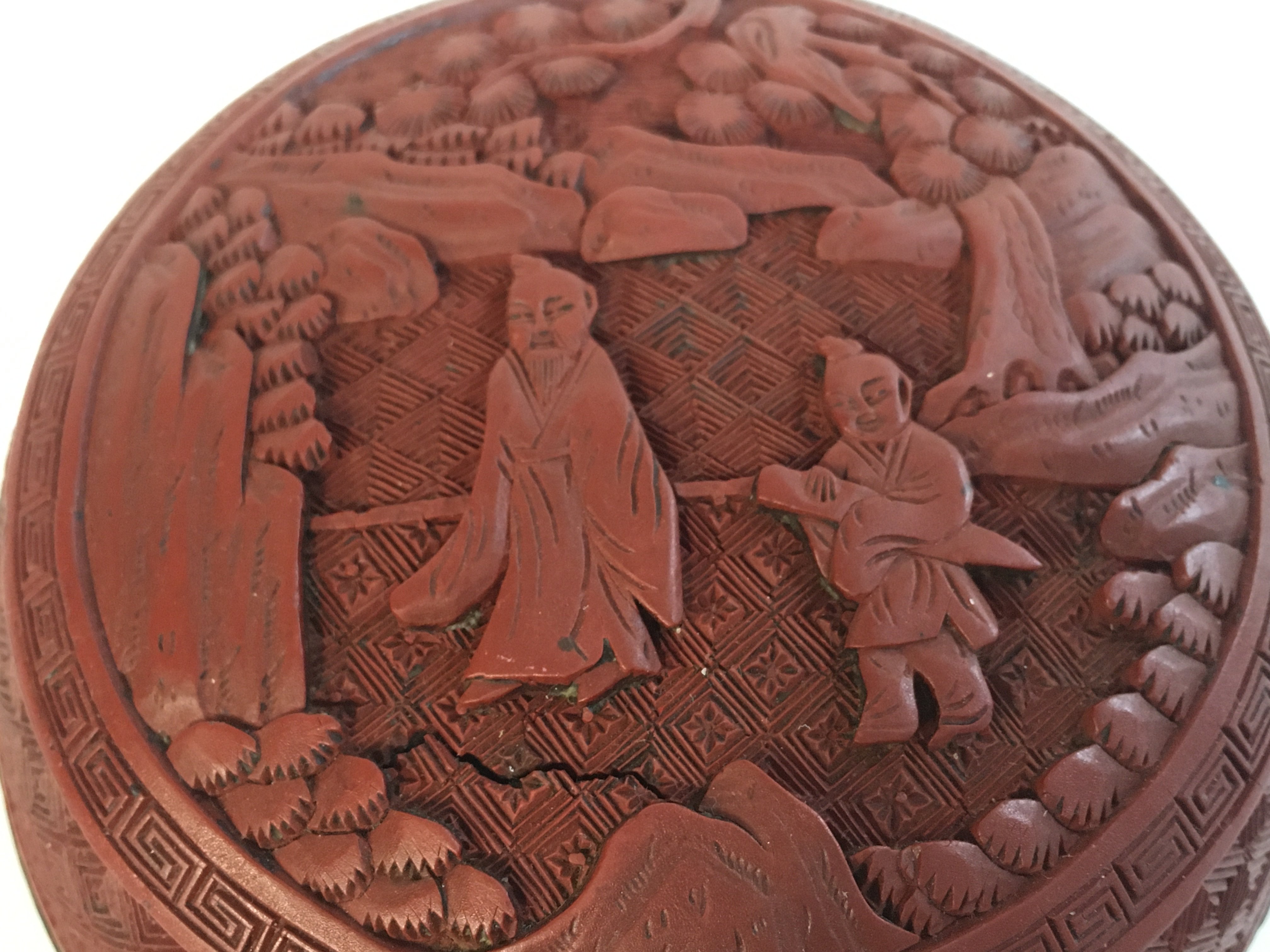 A Chinese red cinnabar round box . 7cm tall. Postage category A