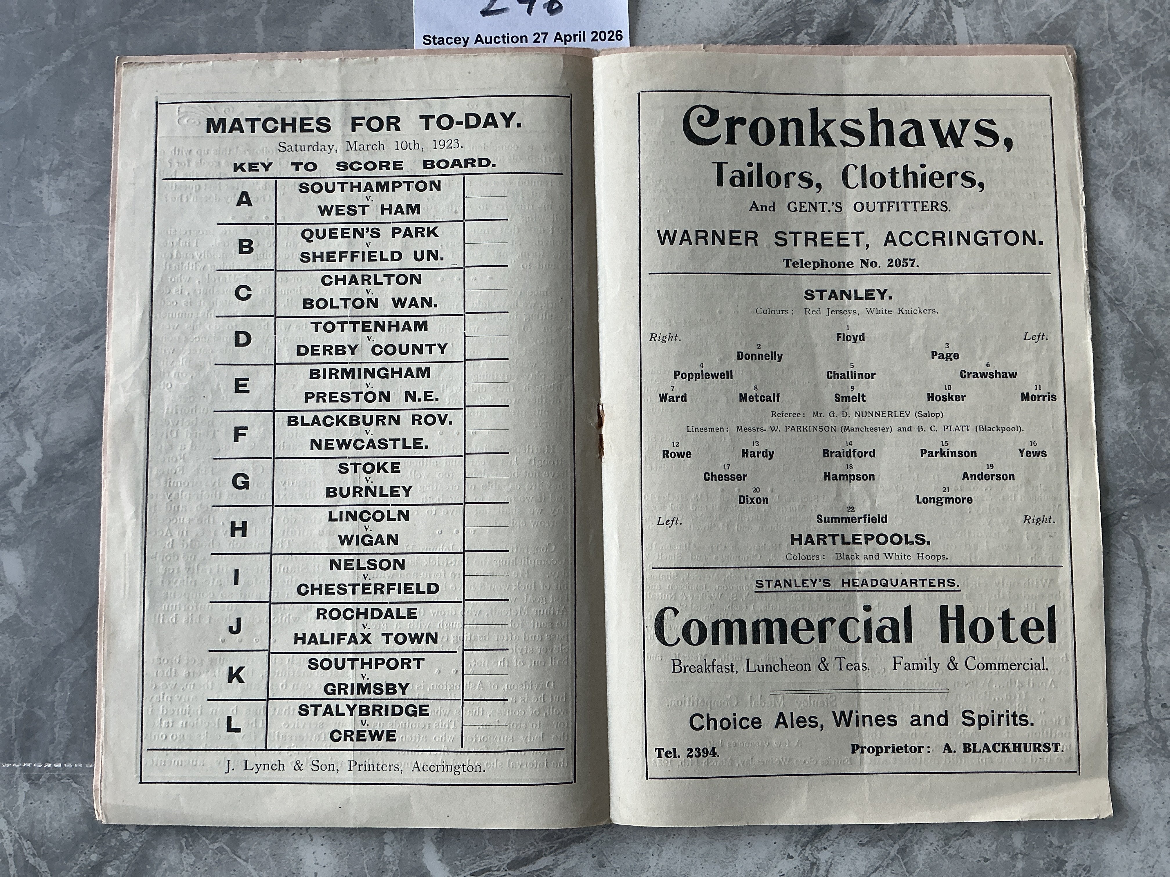 1922 - 1923 Accrington Stanley v Tranmere Football Programme: Good condition with date written to top border. Staple removed. No team changes.