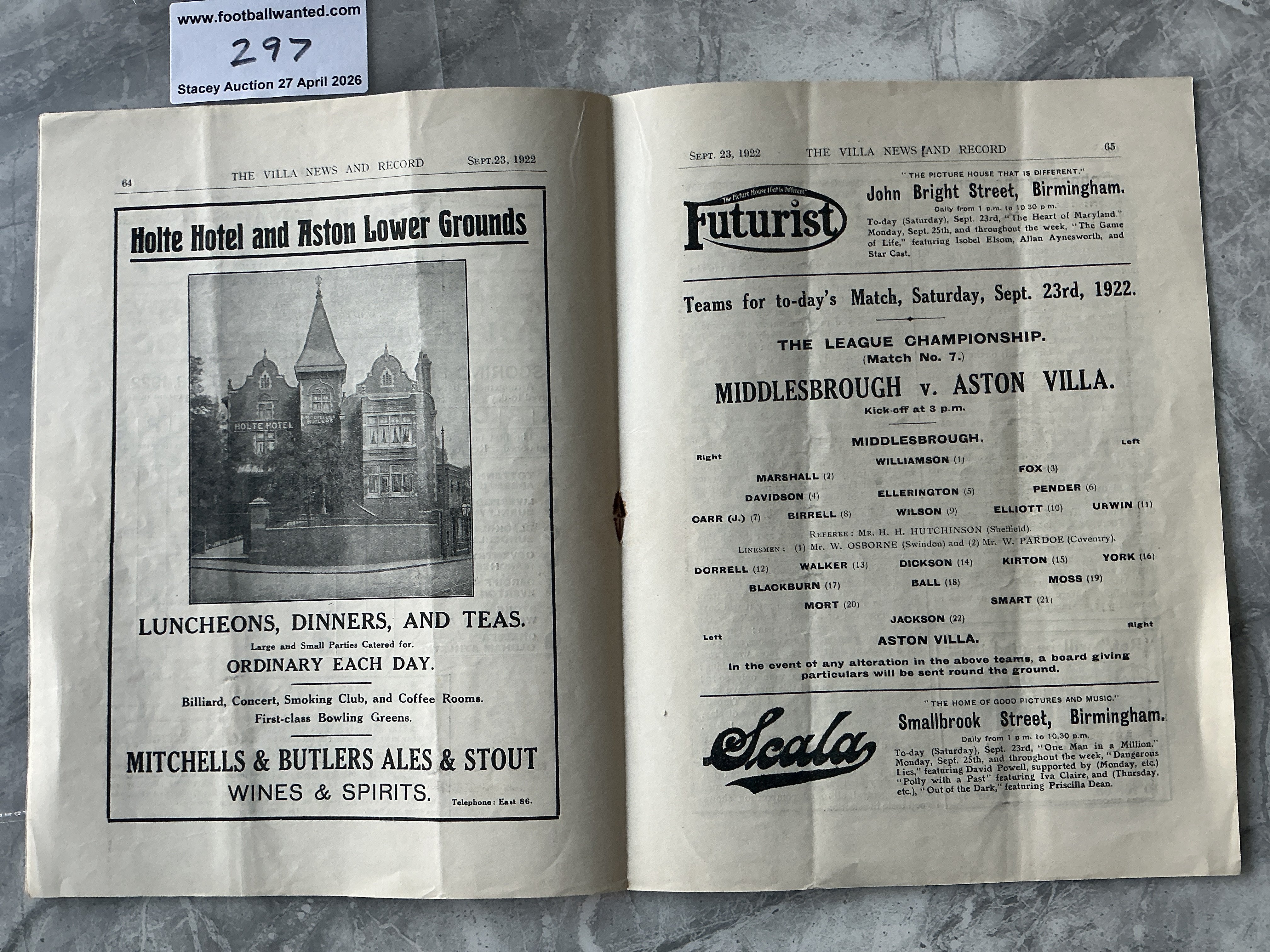 1922 - 1923 Aston Villa v Middlesbrough Football Programme: Good condition with light folding. No team changes.