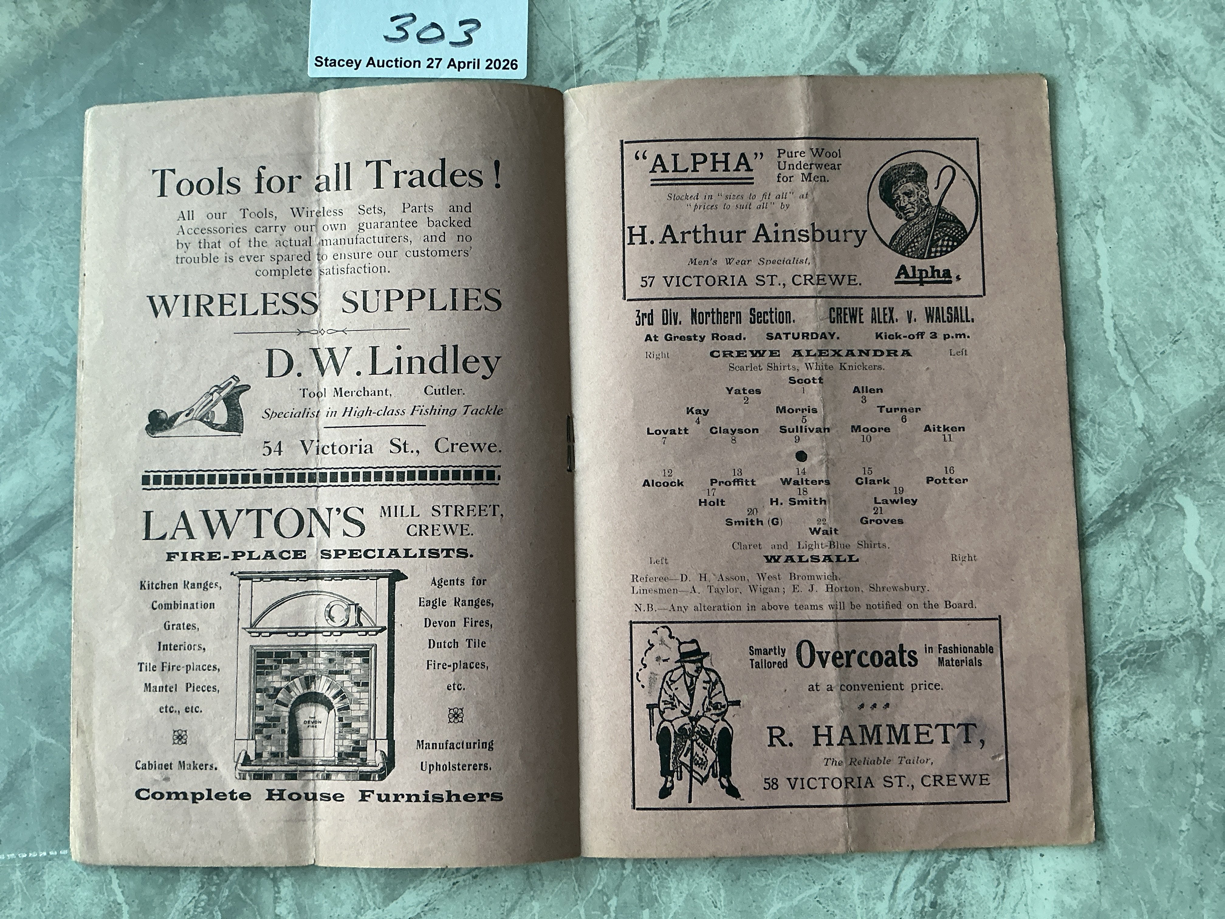 1925 - 1926 Crewe Alexandra v Walsall Football Programme: Good condition with no team changes. Fold.
