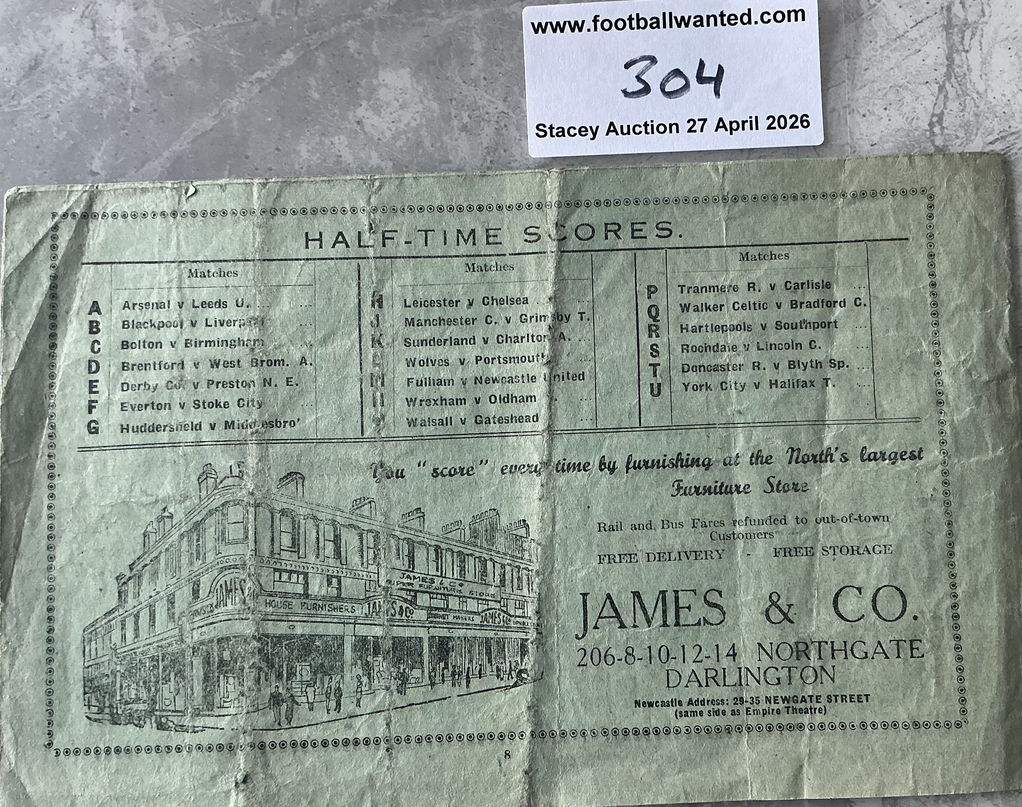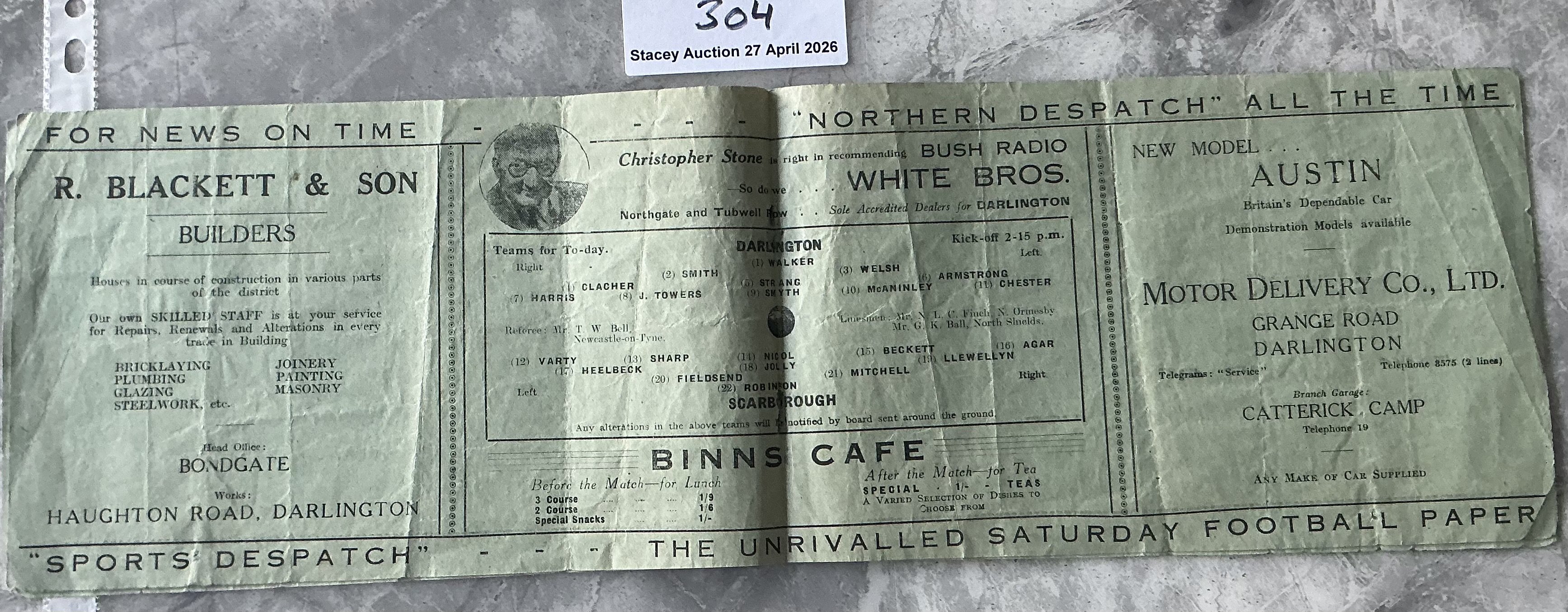 1937 - 1938 Darlington v Scarborough FA Cup Football Programme: Fair/good condition with no team changes. Slight wear to fold at rear.