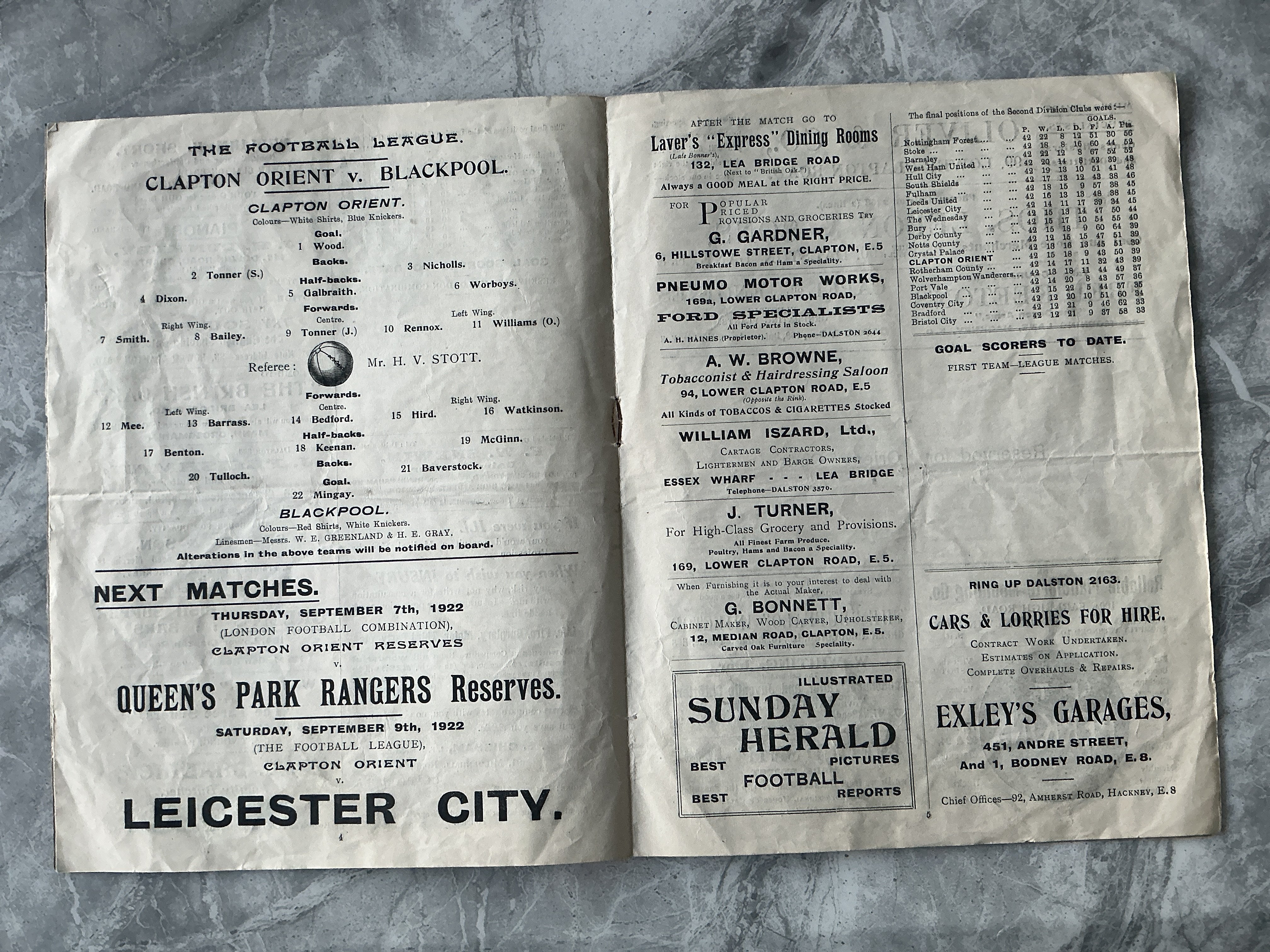 1922 - 1923 Orient v Blackpool Football Programme: Good condition with no team changes. Light fold.