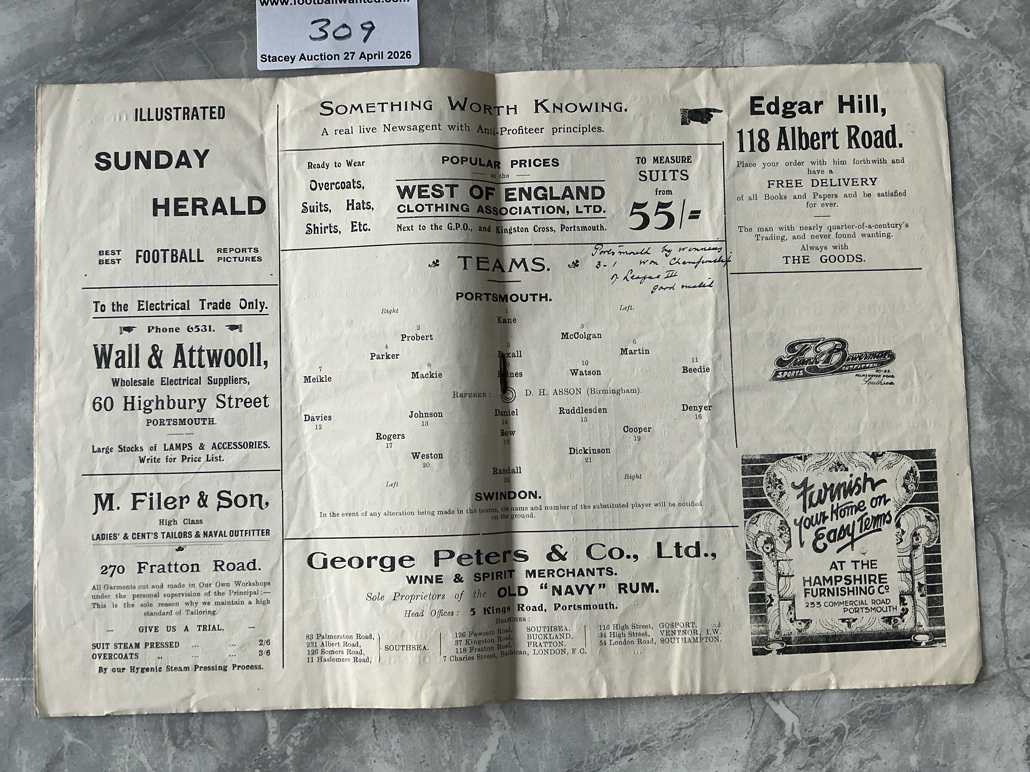 1923 - 1924 Portsmouth v Swindon Football Programme: Good condition with writing to team page