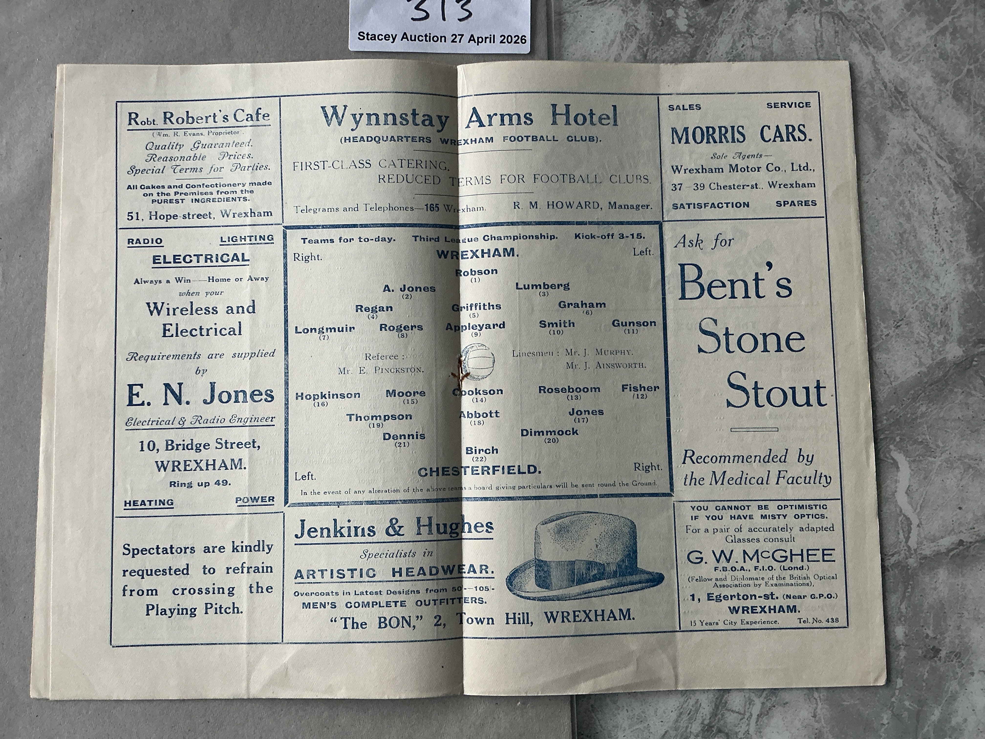 1926 - 1927 Wrexham v Chesterfield Football Programme: Good condition with no team changes. First match of the season 100 years ago. Rare item.