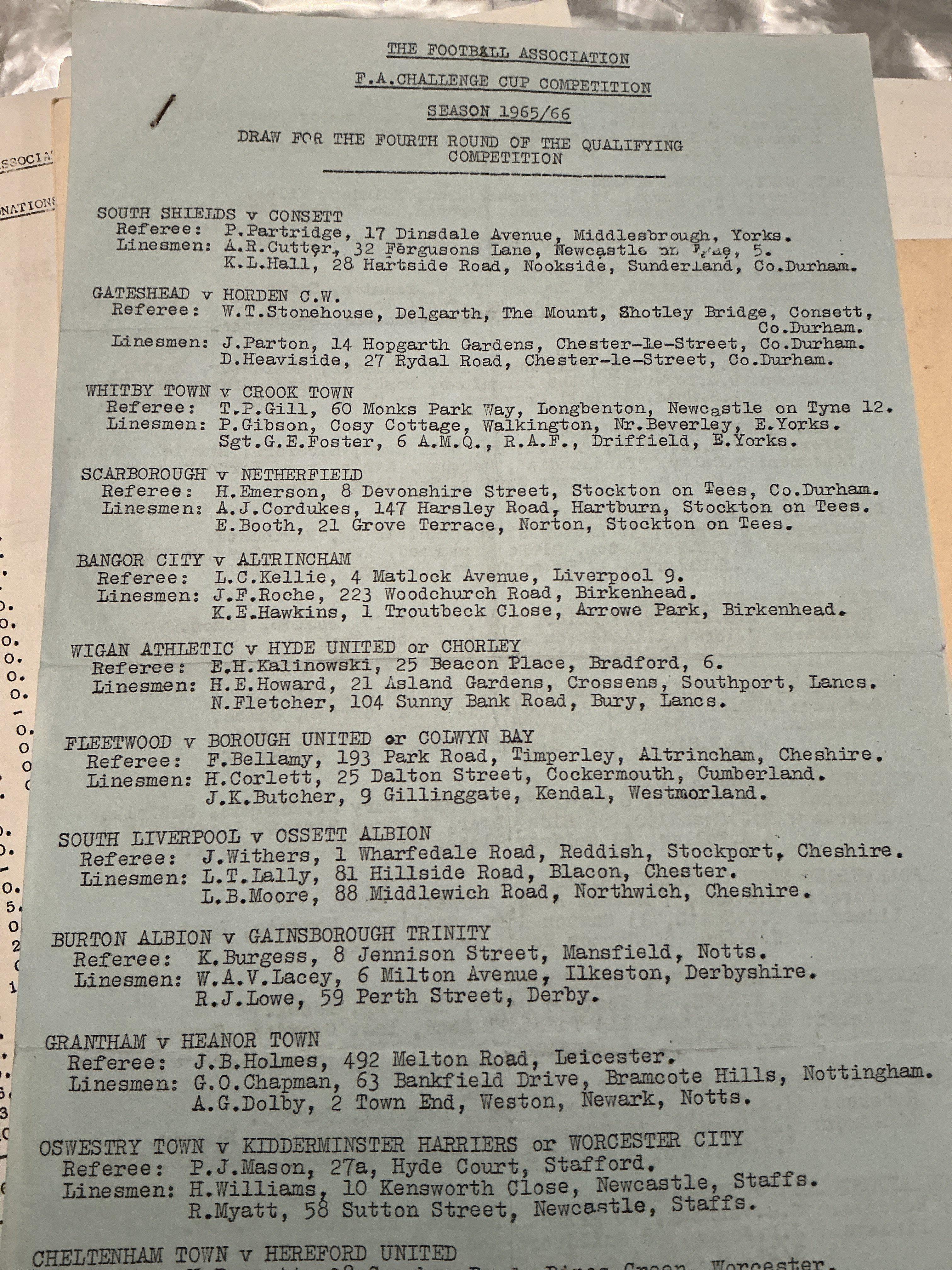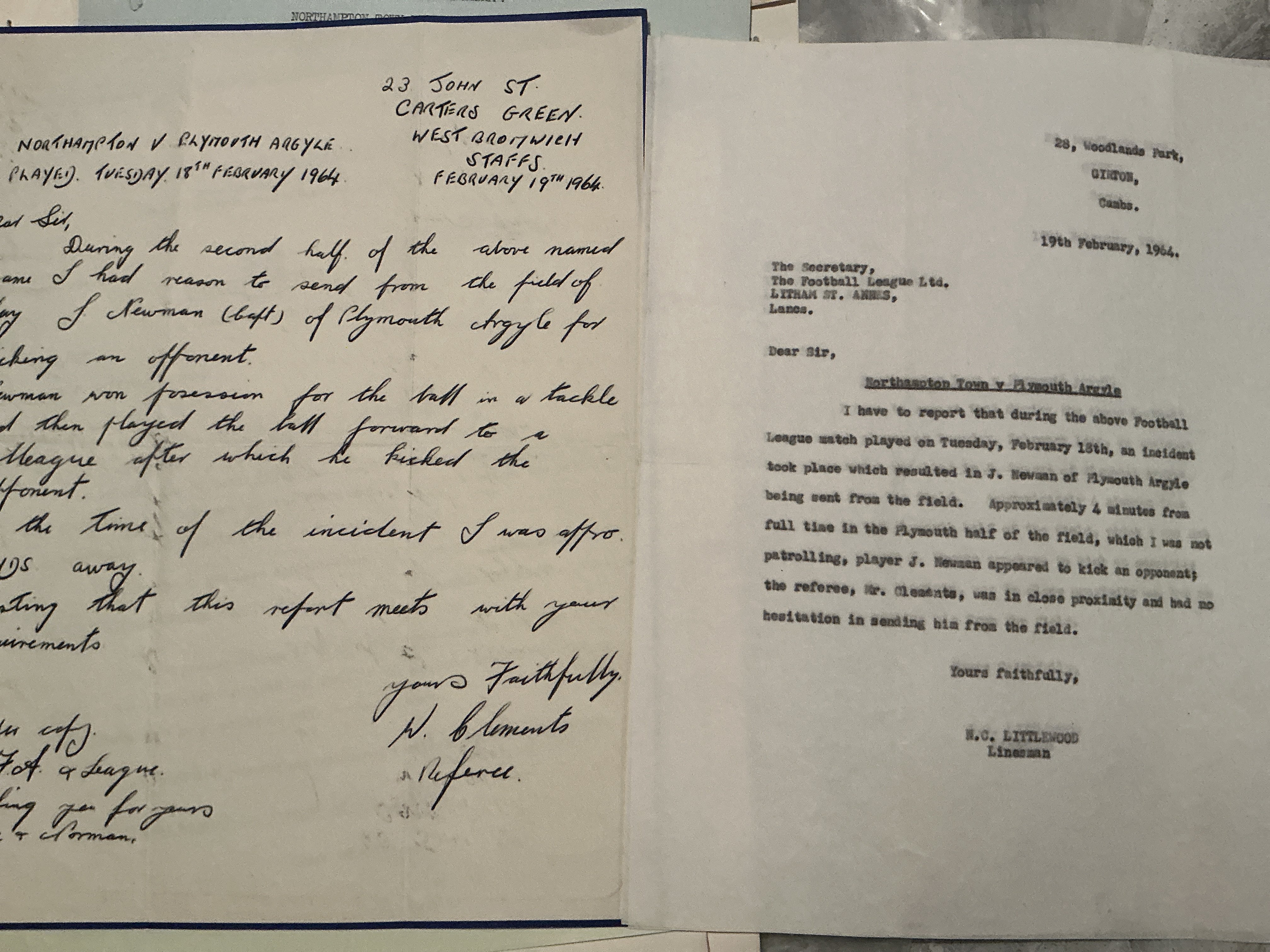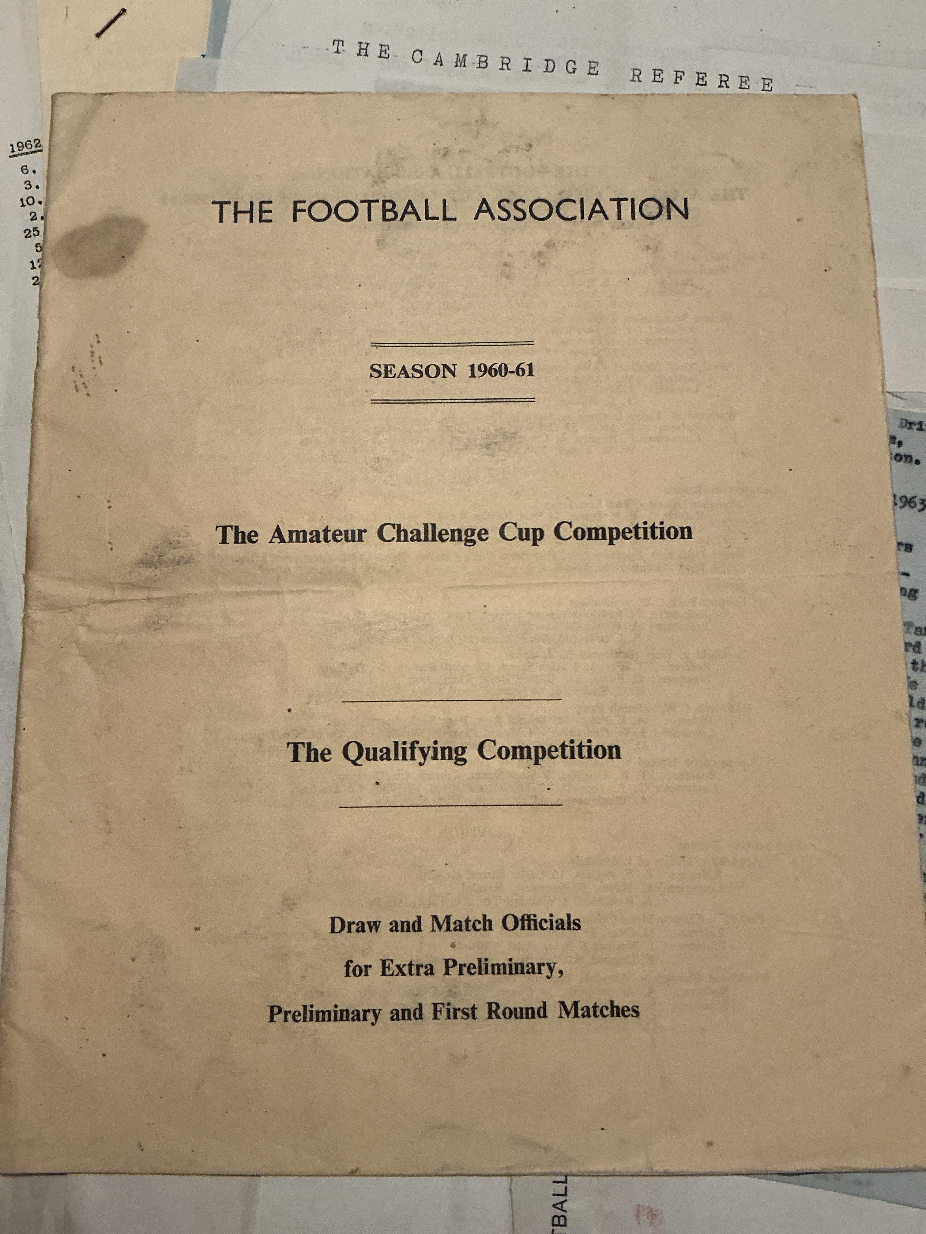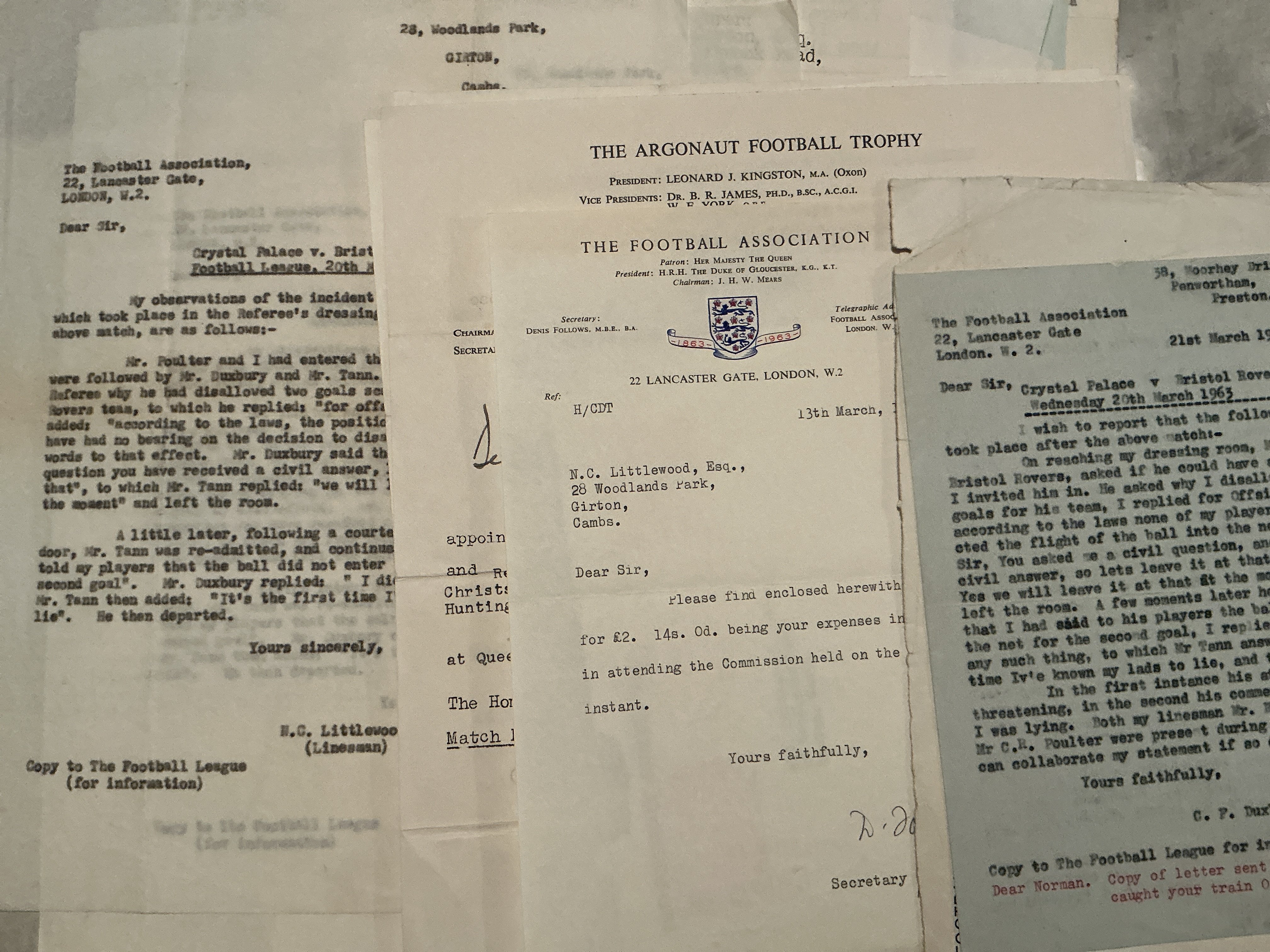 1960s Football Referee Collection: Interesting collection of paperwork collected by Mr Littlewood in the early to mid 60s who was a Football League referee and linesman. Documents include sending off of player 63/64 Northampton v Plymouth, FA Cup and Amateur Cup officials names and addresses for individual matches. His was linesman in the 63/64 Arsenal v Blackpool match and there are two press photos of the teams lining up to observe a minutes silence with officials programme and more. Interesting.