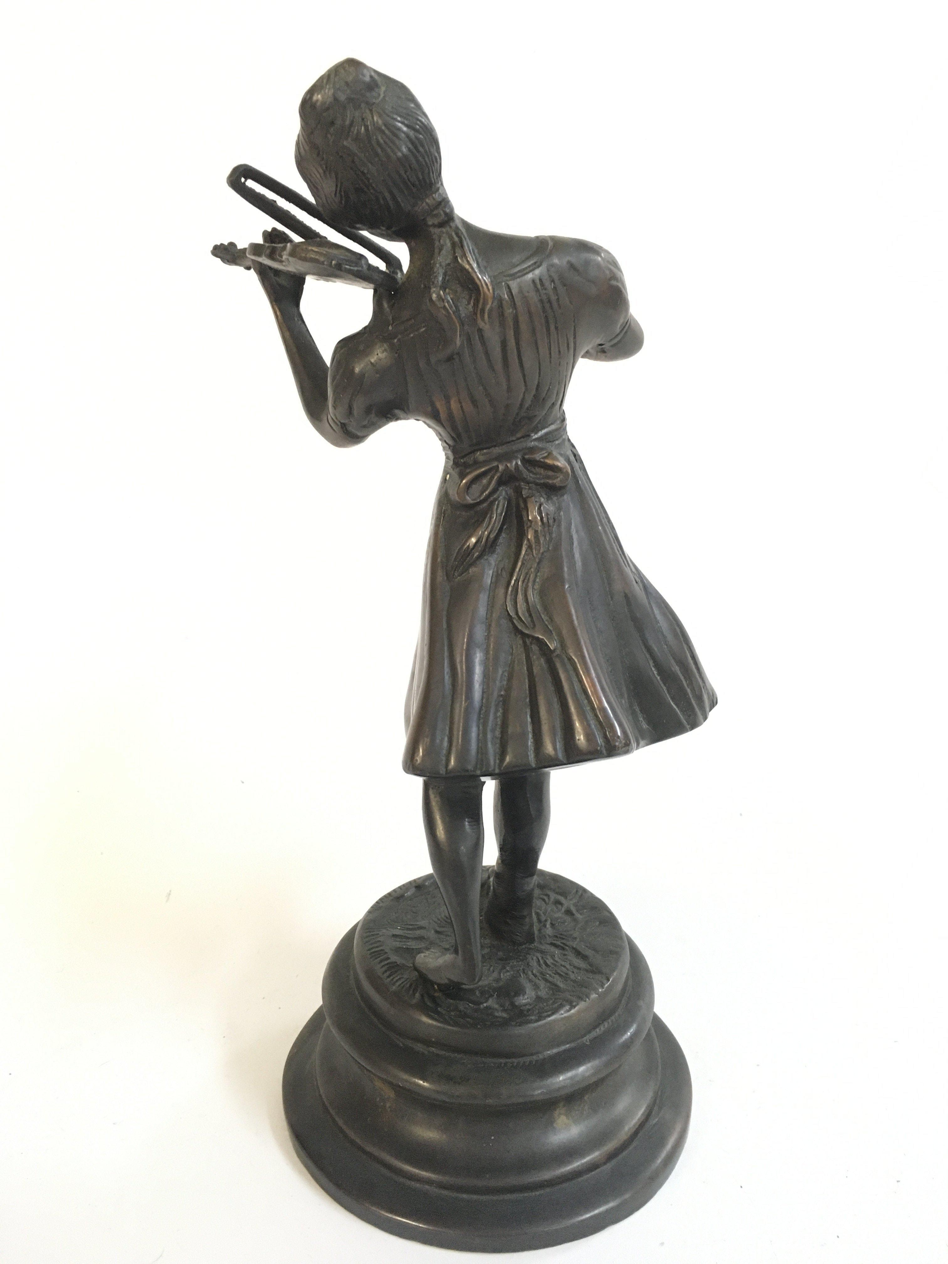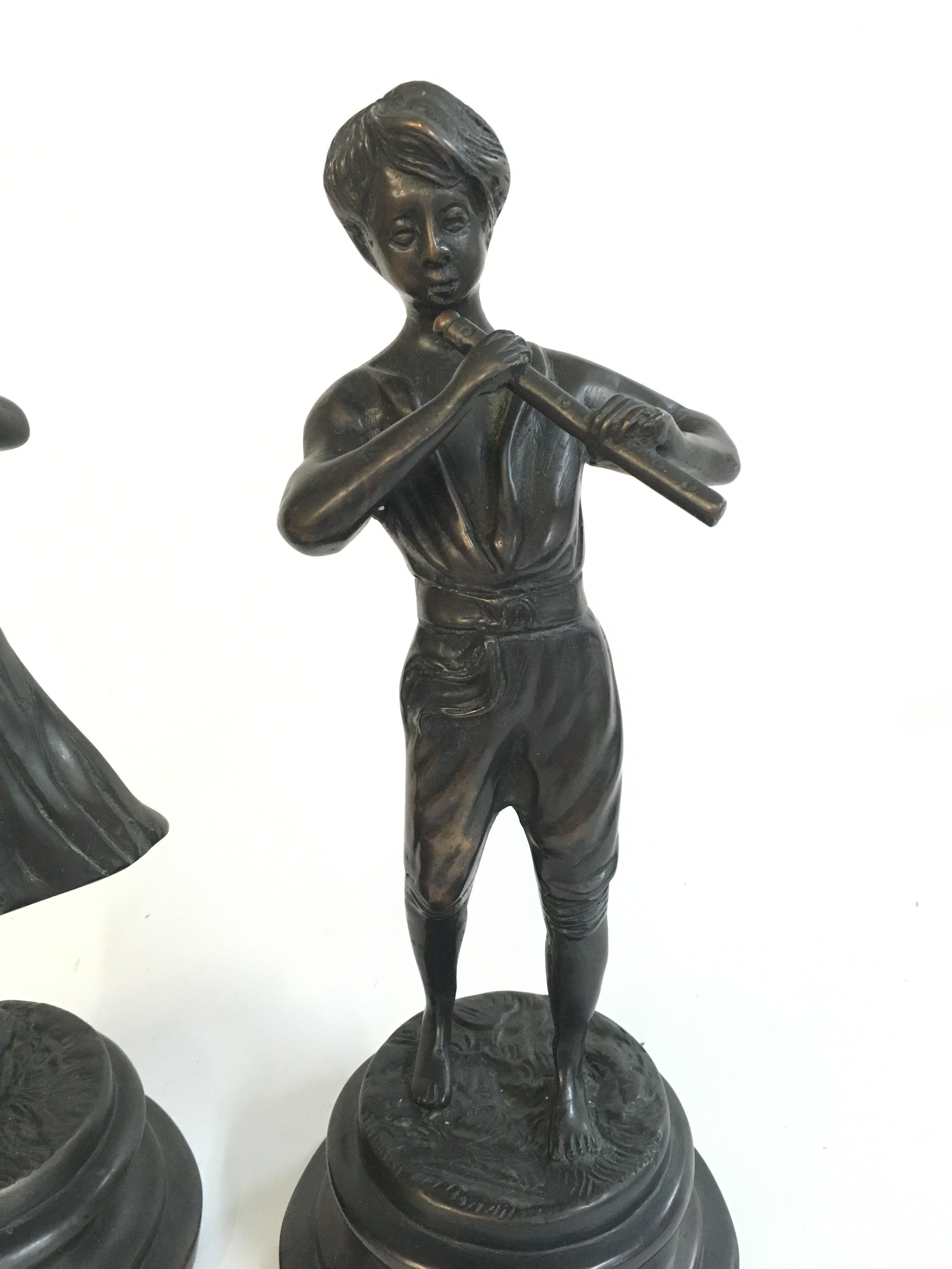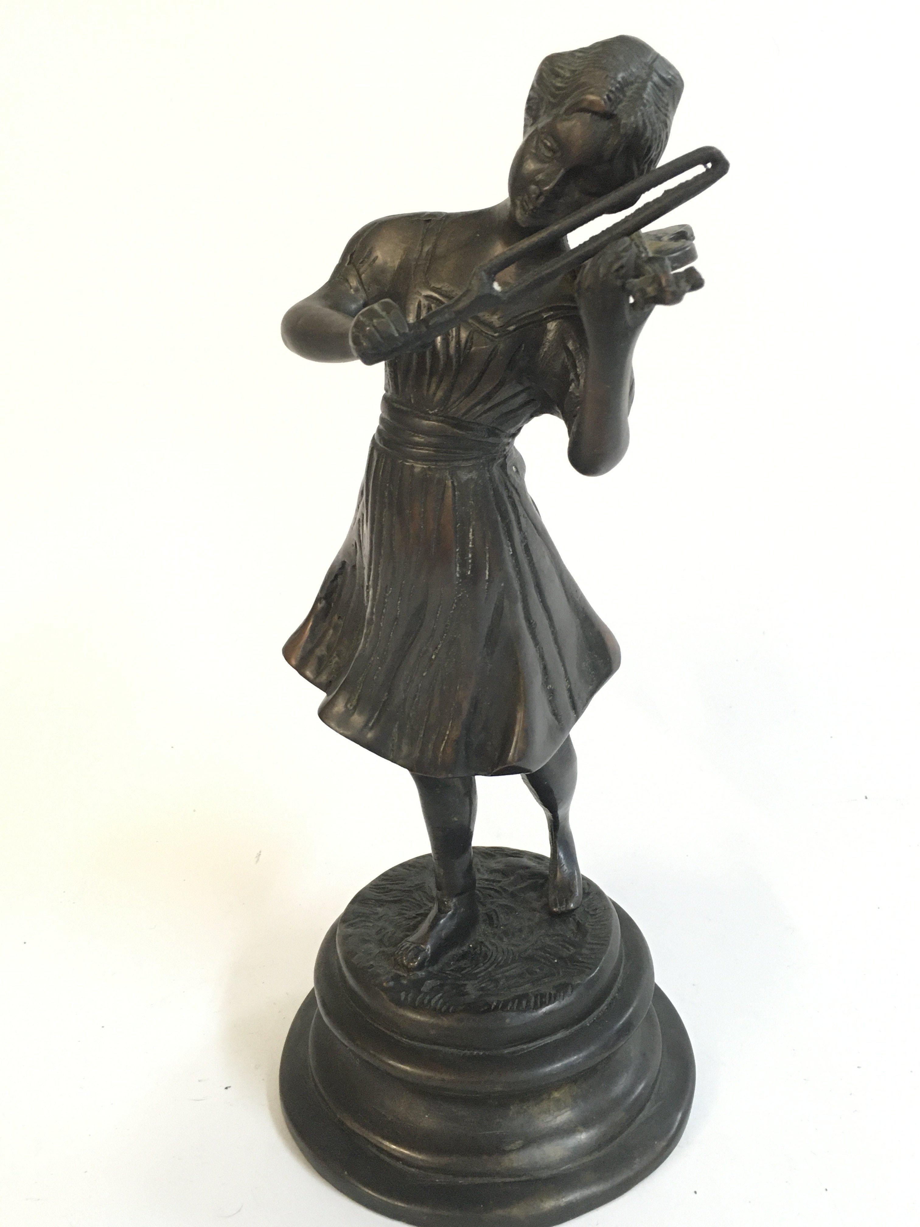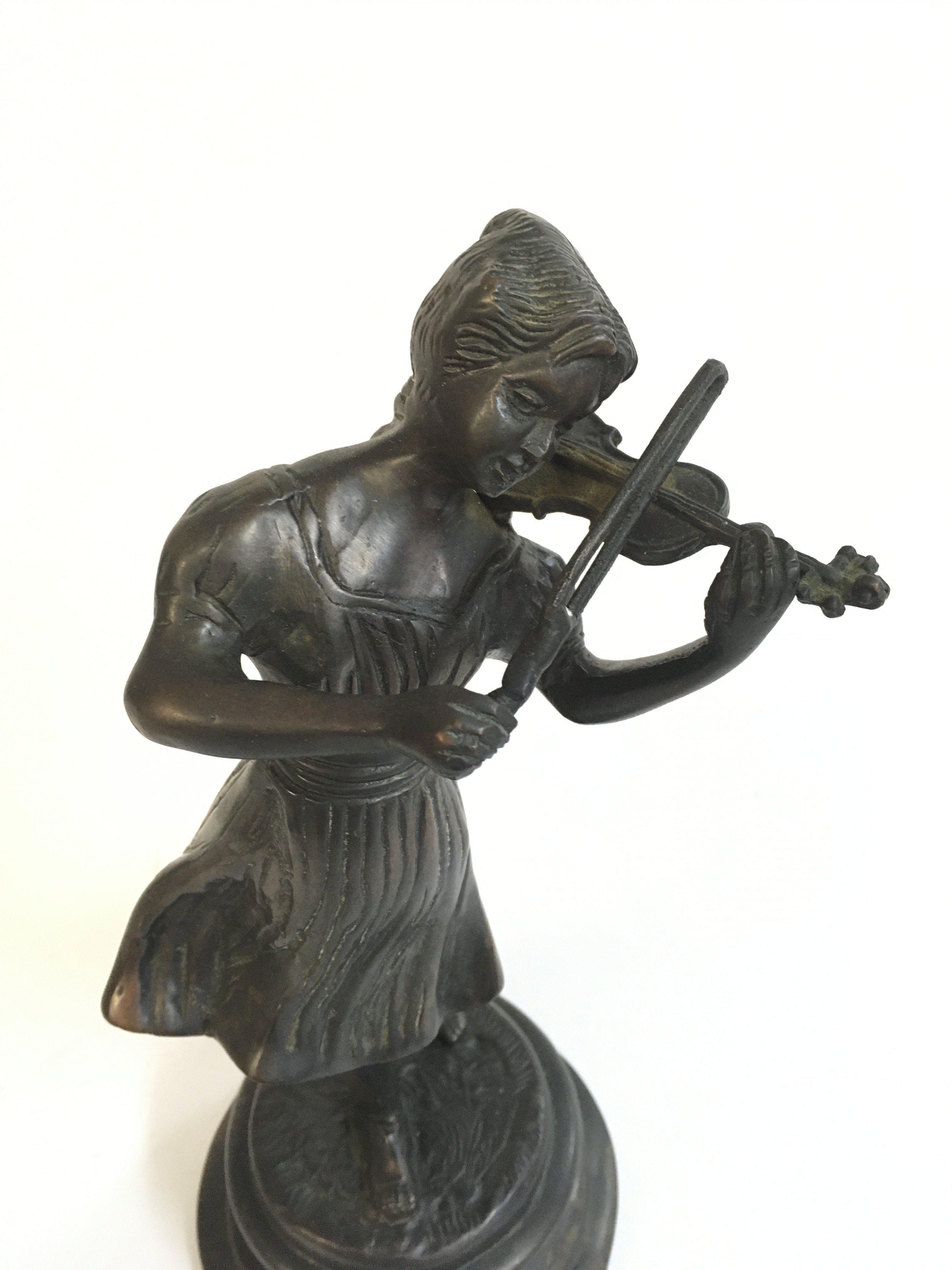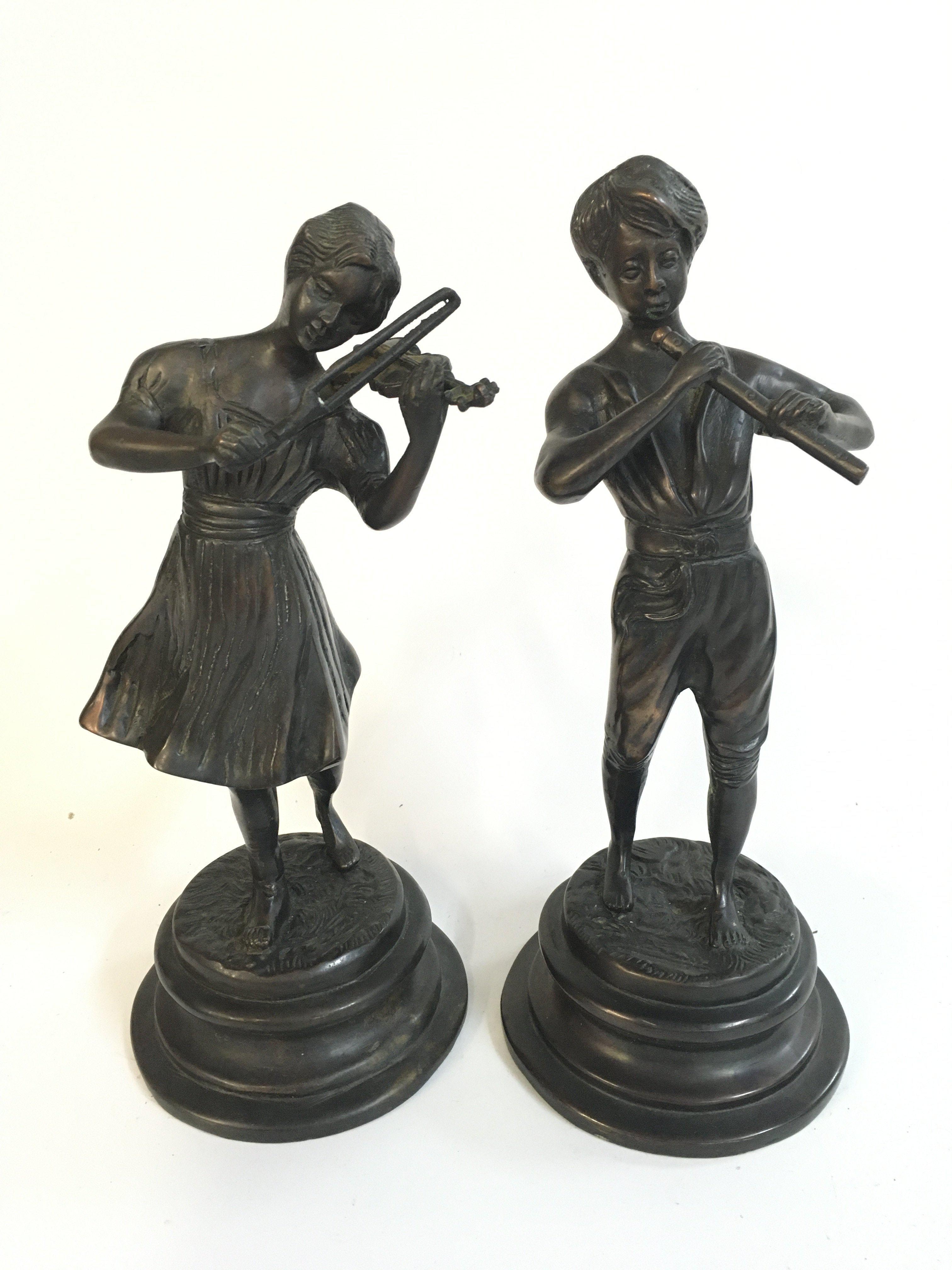 A bronze pair of figures a girl playing a violin and boy with flute , 25cm tall. Postage category c