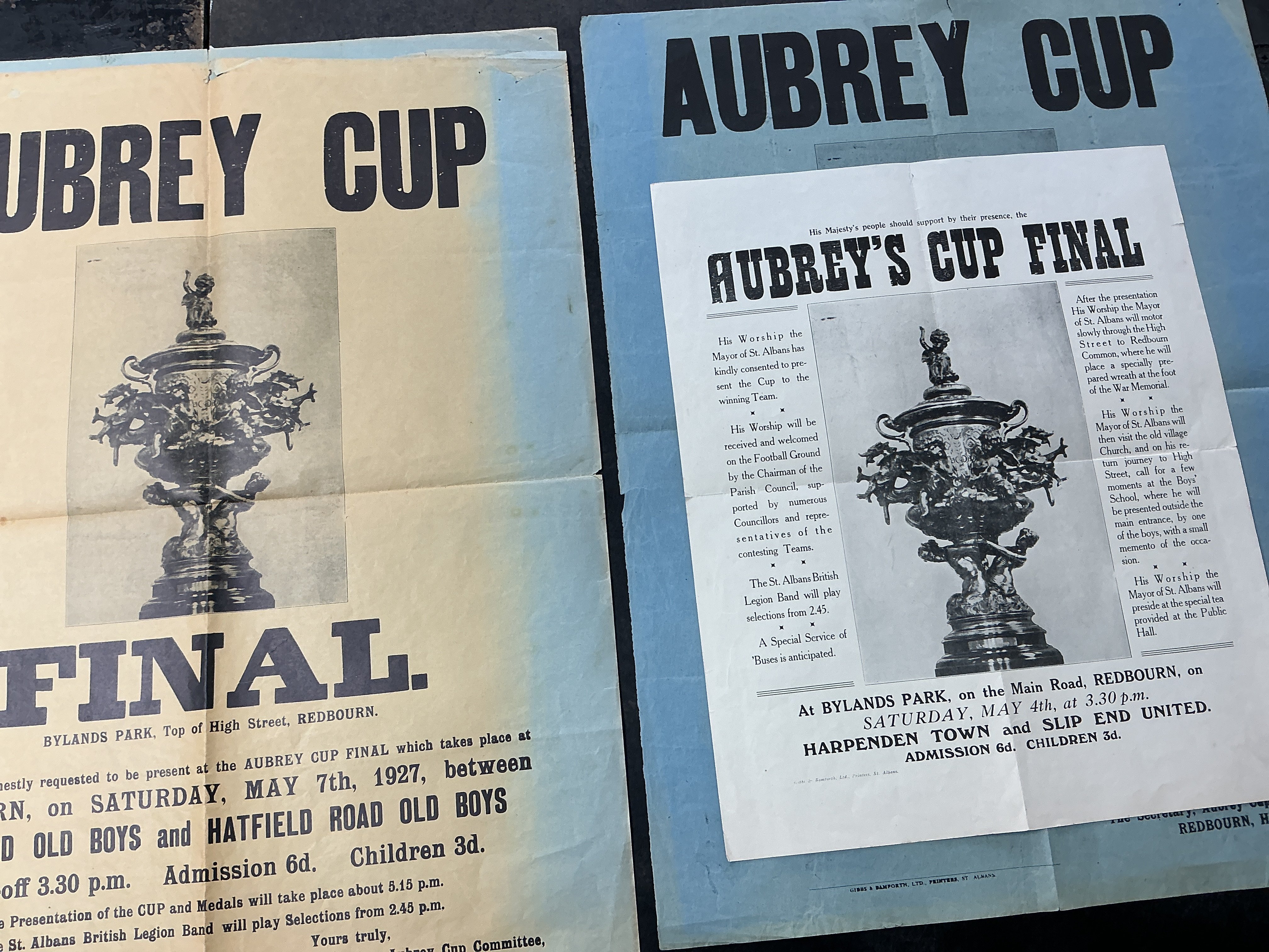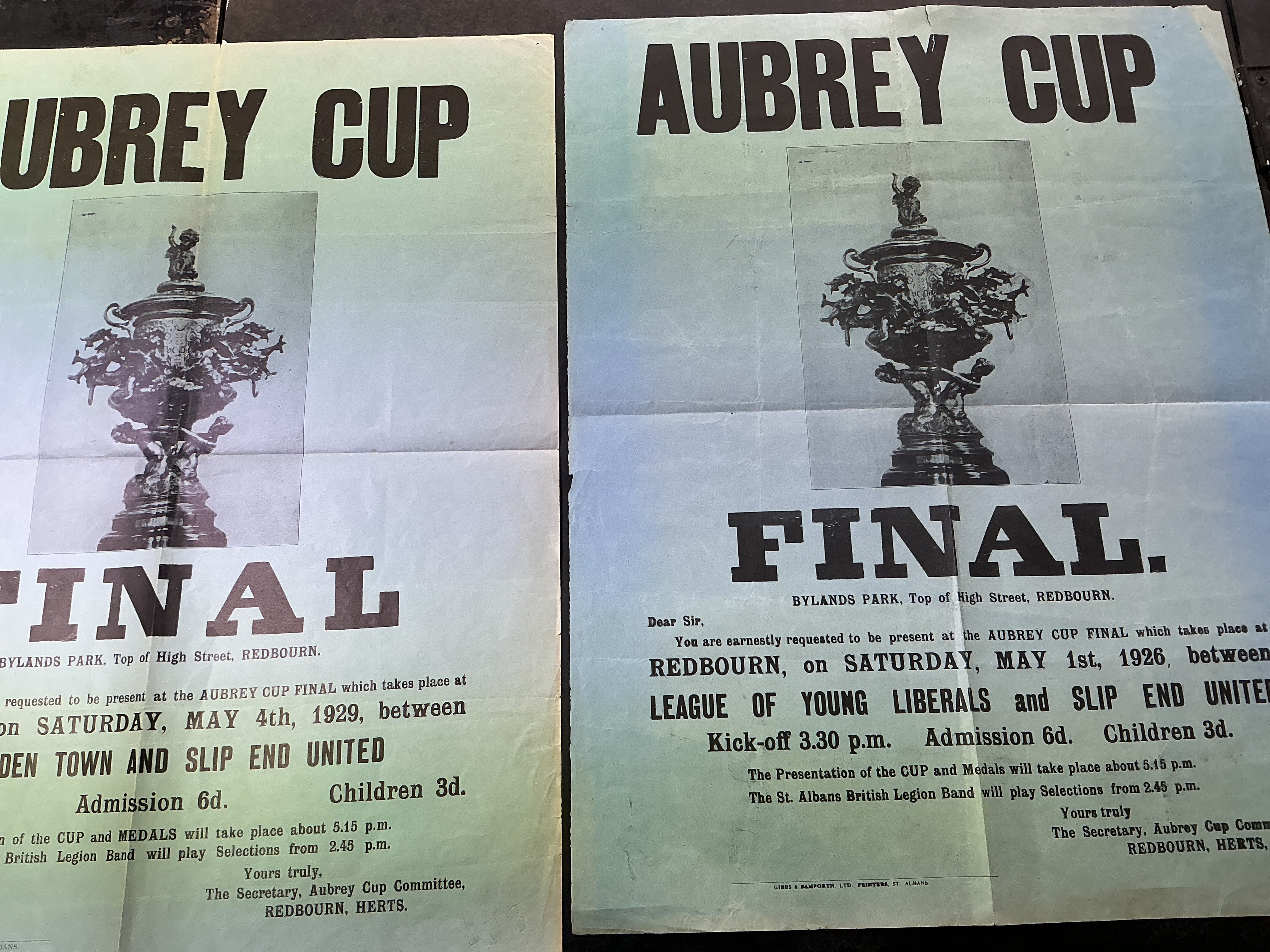 1920s Hertfordshire Football Posters: Aubrey Cup finals through the 1920s to include Harpenden Town, Slip End United, Young Liberals, Batford Old Boys and Hatfield Road Old Boys. (4 posters)