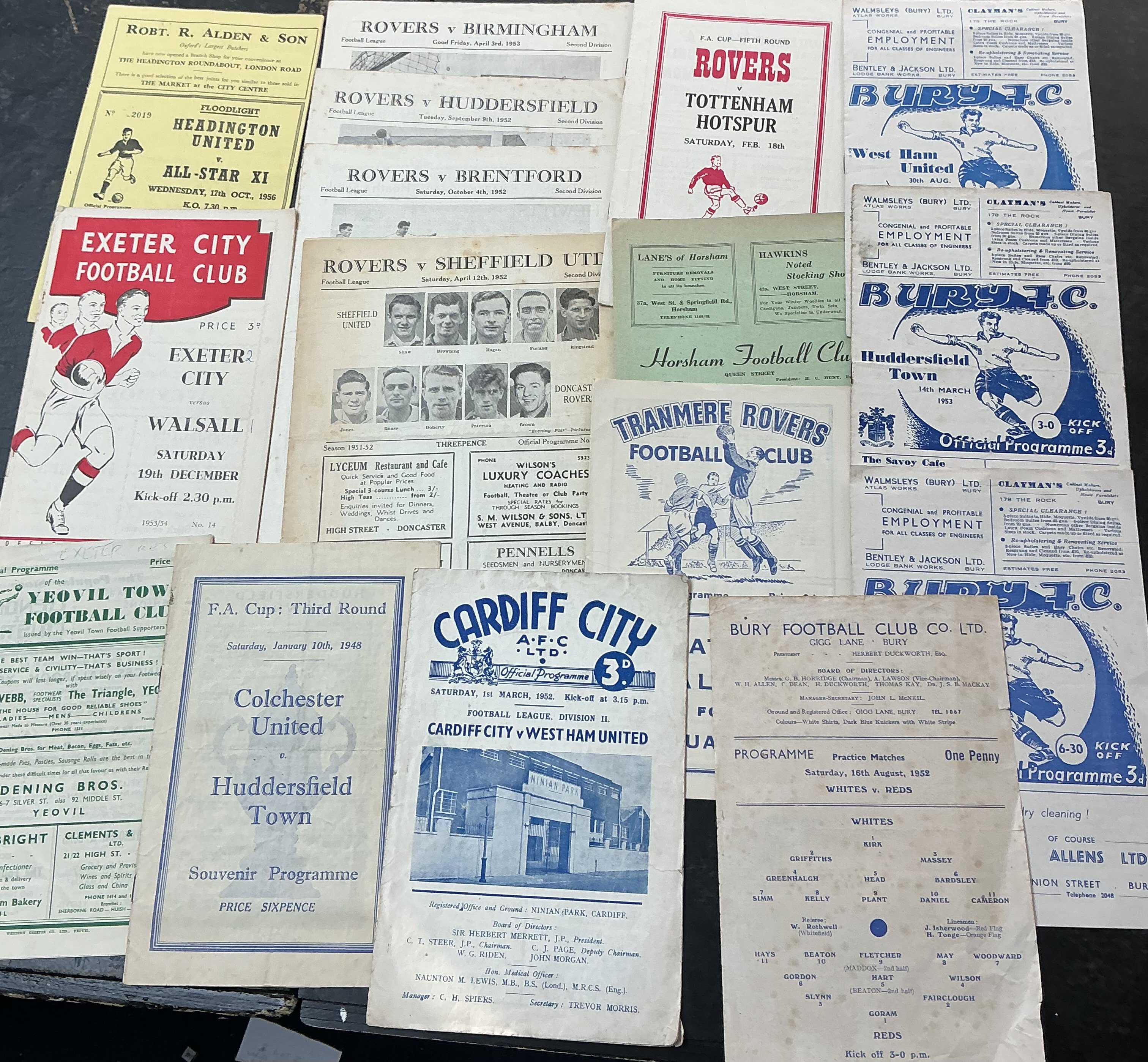 1940s Football Programmes: 42/43 Walthamstow v St Albans, 46/47 47/48 + 48/49 Chelmsford v Exeter Reserves, 49/50 Bradford Park Avenue v Preston, 47/48 Weymouth v Poole, Yeovil v Exeter Reserves, Colchester v Huddersfield FA Cup, 45/46 Northampton v Swindon, 45/46 Crystal Pace v Swindon, 1946 Fulham Practice Match. Additionally there are some early 50s to include 56/57 Headington v All Stars, 52/53 Bury Practice Match, West Ham, Leeds, Huddersfield, Doncaster homes and more. (32)