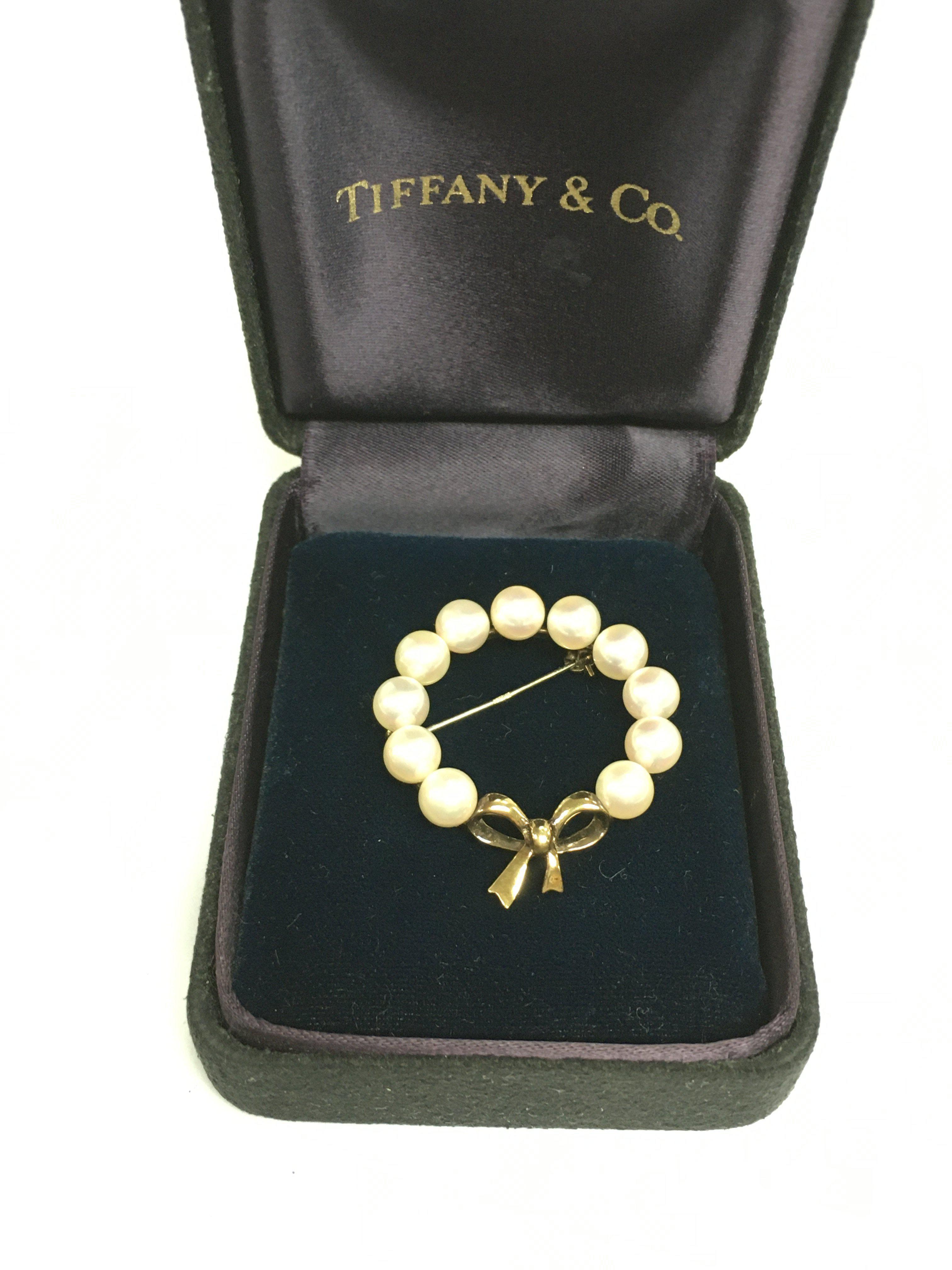 A boxed and fully hallmarked Tiffany & Co 18ct gold and pearl brooch, approx 6.7g. Shipping category A.