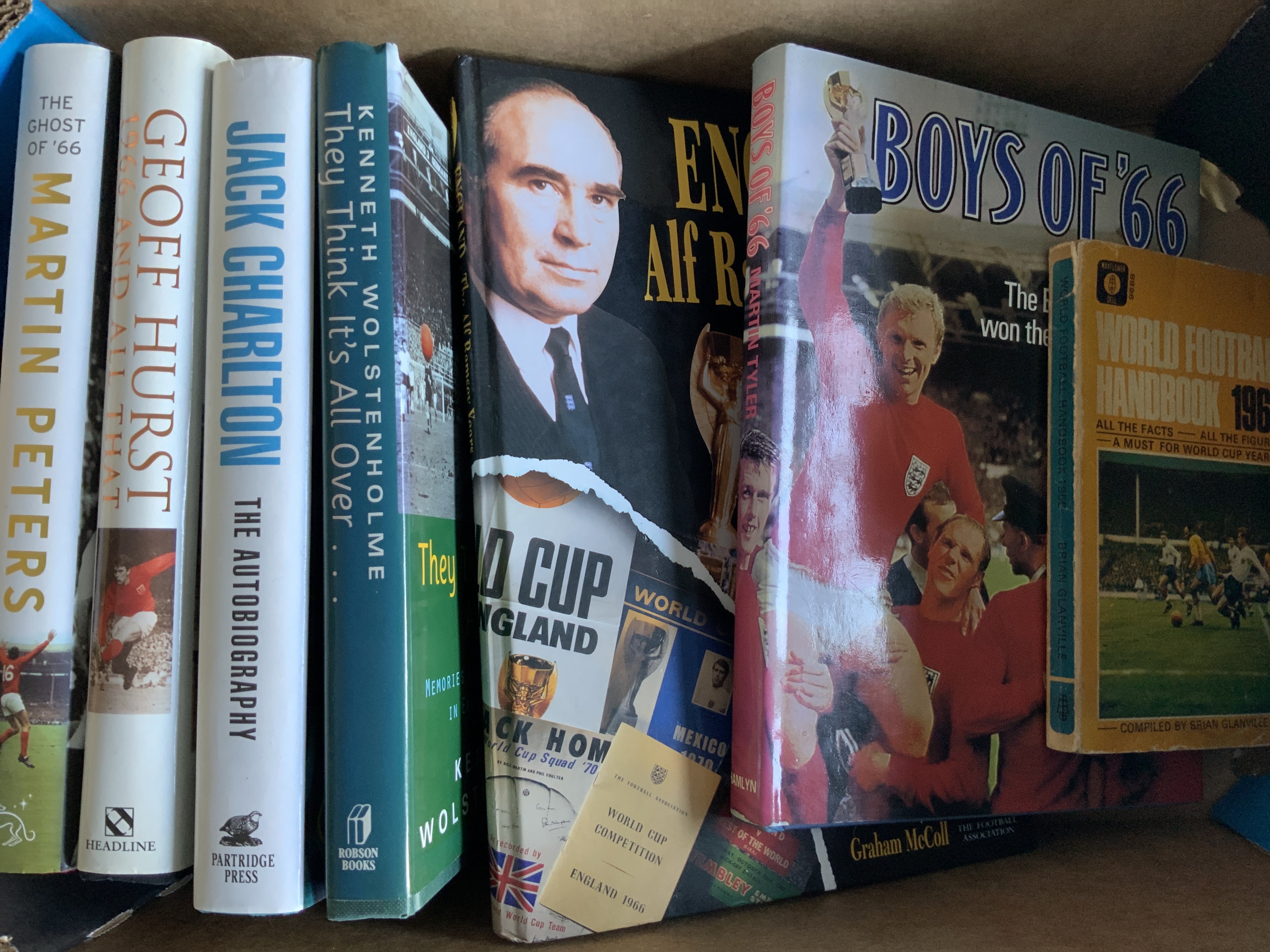 1966 World Cup Football Memorabilia: Some nice books and autobiographies of England players including signed dedicated Hurst, magazines and a tournament brochure. A few lesser condition items including ticket from Goodison Park, Ticket information, England player Typhoo cards and more.