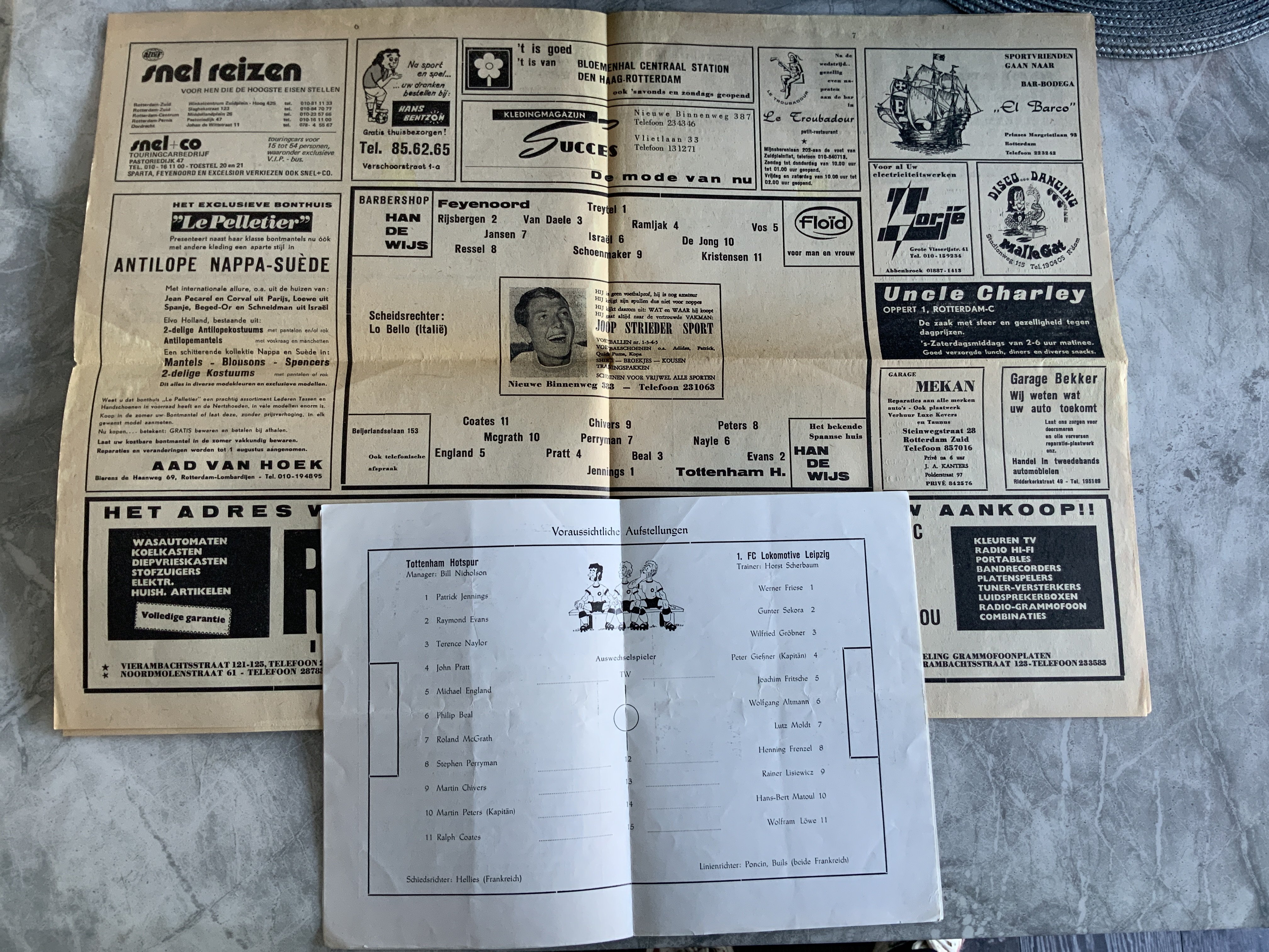 1974 Tottenham Away UEFA Cup Football Programmes: Harder to obtain final De Sportgids newspaper style programme v Feyenoord in good condition with no team changes. C/W away programme at Leipzig with fold. (2)