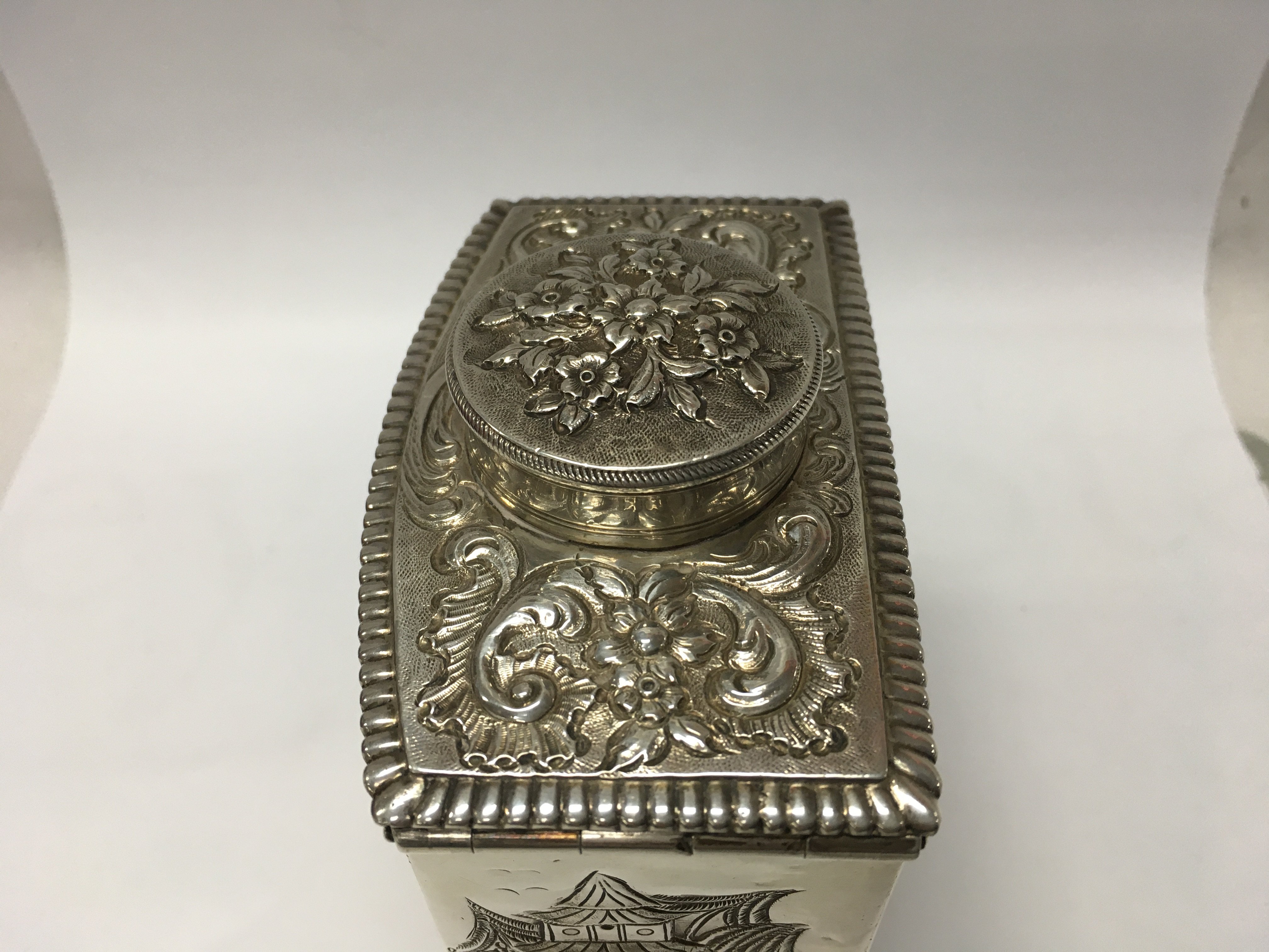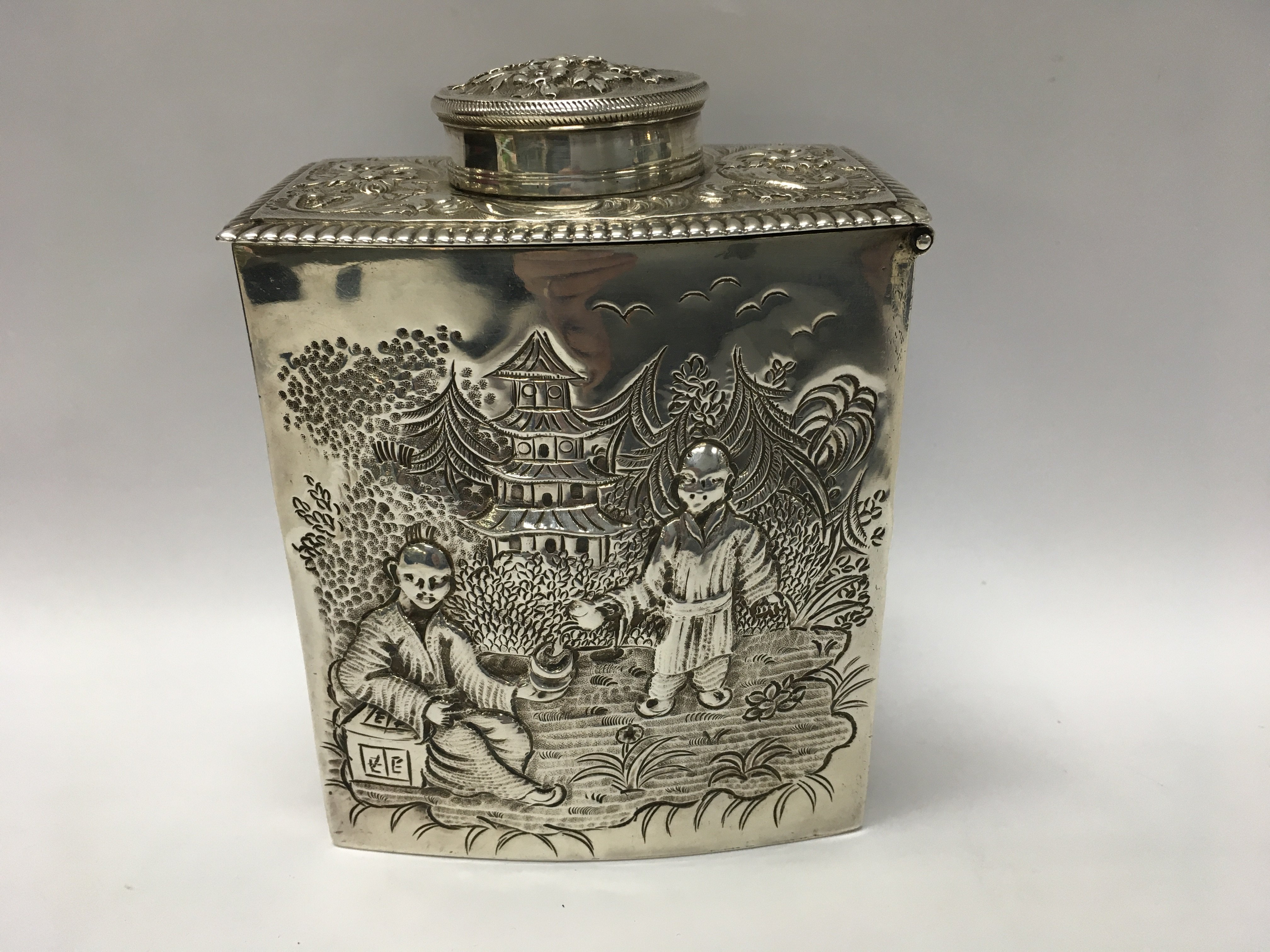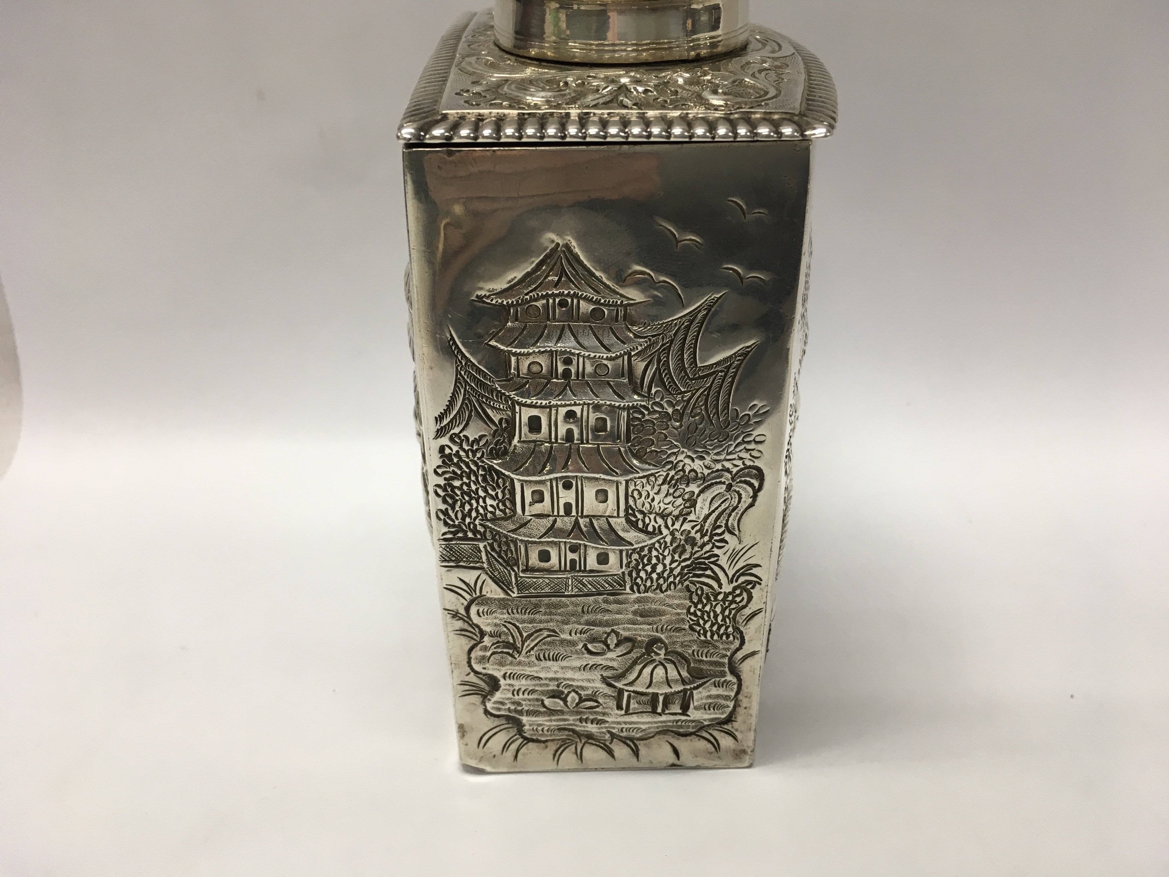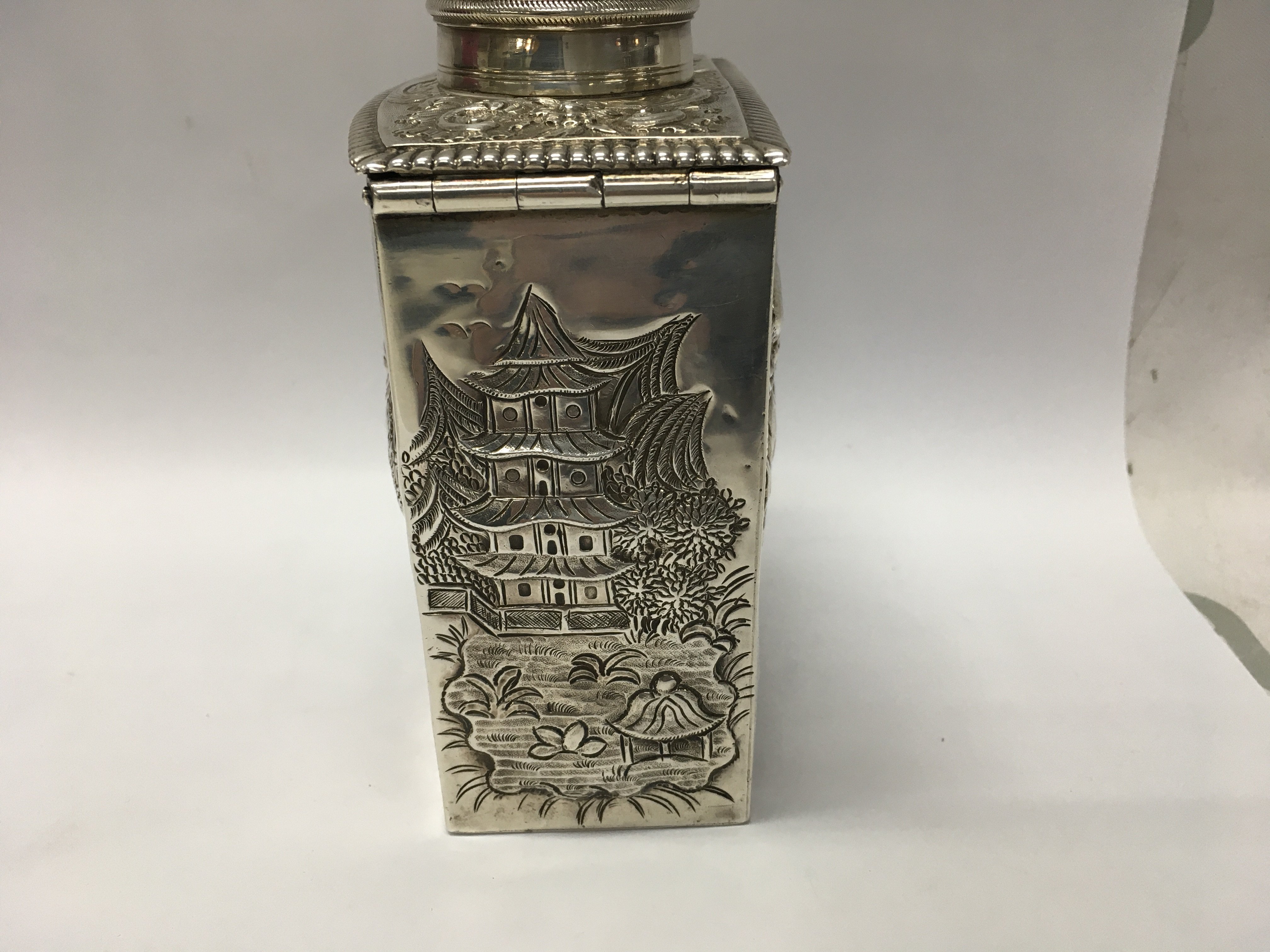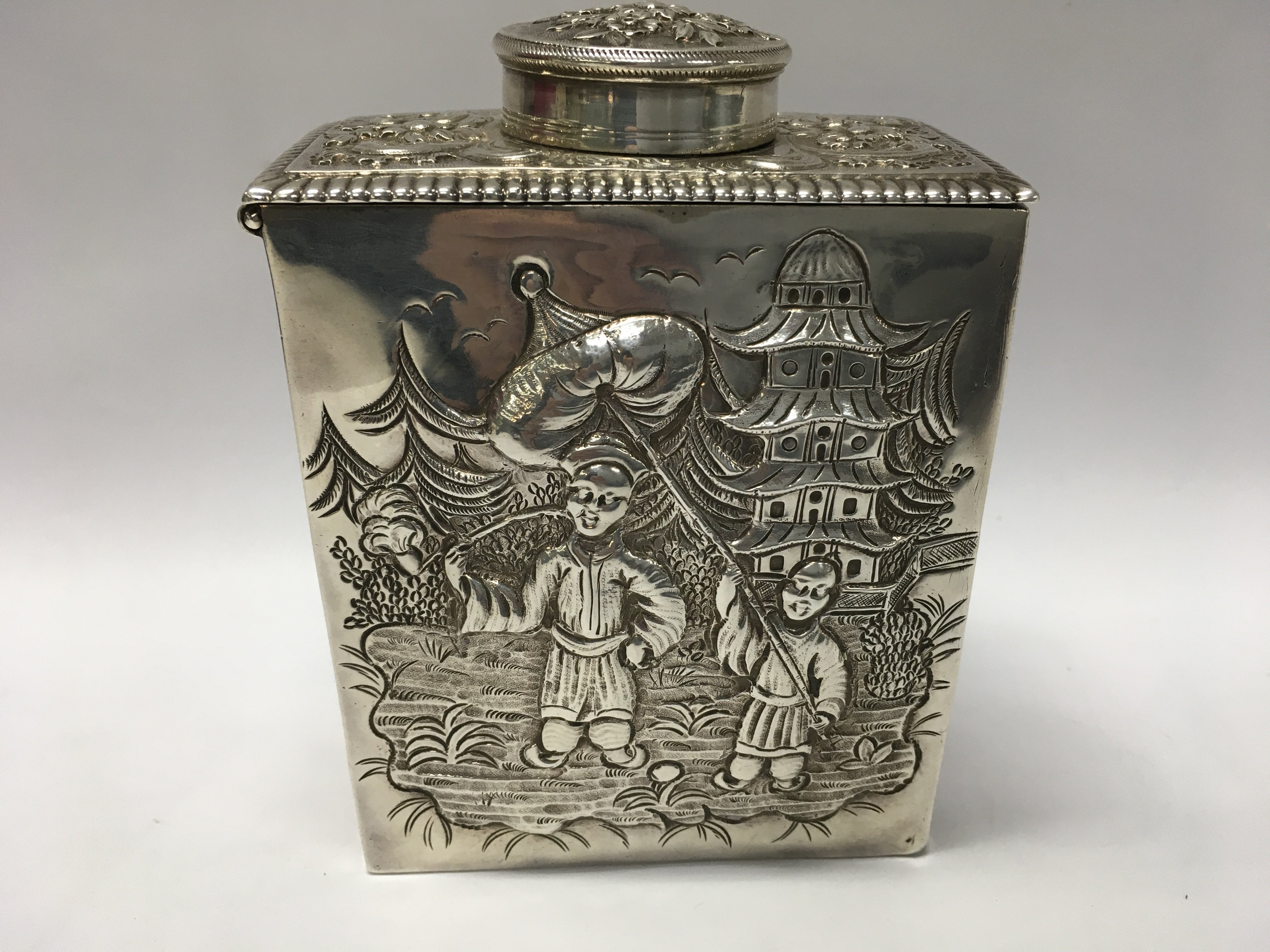 A Georgian silver tea caddy of rectangular form featuring detailed oriental scenes to the four sides depicting figures pagoda flowers and foliage 11 cm dated 1766 London maker Pierre Gilloils , 317 grams.