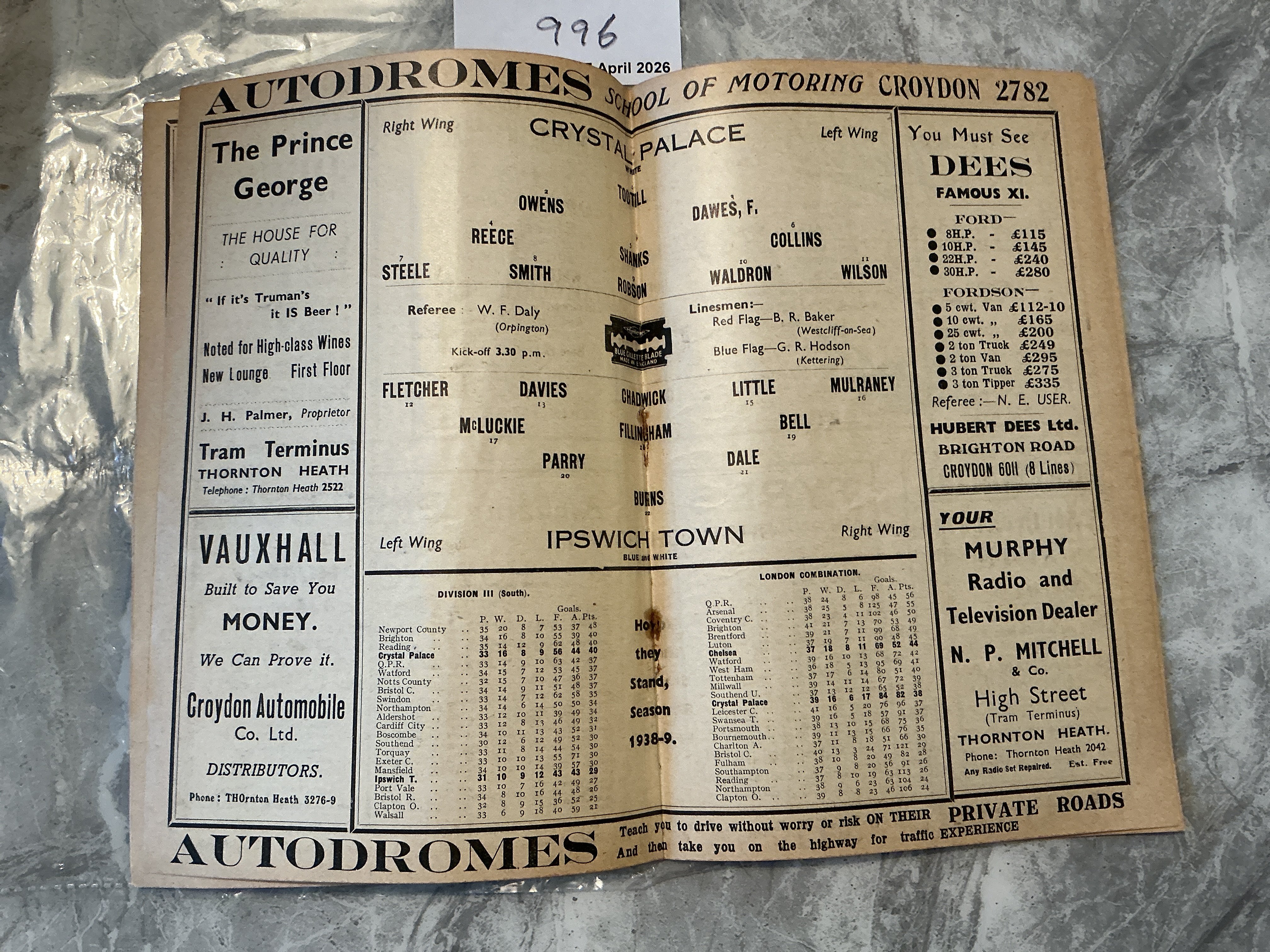 38/39 Crystal Palace v Ipswich Town Football Programme: Very good condition ex bound with no team changes.
