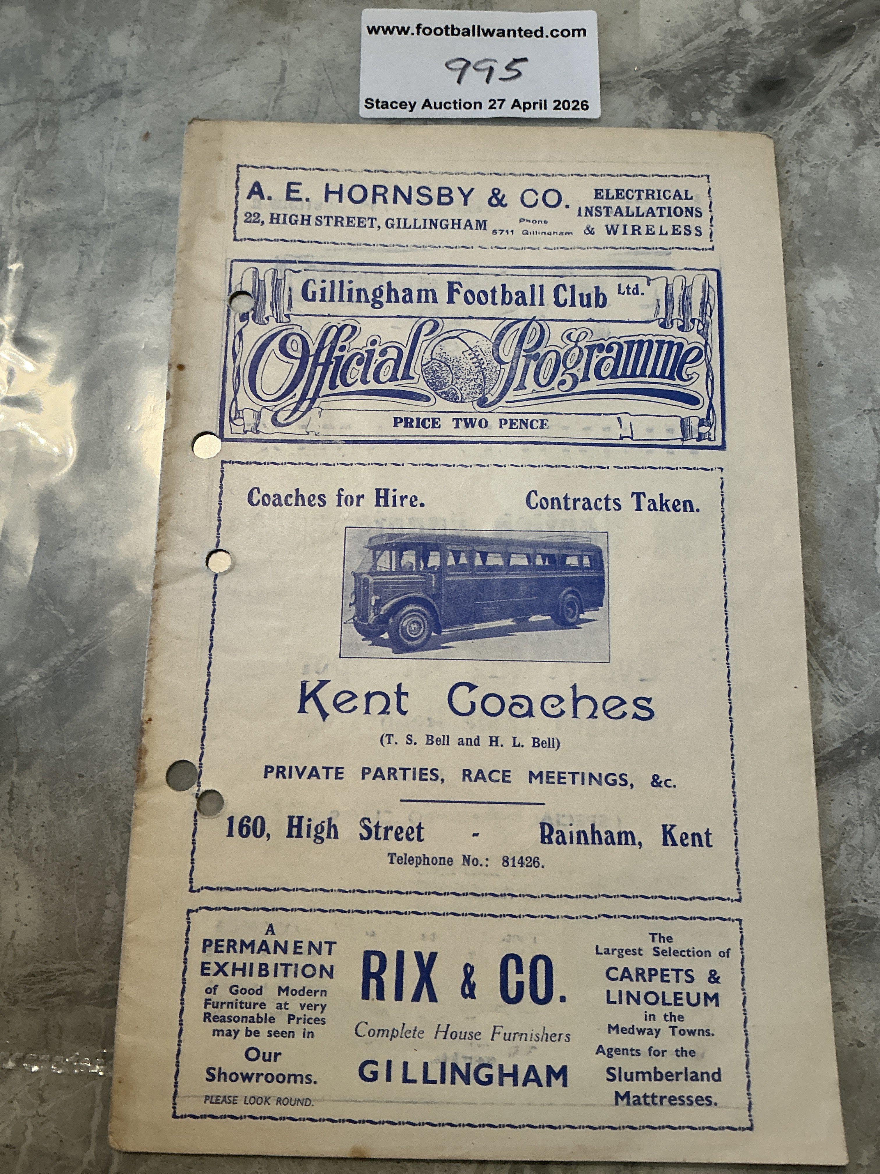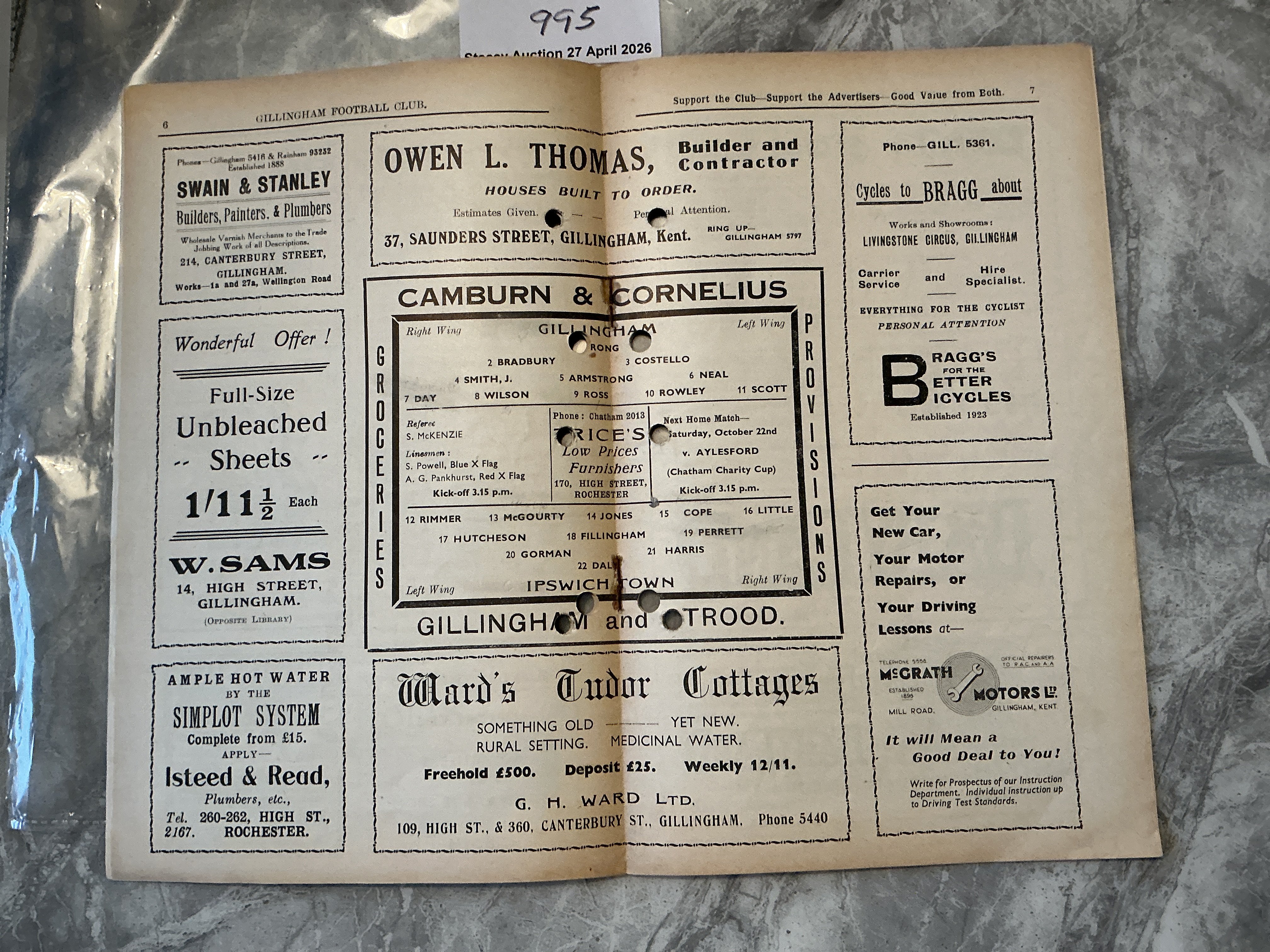 38/39 Gillingham v Ipswich Town Football Programme: Rusty staples holding firm. Five punch holes but no team changes.