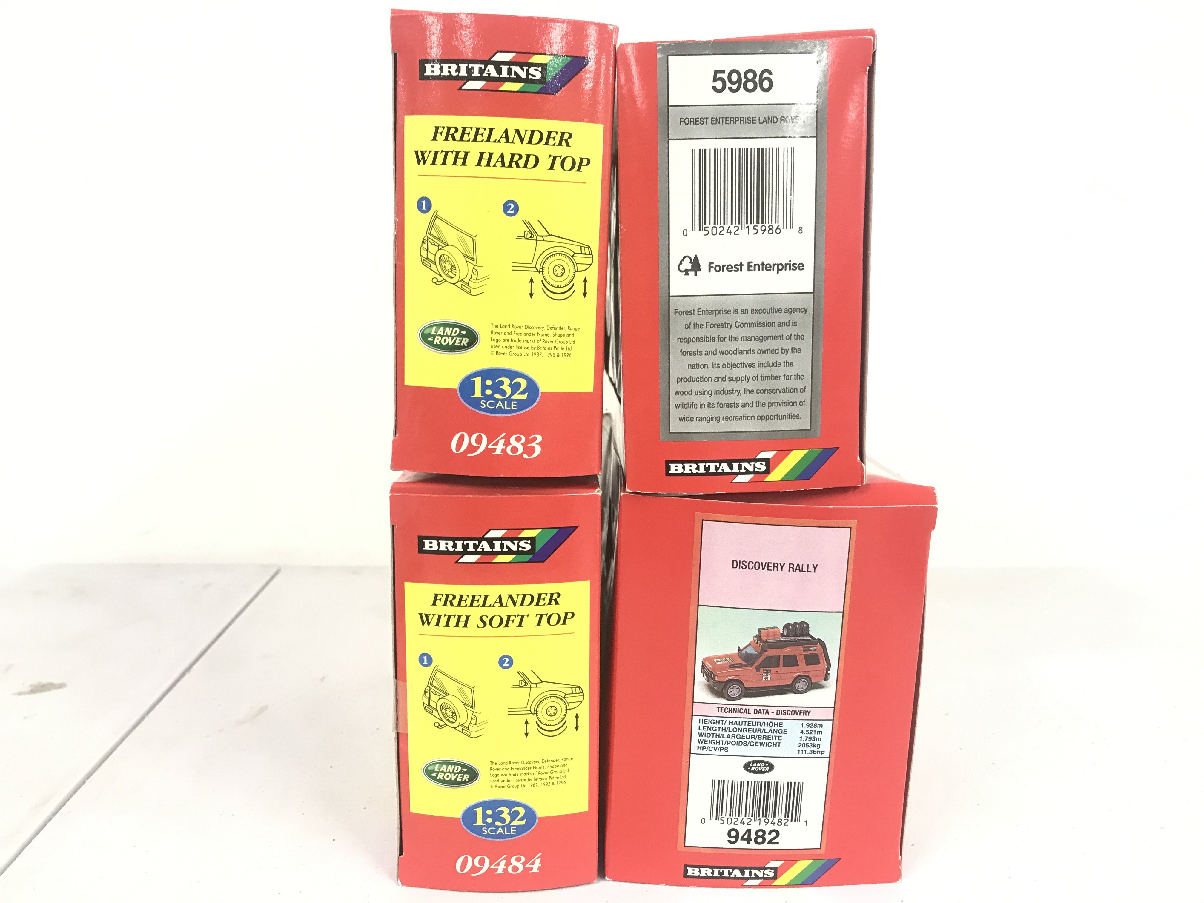 4 Boxed Britains Land Rovers. 2 Freelanders #s09484 And 09483. A Forest Enterprise Land Rover #5986 And A Discovery Rally #9482. (4).