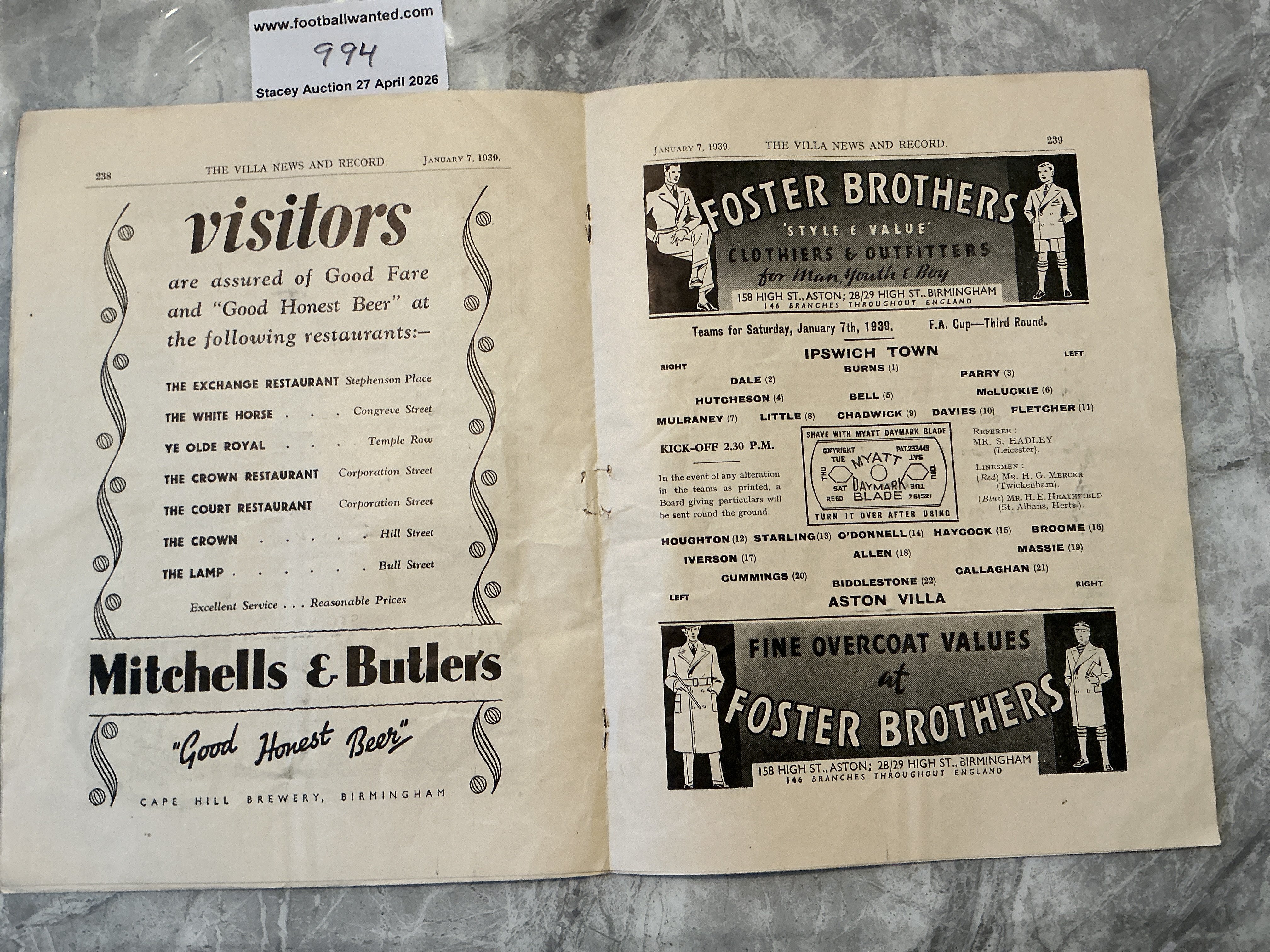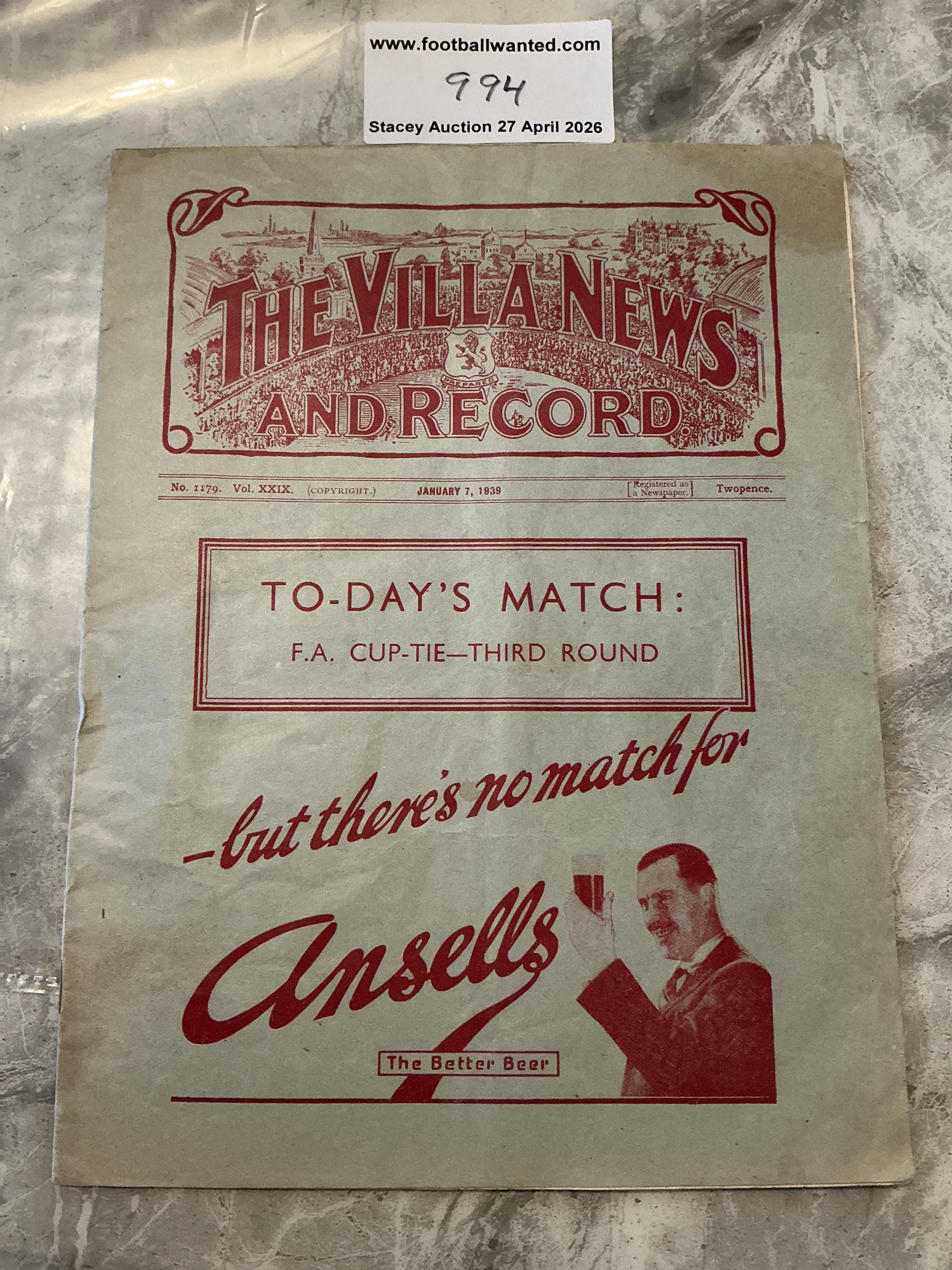 38/39 Aston Villa v Ipswich Town FA Cup Football Programme: Very good condition with no team changes.