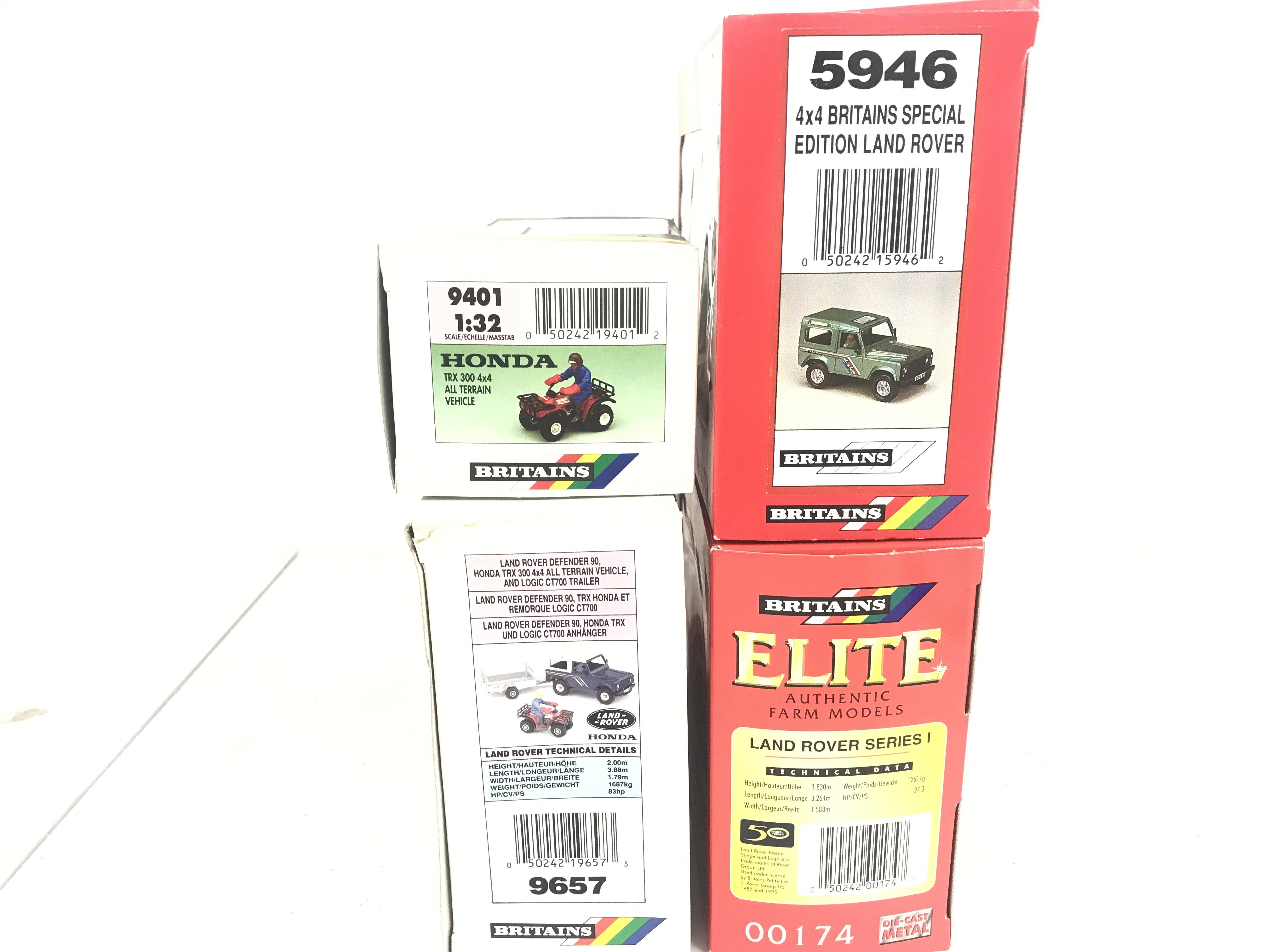 3 X Boxed Britains Land Rovers. A 4X4 #5946. A Land Rover Series I #00174 A Land Rover Defender 90 #9657. And A Honda All Terrain Vehicle #9401 (4).