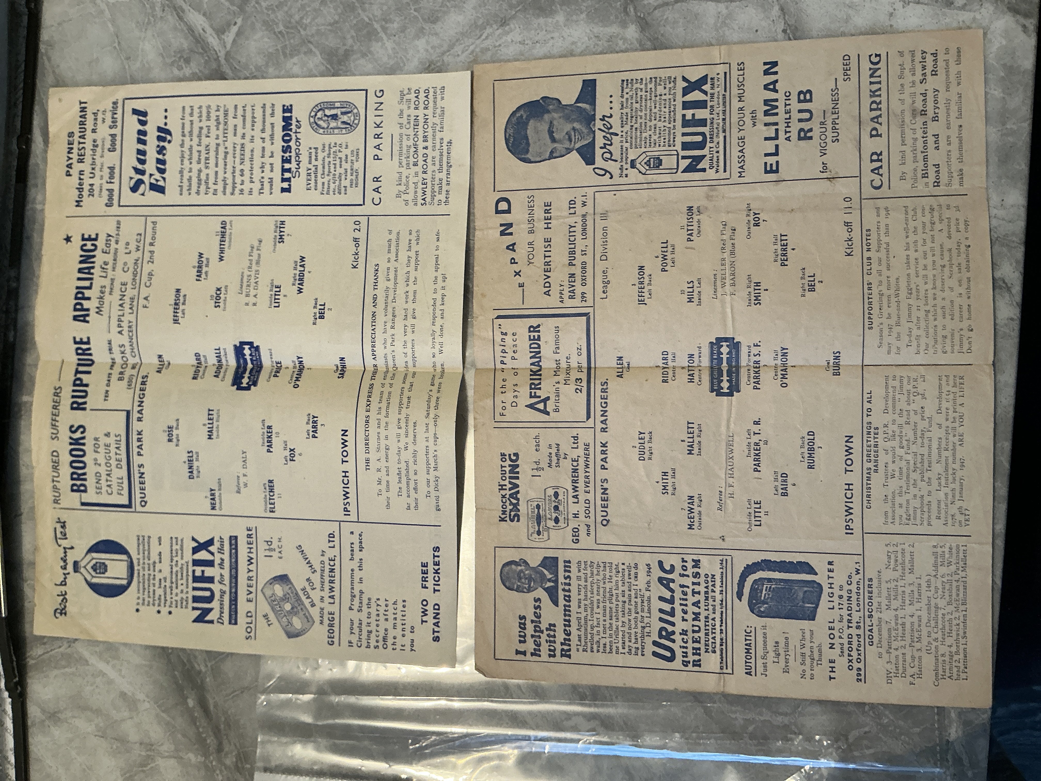 45/46 + 46/47 QPR v Ipswich Football Programmes: 45/46 FA Cup is excellent and 46/47 league match is very good with folding. No team changes.