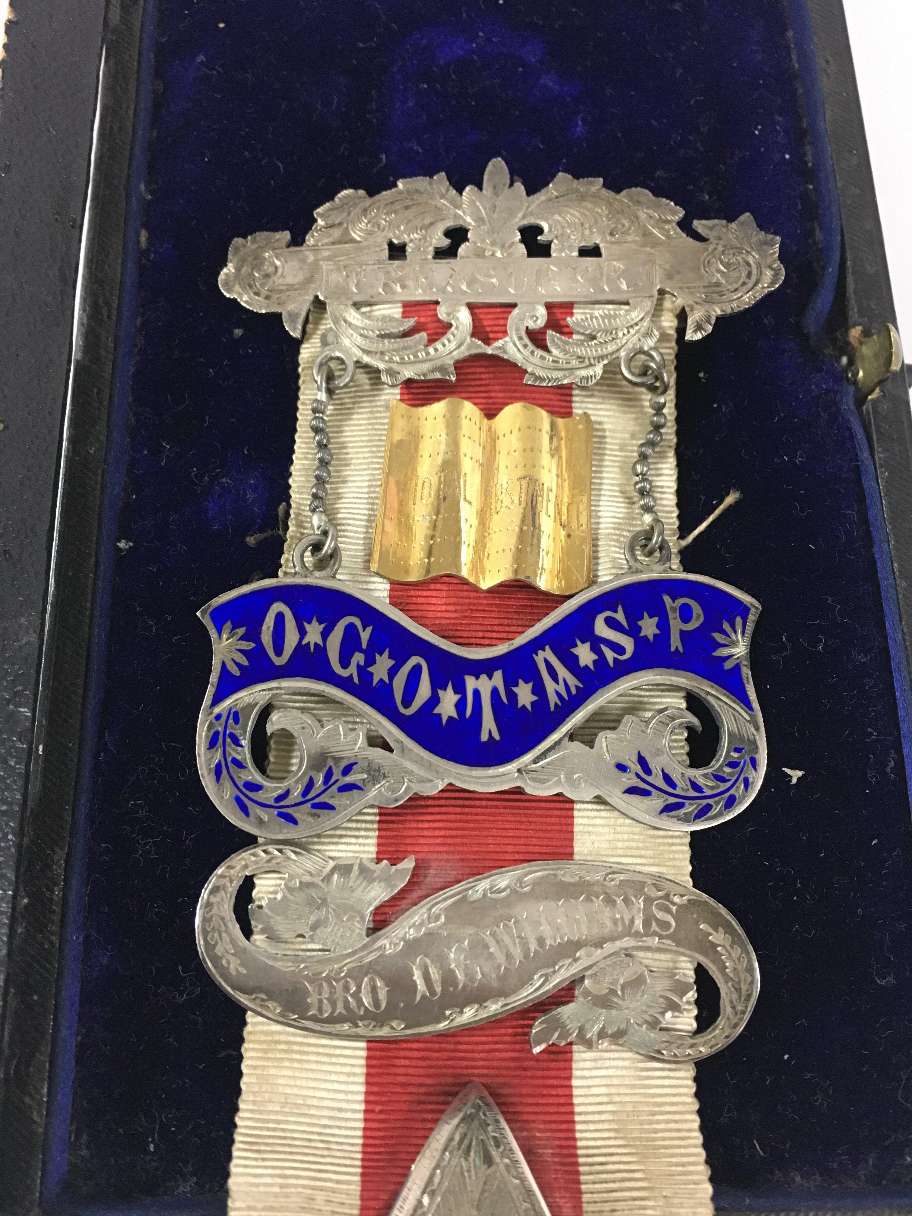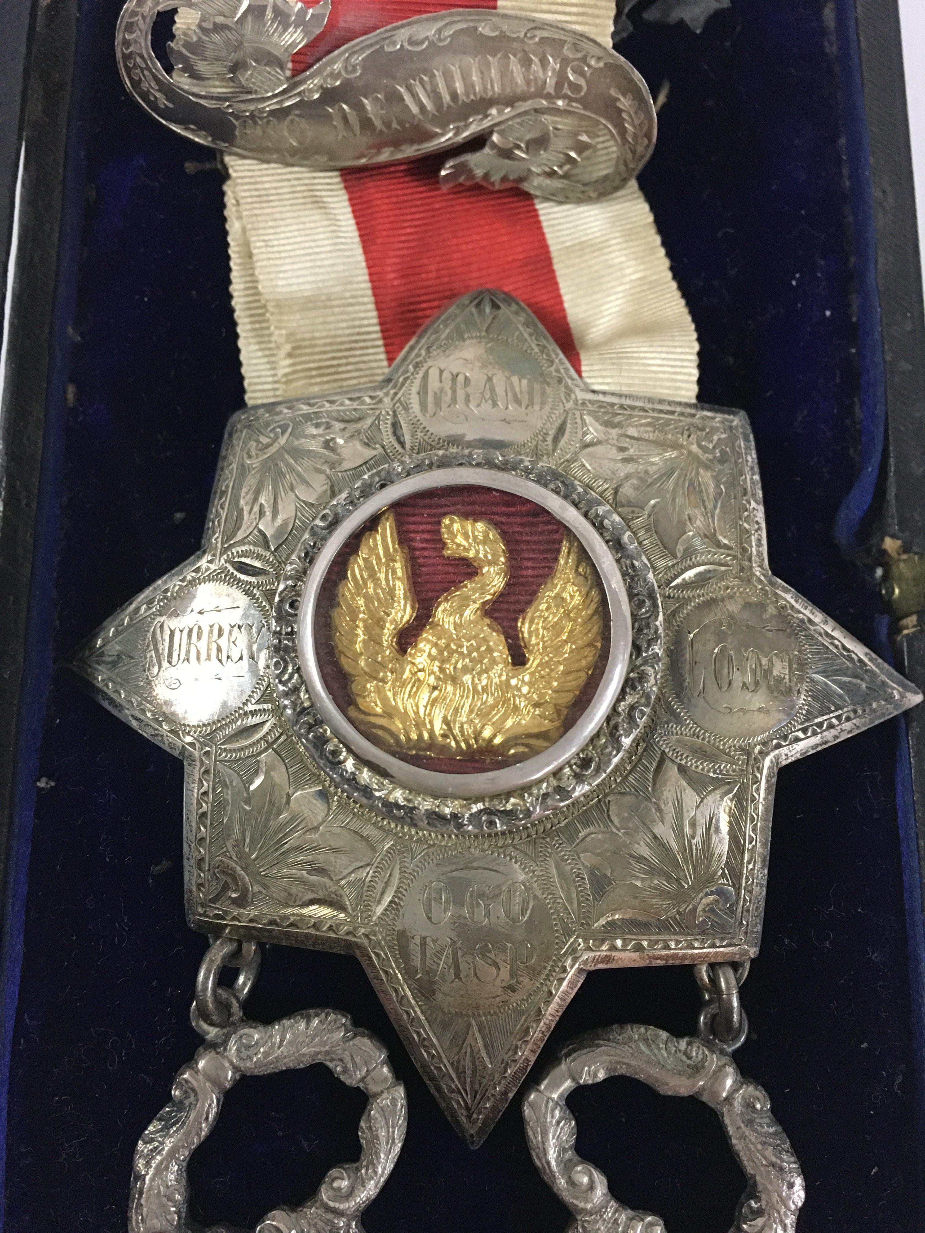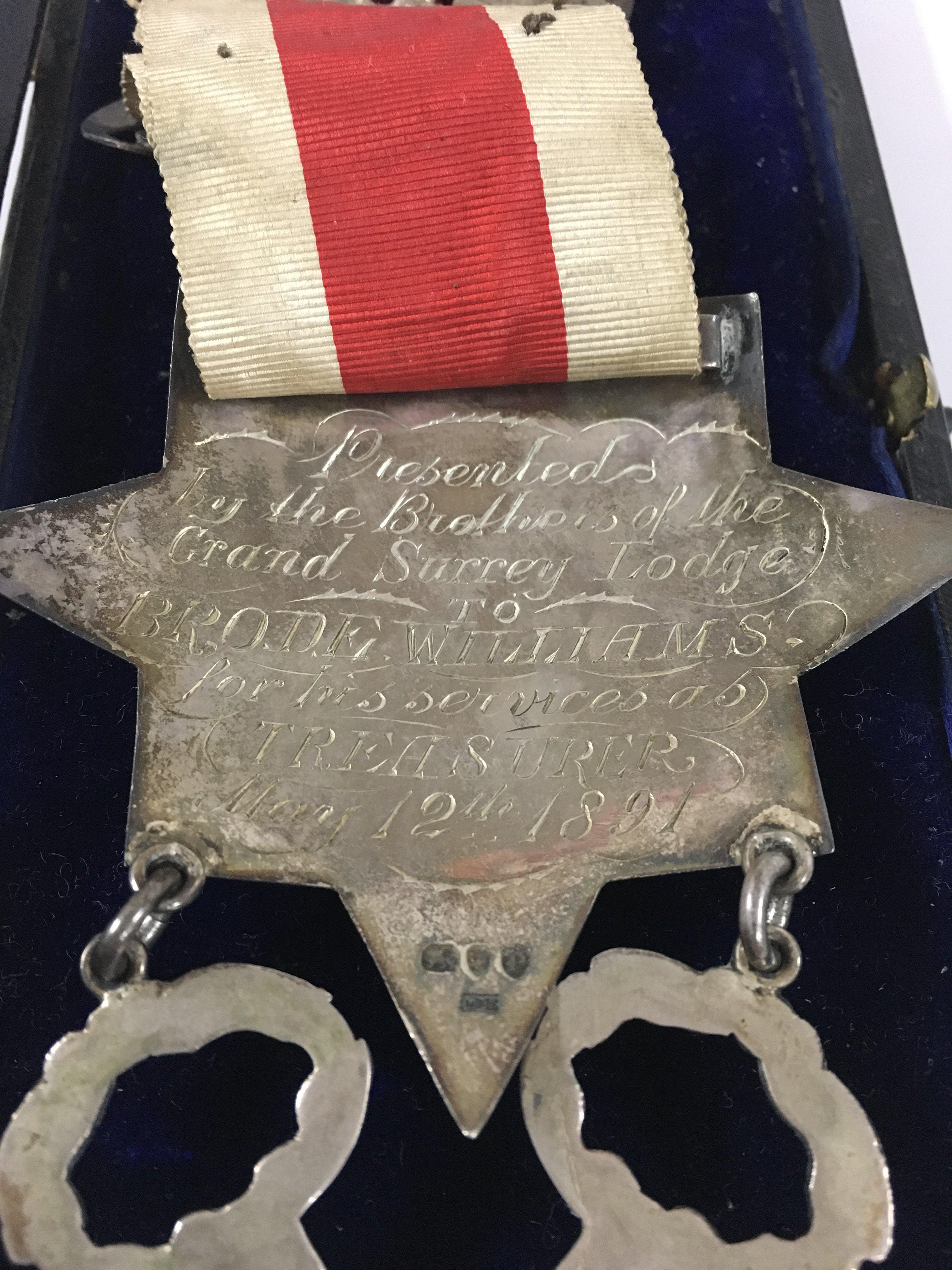 A Freemason medal from the grand Surrey lodge. “ presented by the brothers of the grand Surrey lodge to brode Williams for his services as treasurer, may 12th 1891.â€