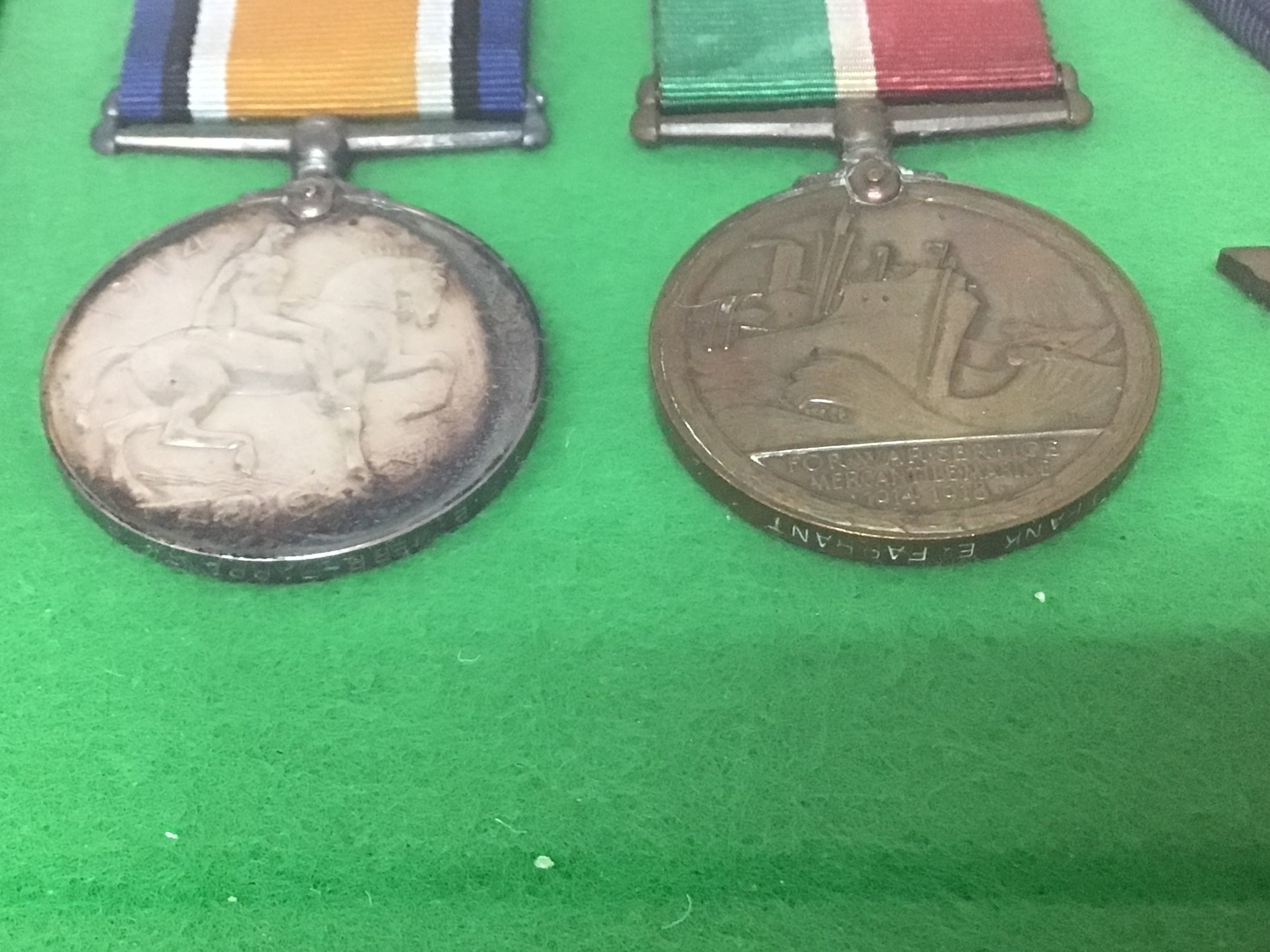 A sealed frame containing six medals 1914-1918 I world war medal a Mercantile medal 1939-45 star Atlantic star 1935-45 Victory medal and an Elizabeth II Coronation medal (6)