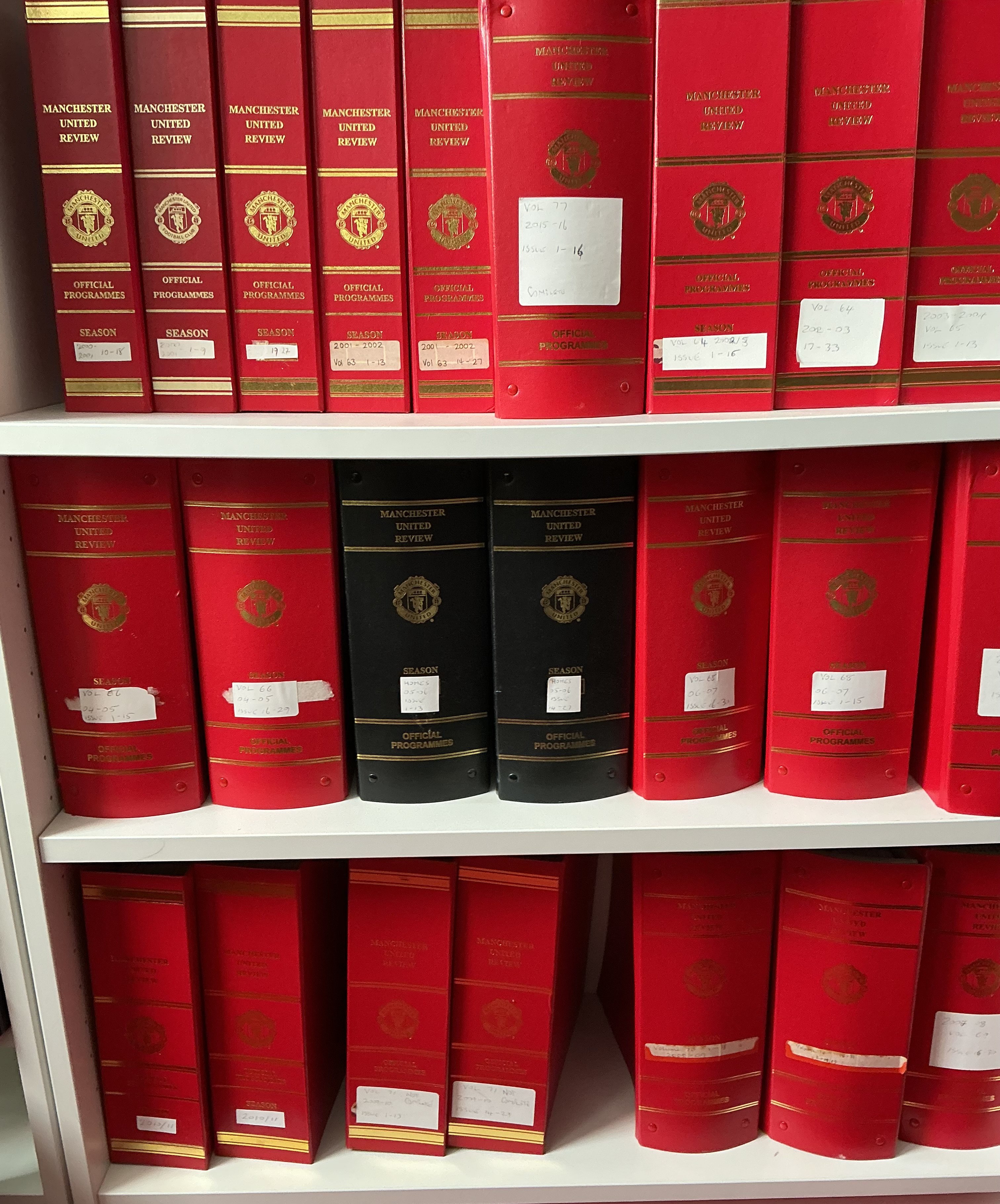 Manchester United Home Football Programme Collection In Binders: Stunning collection of official binders for seasons 49/50 through to 2016/17 in attractive red binders all with Manchester United and season in gold to spines. Including a few spares and a couple of black away binders there are 95 binders. Whilst this is from probate we feel this would be near complete of programmes from 57/58 to 2016/17 and going back to 49/50 there are around a further 30.