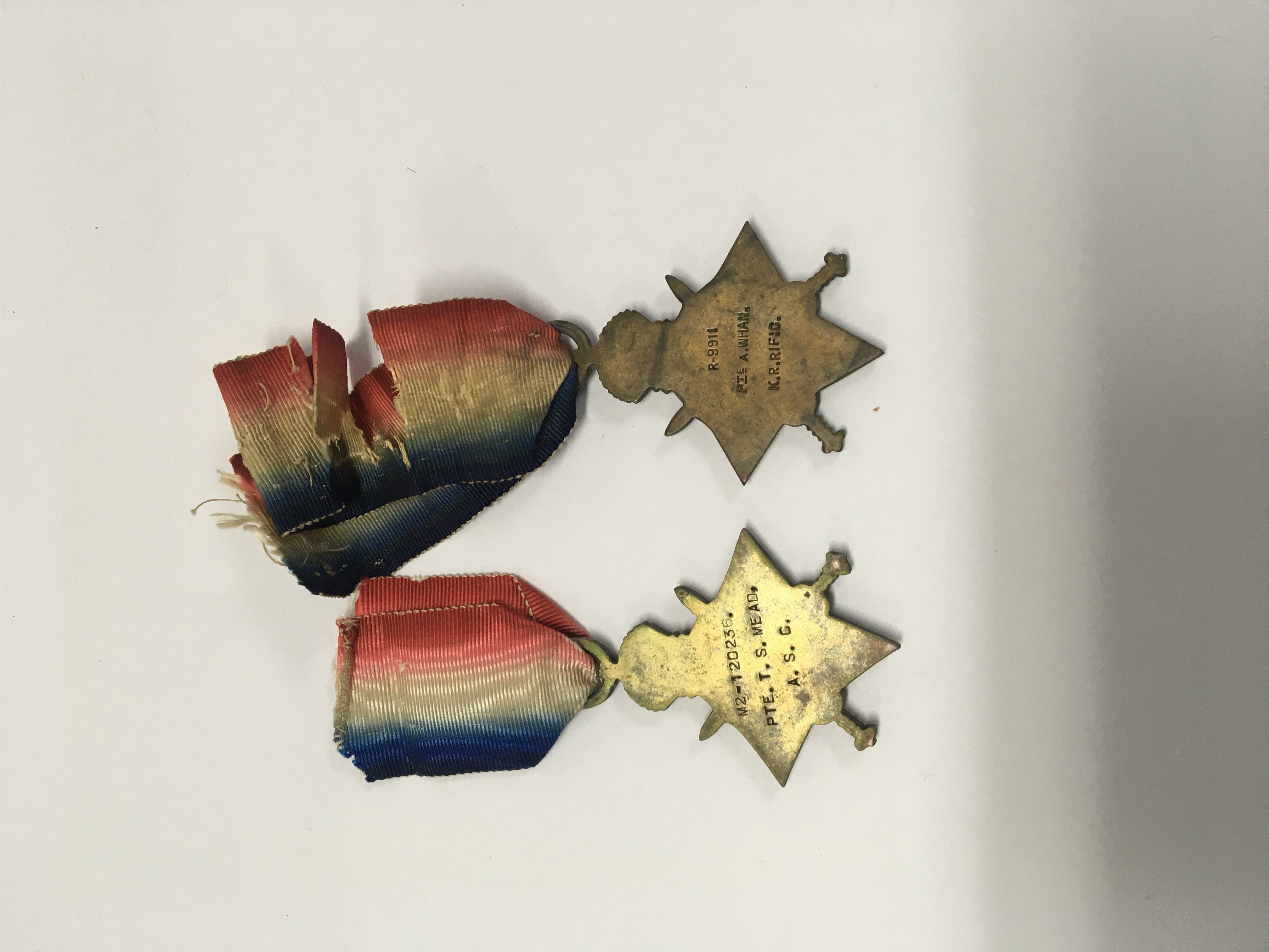 World War 1 star medals 1914-15. M2- 120236 PTE. T. S. Mead, A.S.C (1). R-9911 PTE A. Whan. K. R. RIF: C (2)