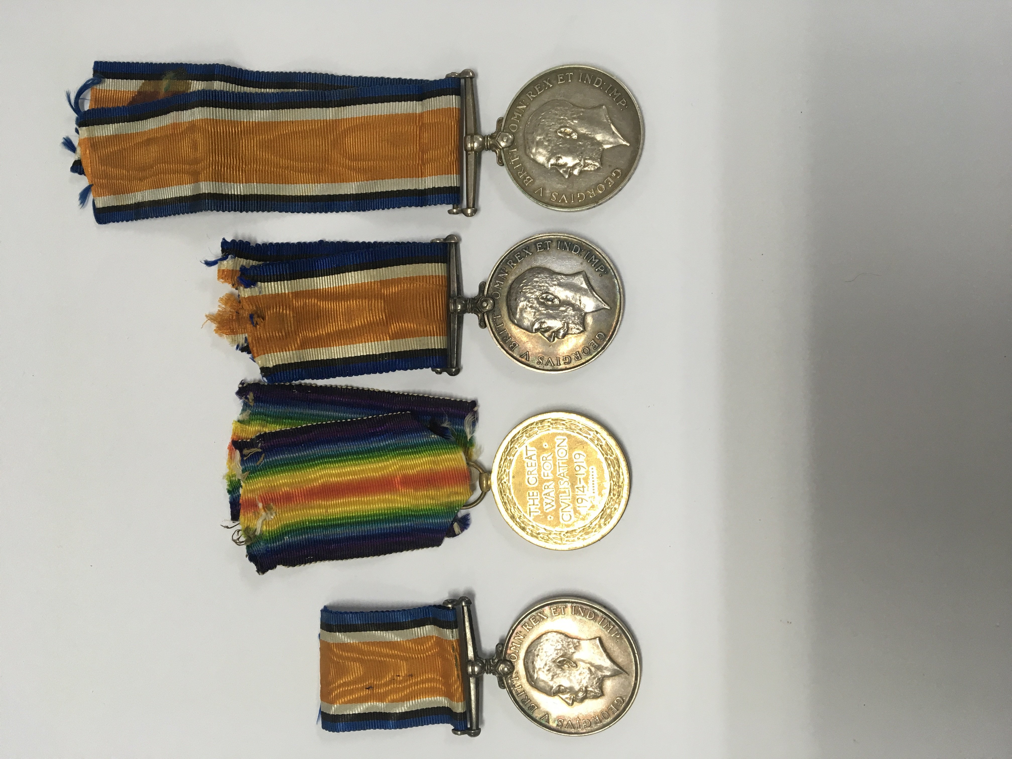 Group of four WW1 medals. 200643 GNR. H. Porter. R. A 1914-18 (1). 200643 GNR. H. Porter. R. A 1914-19 (2). 2736 PTE. W. Turner. 5-LOND. R 1914-18 (3). 843 PTE.R. W. STIBBING. RIF. BRIG 1914-18 (4).
