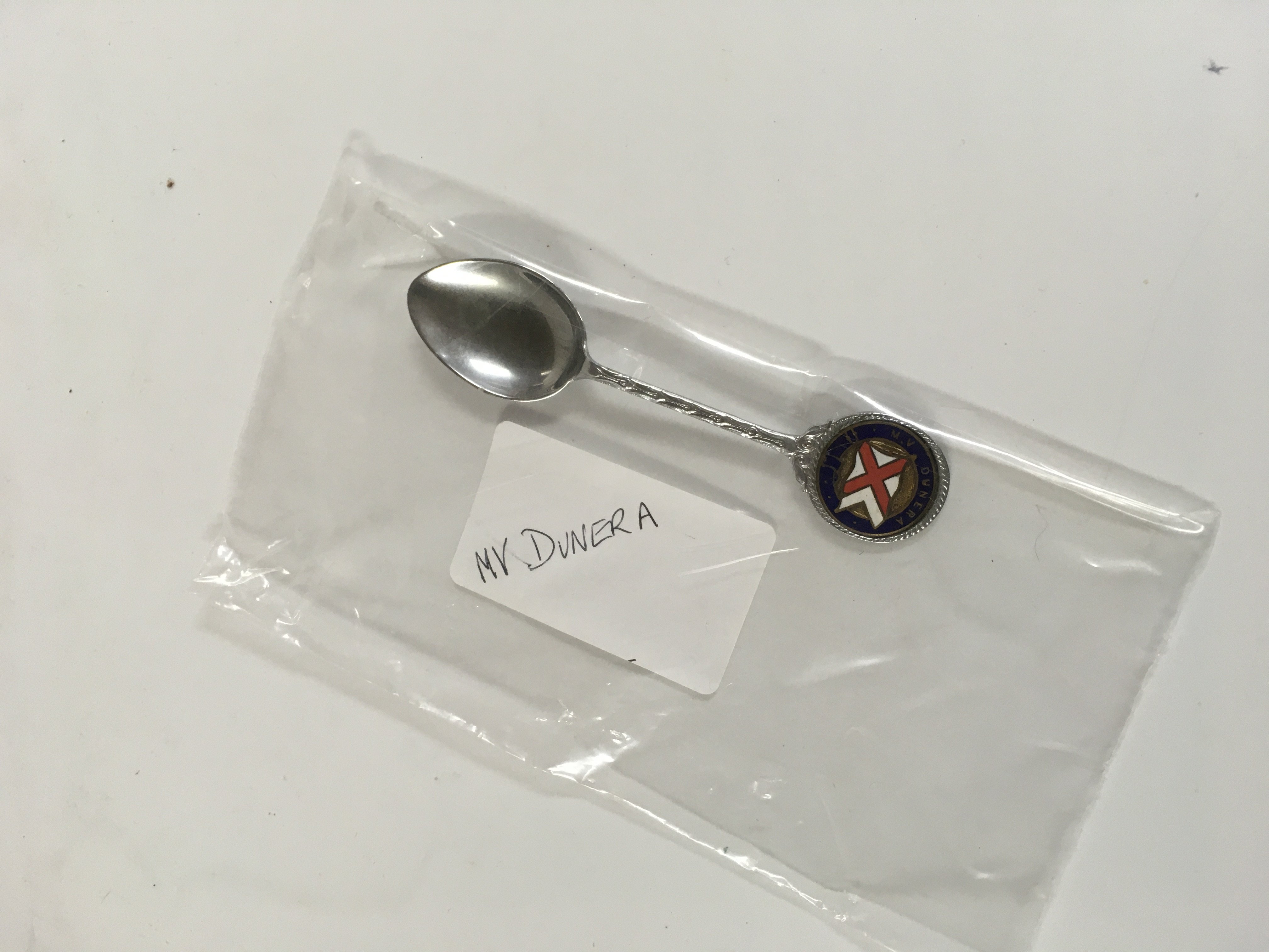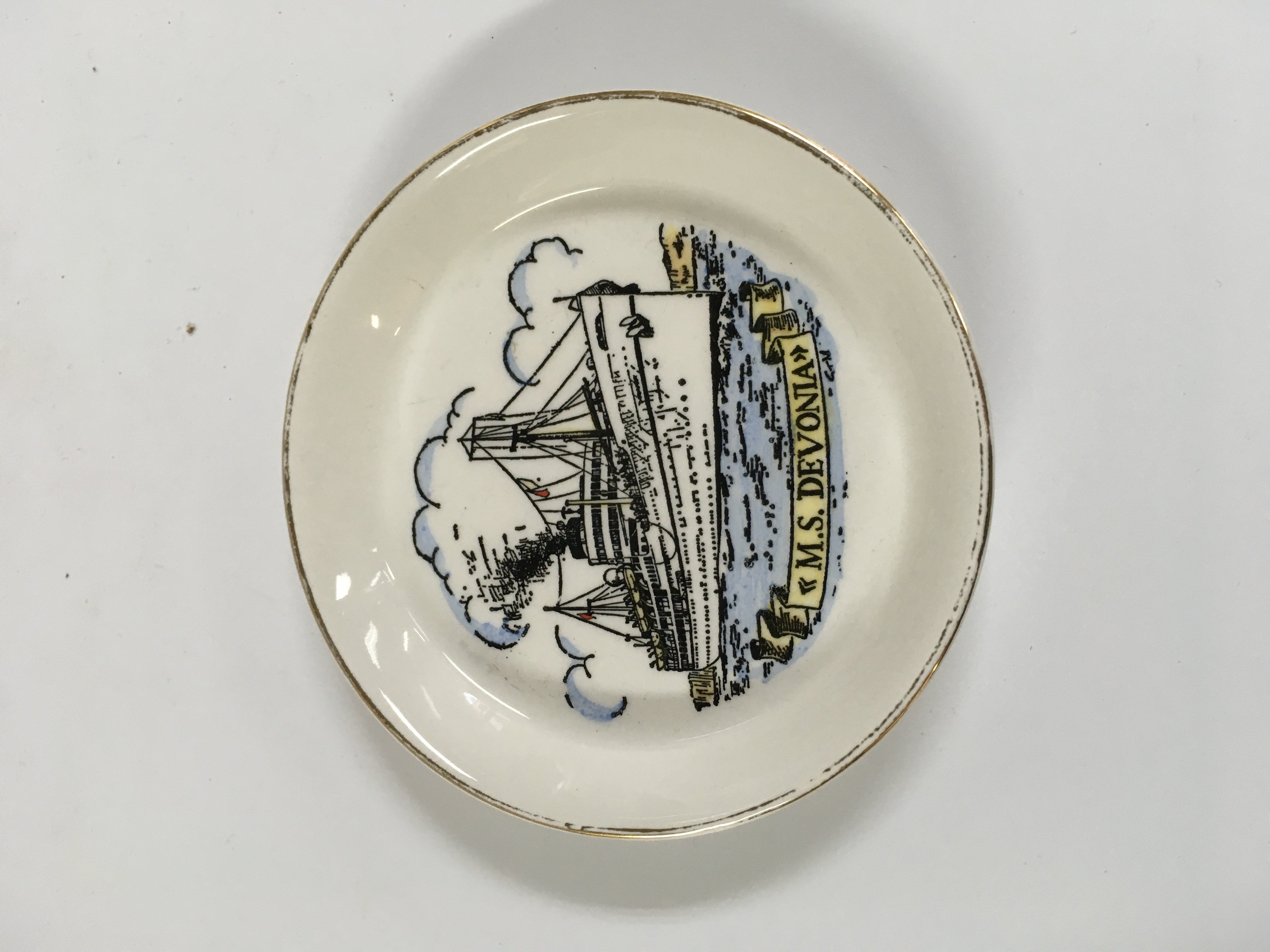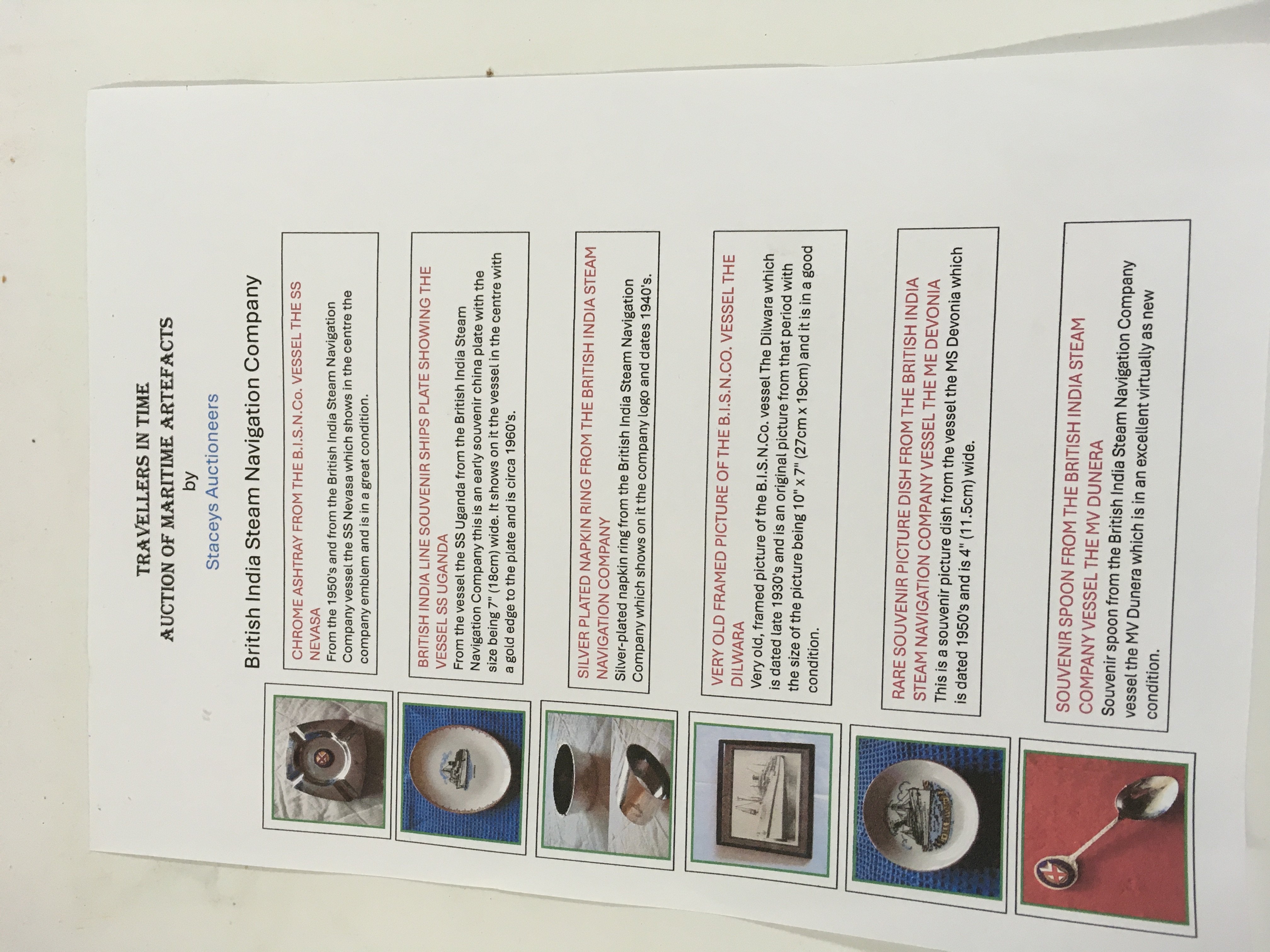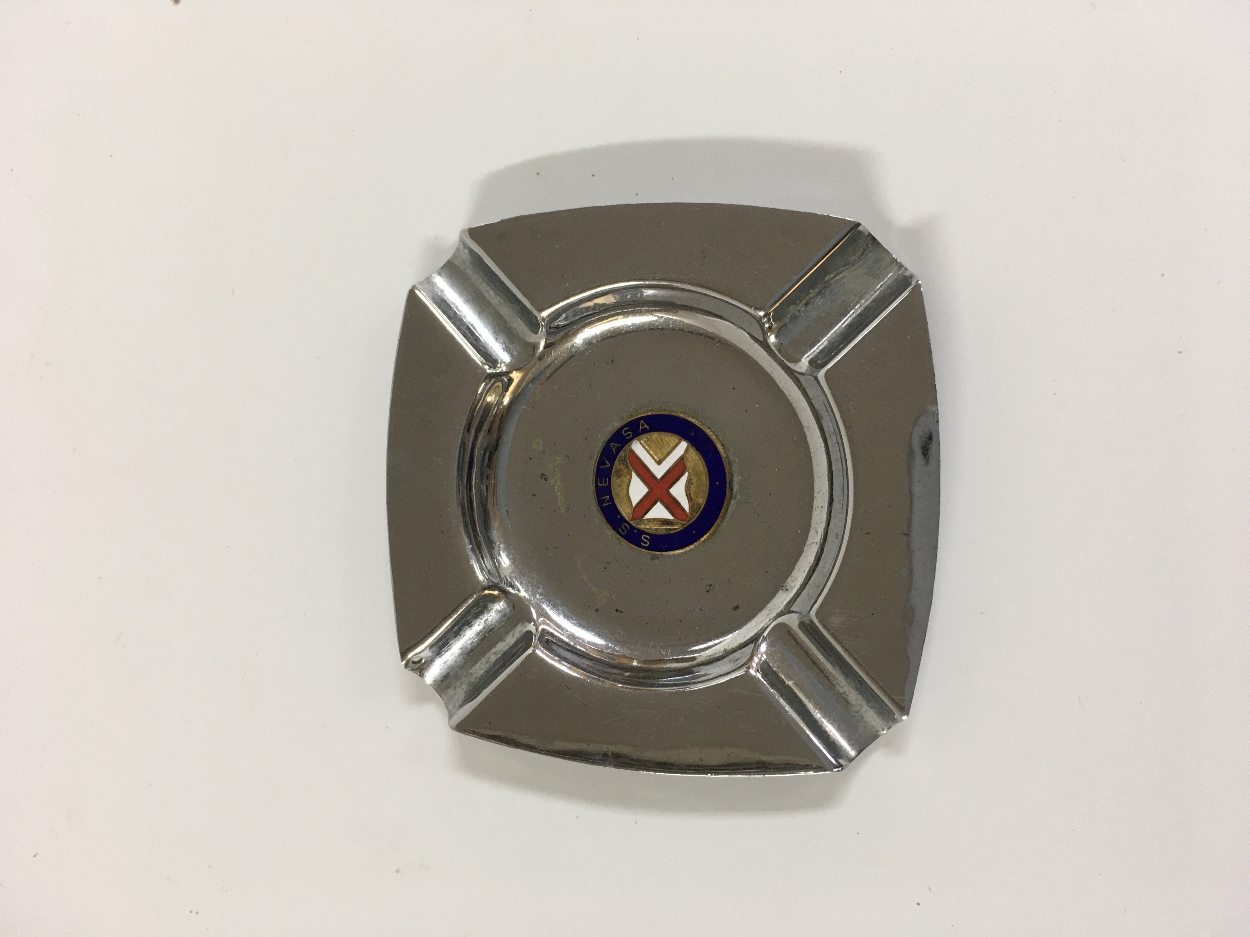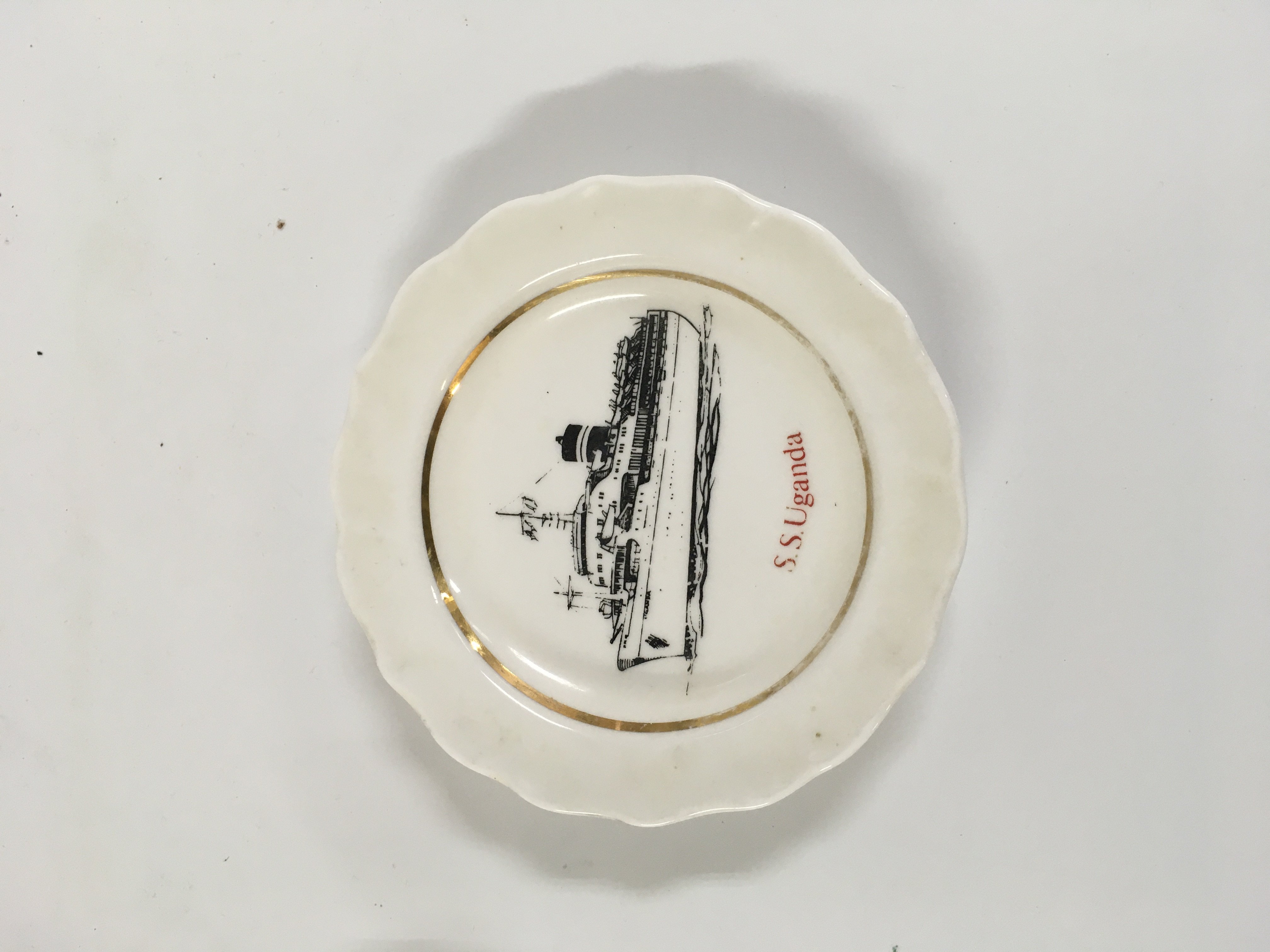 Collection of British India Steam Navigation Company items consisting of a Chrome ashtray from the B.I.S.N.Co vessel SS Nevasa, British India line souvenir ships plate showing the vessel SS Uganda, silver plated napkin ring from the British India steam navigation company, very old framed picture of the B.I.S.N.Co vessel, rare souvenir picture dish from the British India steam navigation company vessel the Me Devonia and a souvenir spoon from the British India steam company vessel the MV Dunera