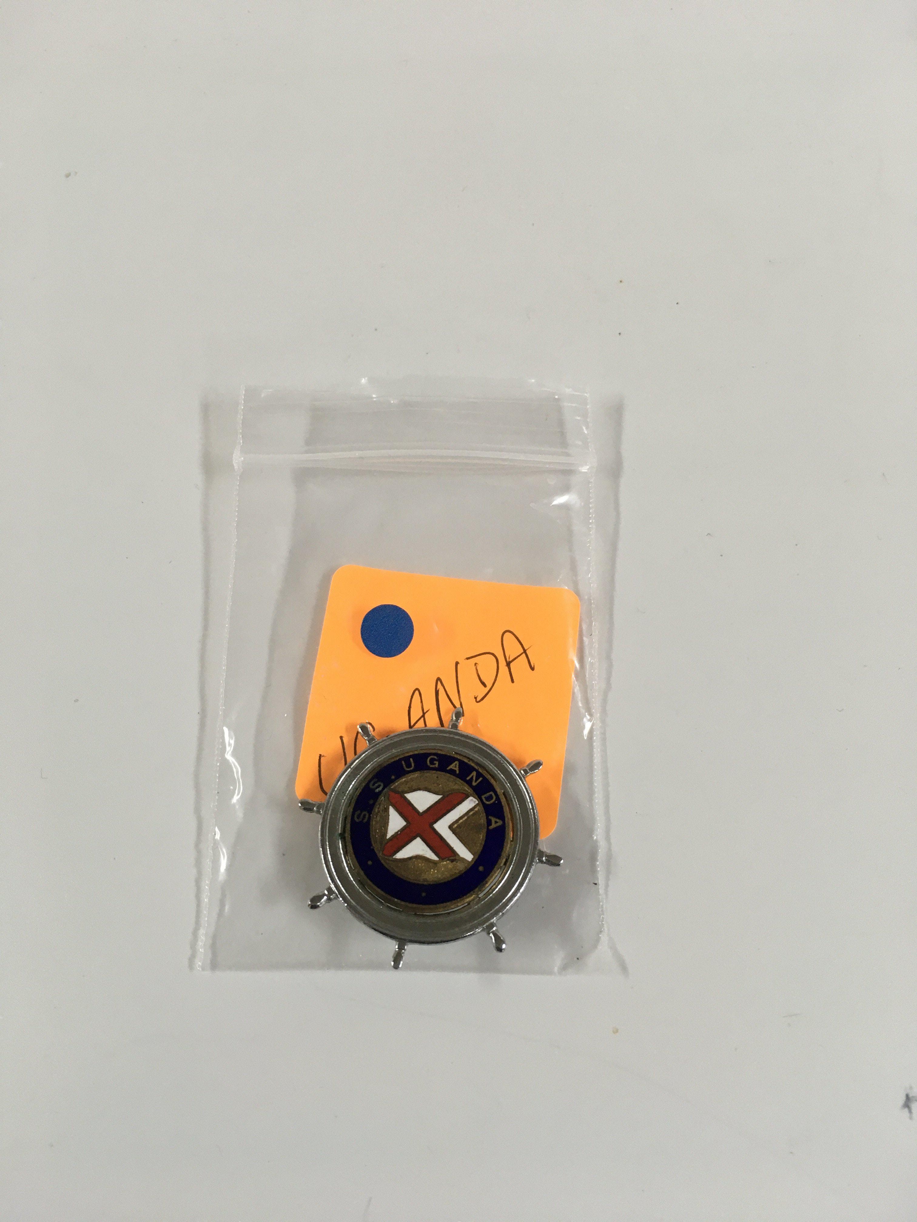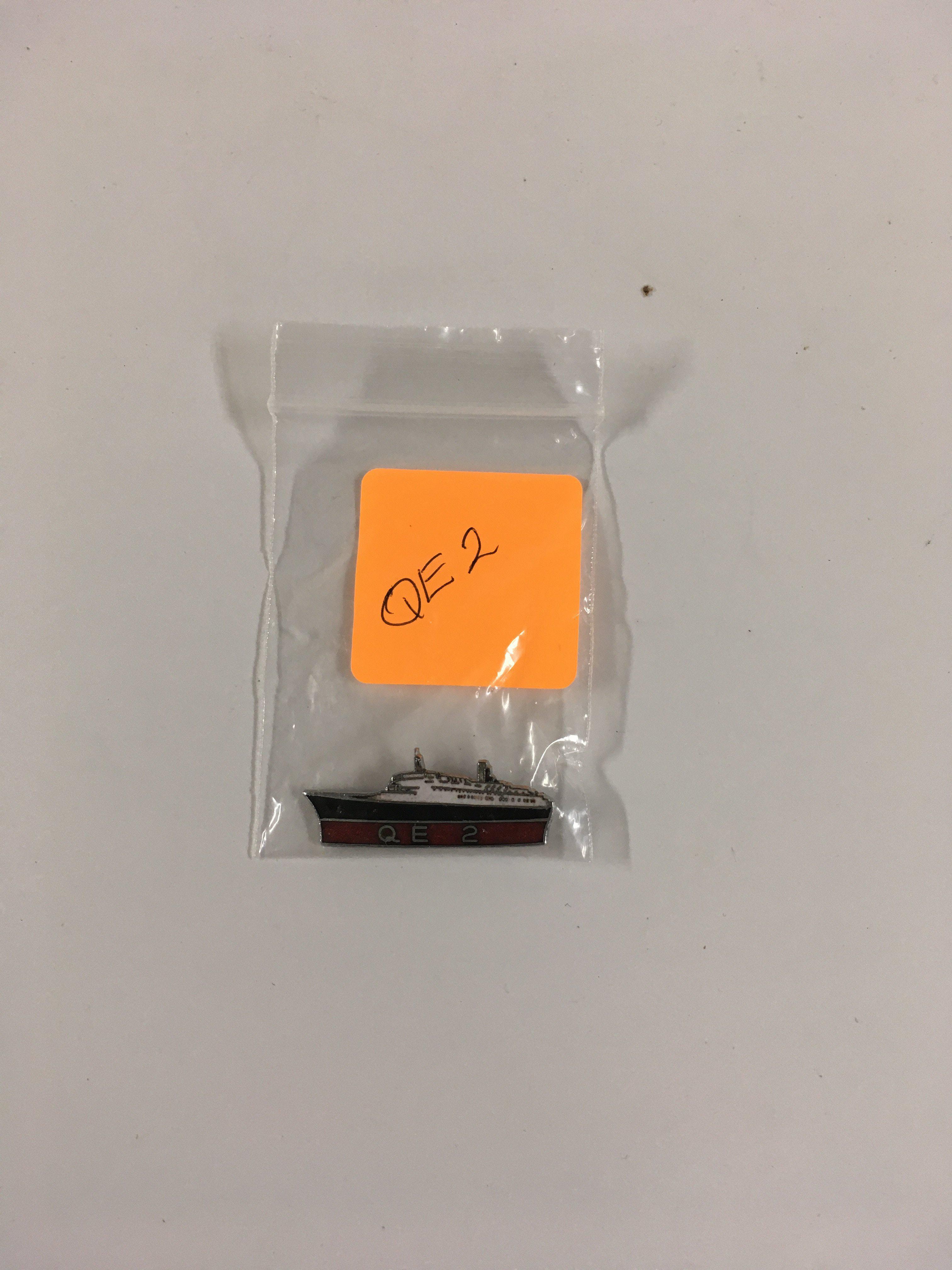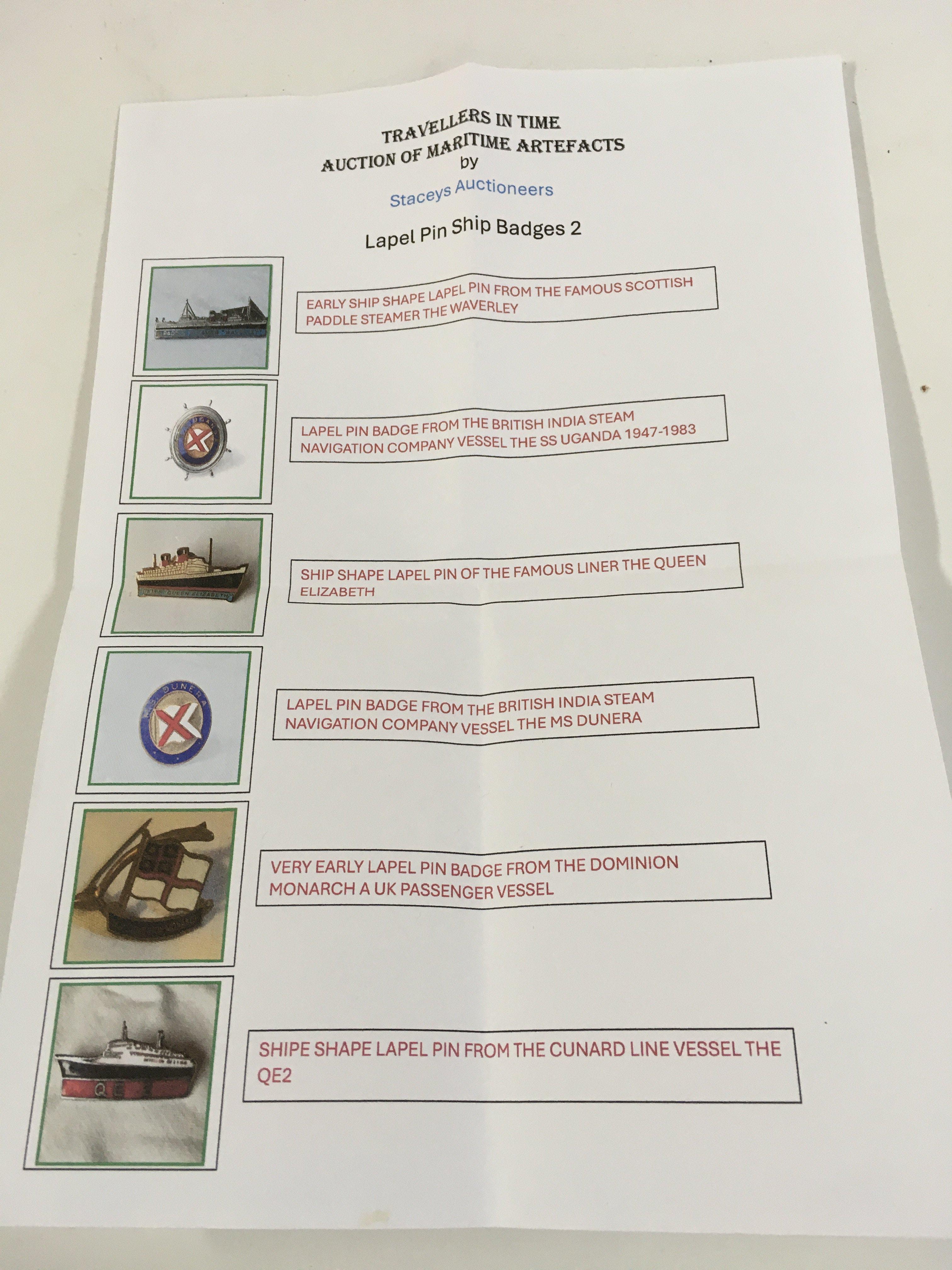 A collection of lapel pin ship badges consisting of an early ship shape lapel pin from the famous Scottish paddle steamer the Waverley, lapel pin badge from the British India steam navigation company vessel the SS Uganda 1947-83, ship shape lapel pin of the famous liner the Queen Elizabeth, lapel badge from the British India steam navigation vessel the MS Dunera, very early lapel pin badge from the dominion monarch a UK passenger vessel and a ship shape lapel pin from the Cunard line vessel the QE2