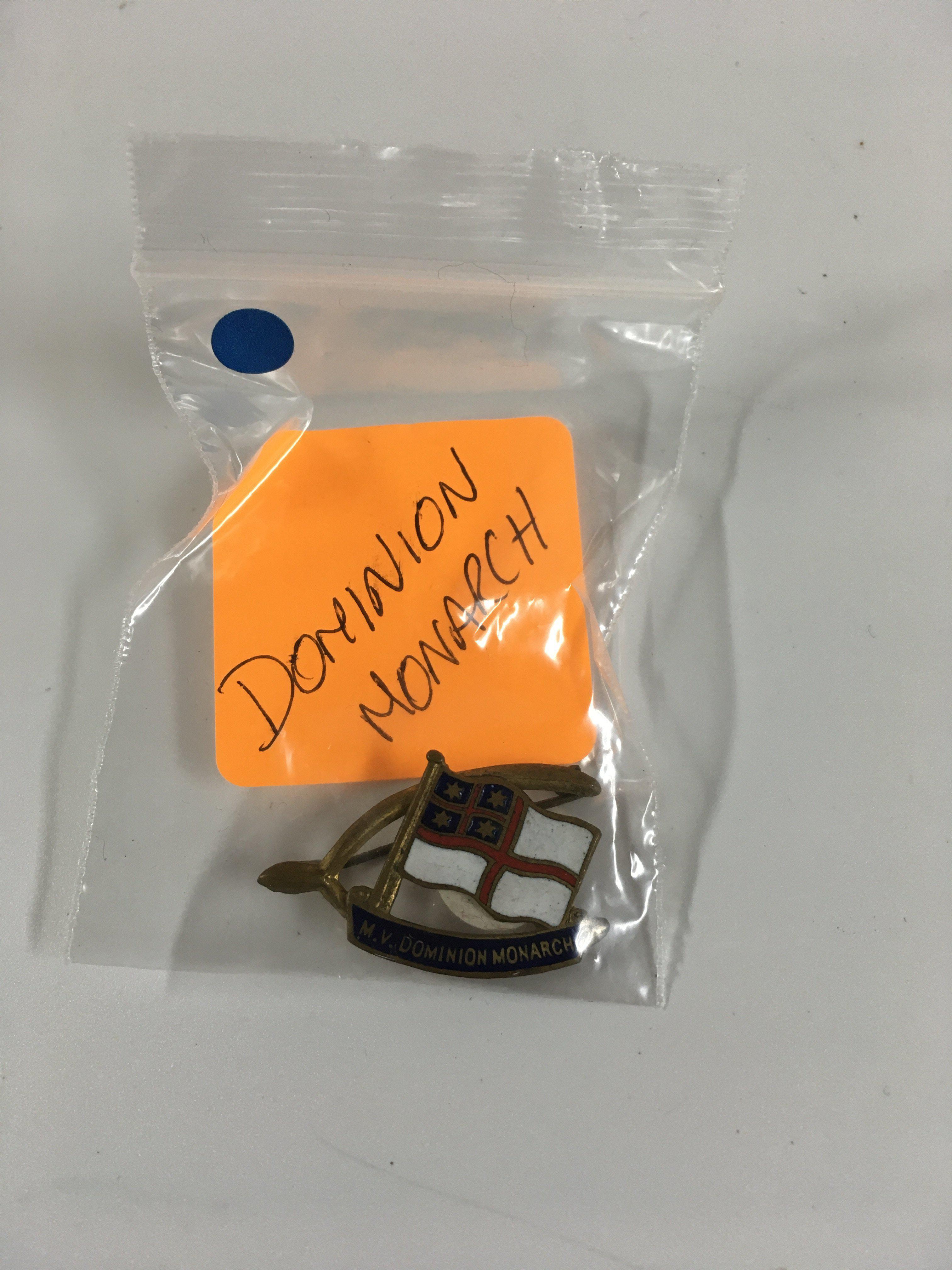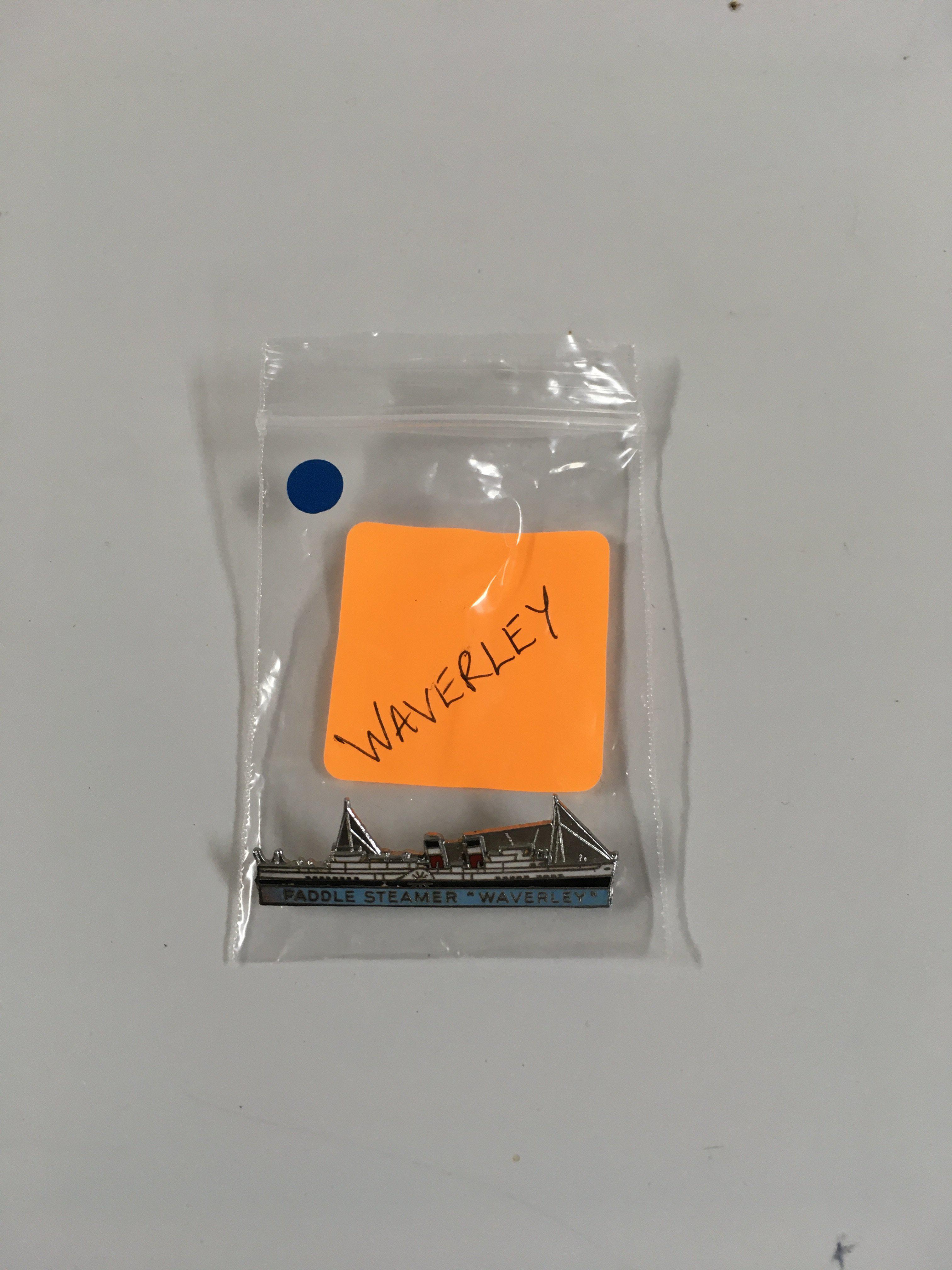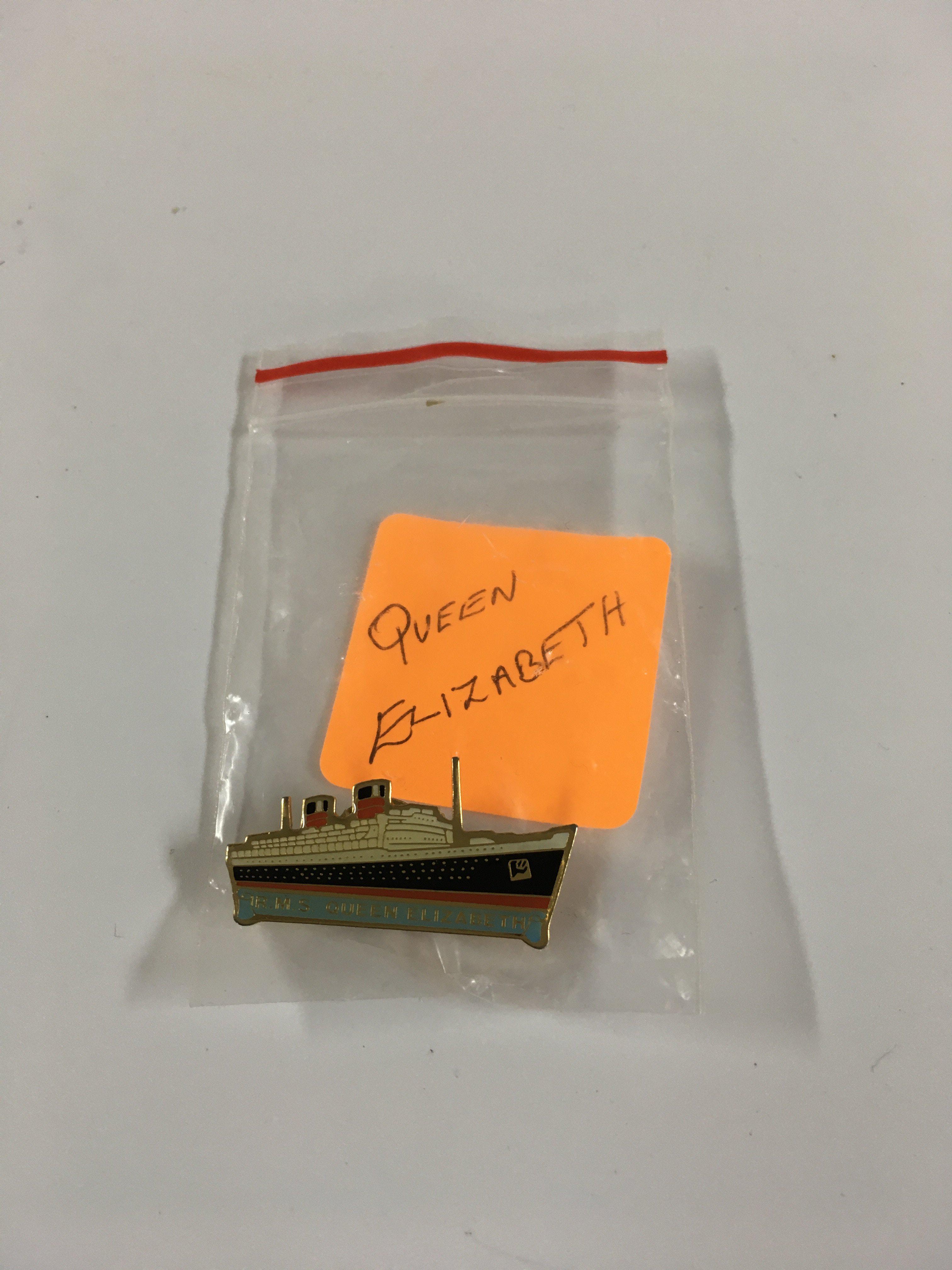 A collection of lapel pin ship badges consisting of an early ship shape lapel pin from the famous Scottish paddle steamer the Waverley, lapel pin badge from the British India steam navigation company vessel the SS Uganda 1947-83, ship shape lapel pin of the famous liner the Queen Elizabeth, lapel badge from the British India steam navigation vessel the MS Dunera, very early lapel pin badge from the dominion monarch a UK passenger vessel and a ship shape lapel pin from the Cunard line vessel the QE2