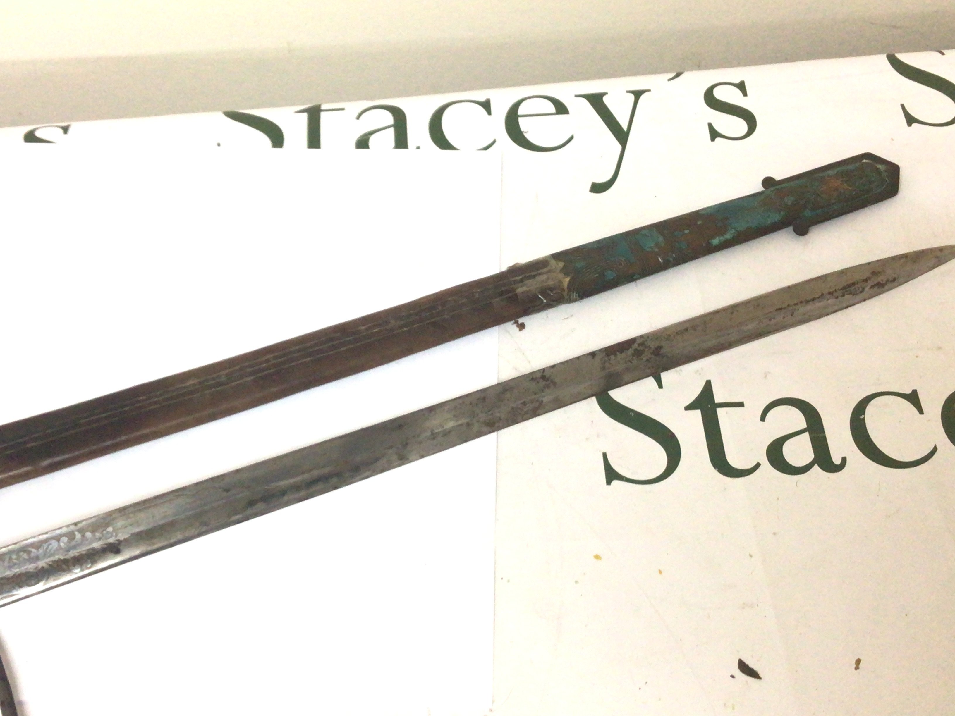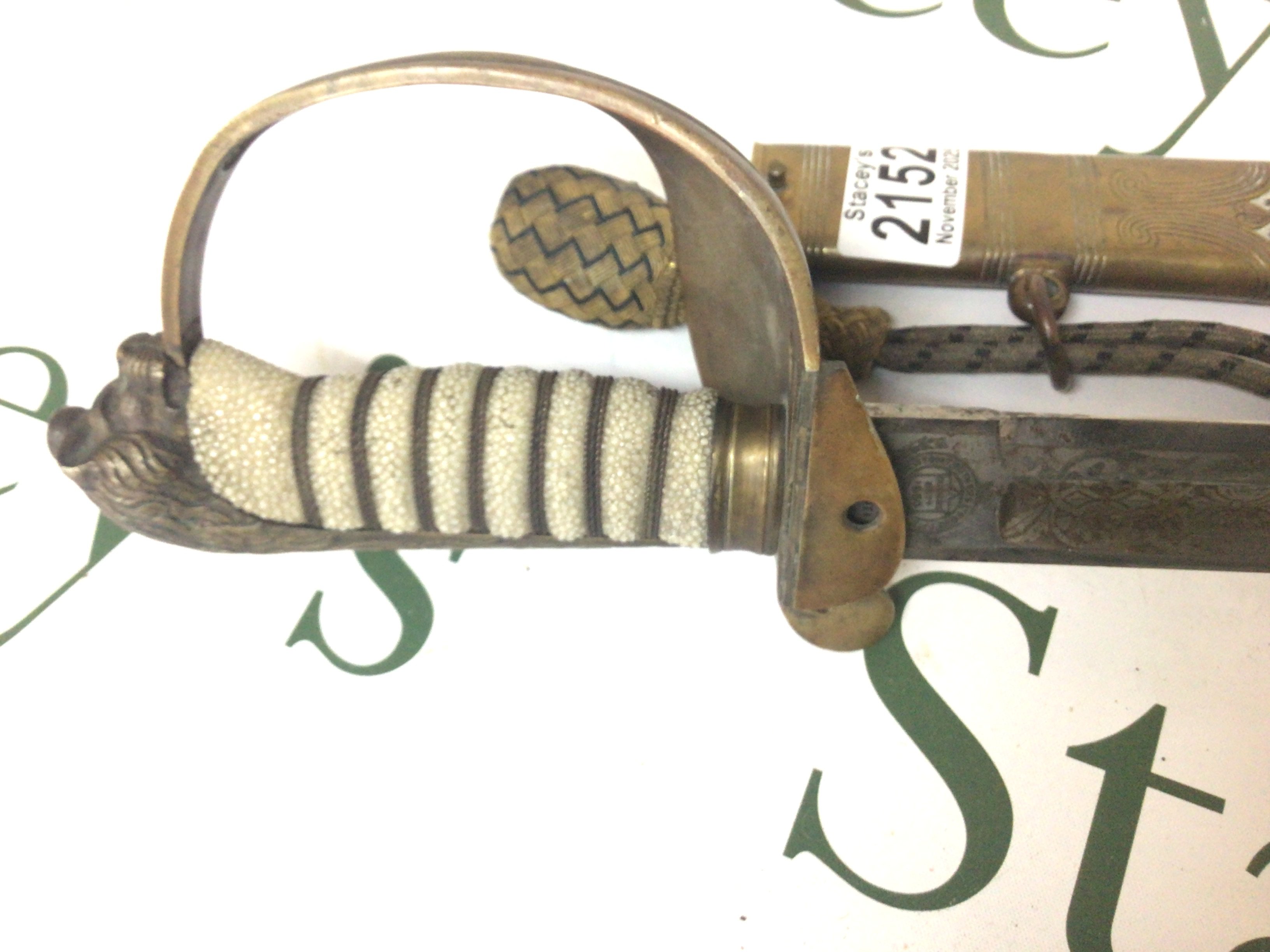 A British Officer Navy Sword RNR the sword the maker Fenton Bro Sheffield with wired shagreen grip brass fittings the blade with engraving including Royal cypher for George V. Leather and brass scabbard.