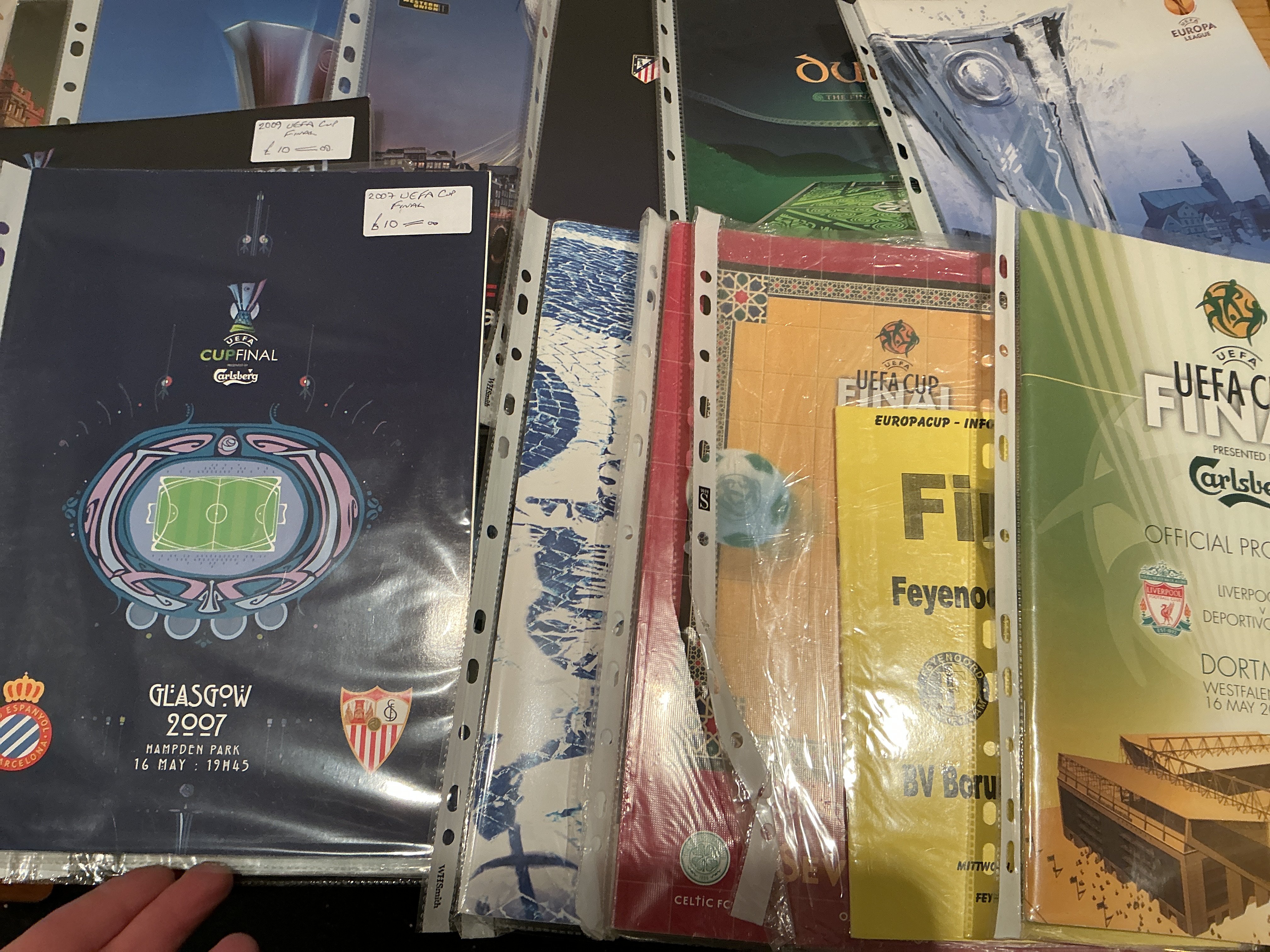UEFA Cup Final Football Programmes: Includes 1985 Videoton v Real Madrid, 1992 Ajax v Torino and some Liverpool and Tottenham matches. A few more modern Europa League included. Excellent. (34)