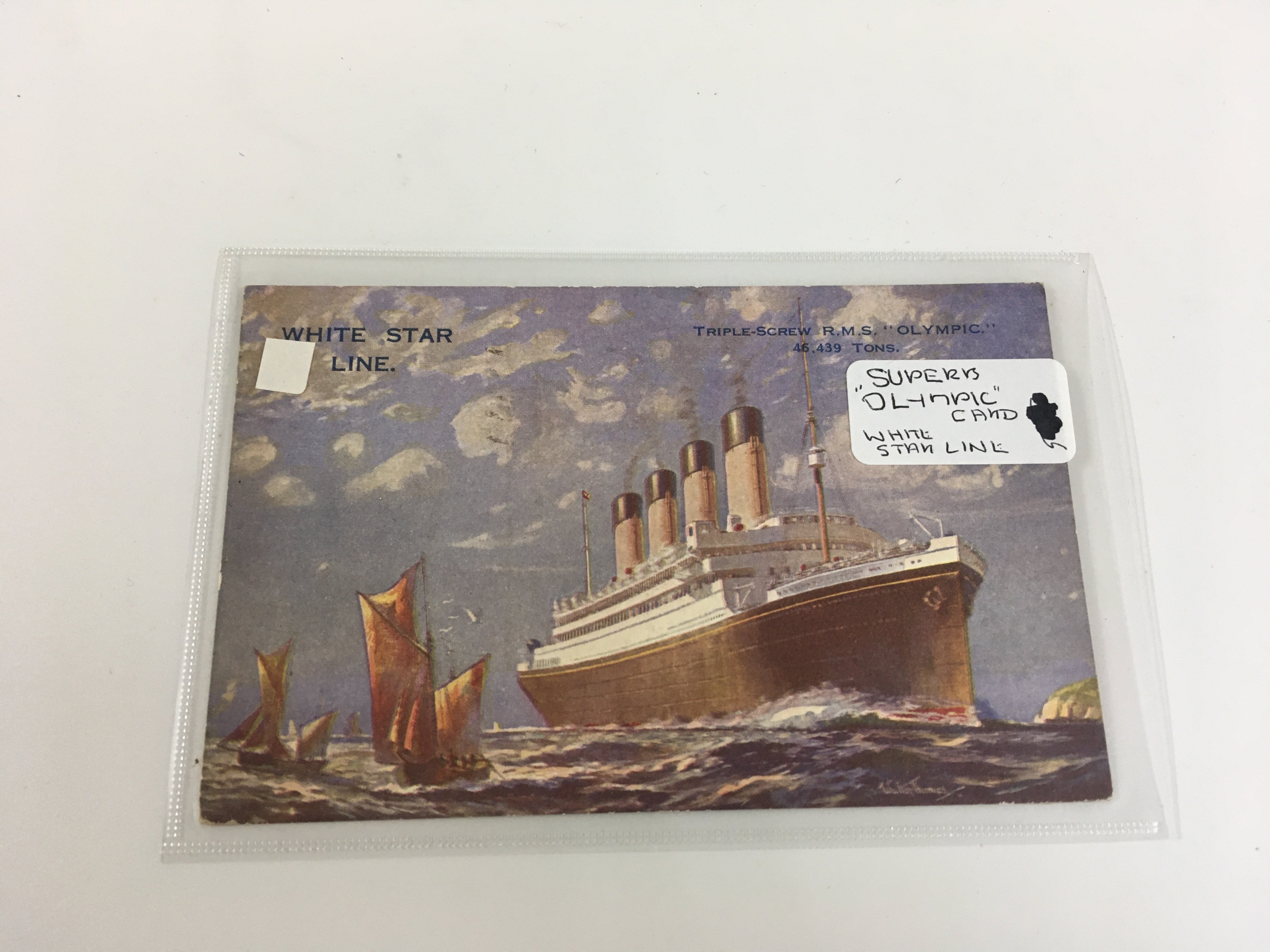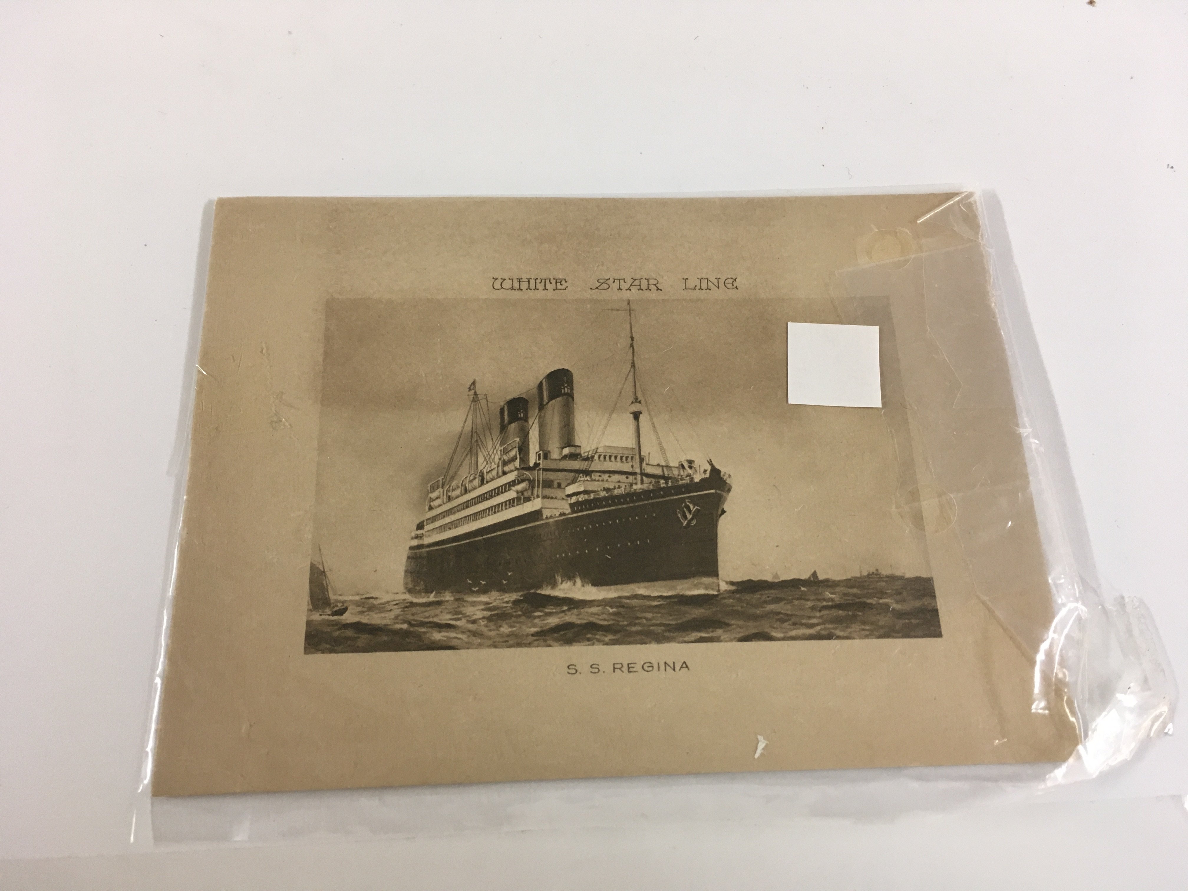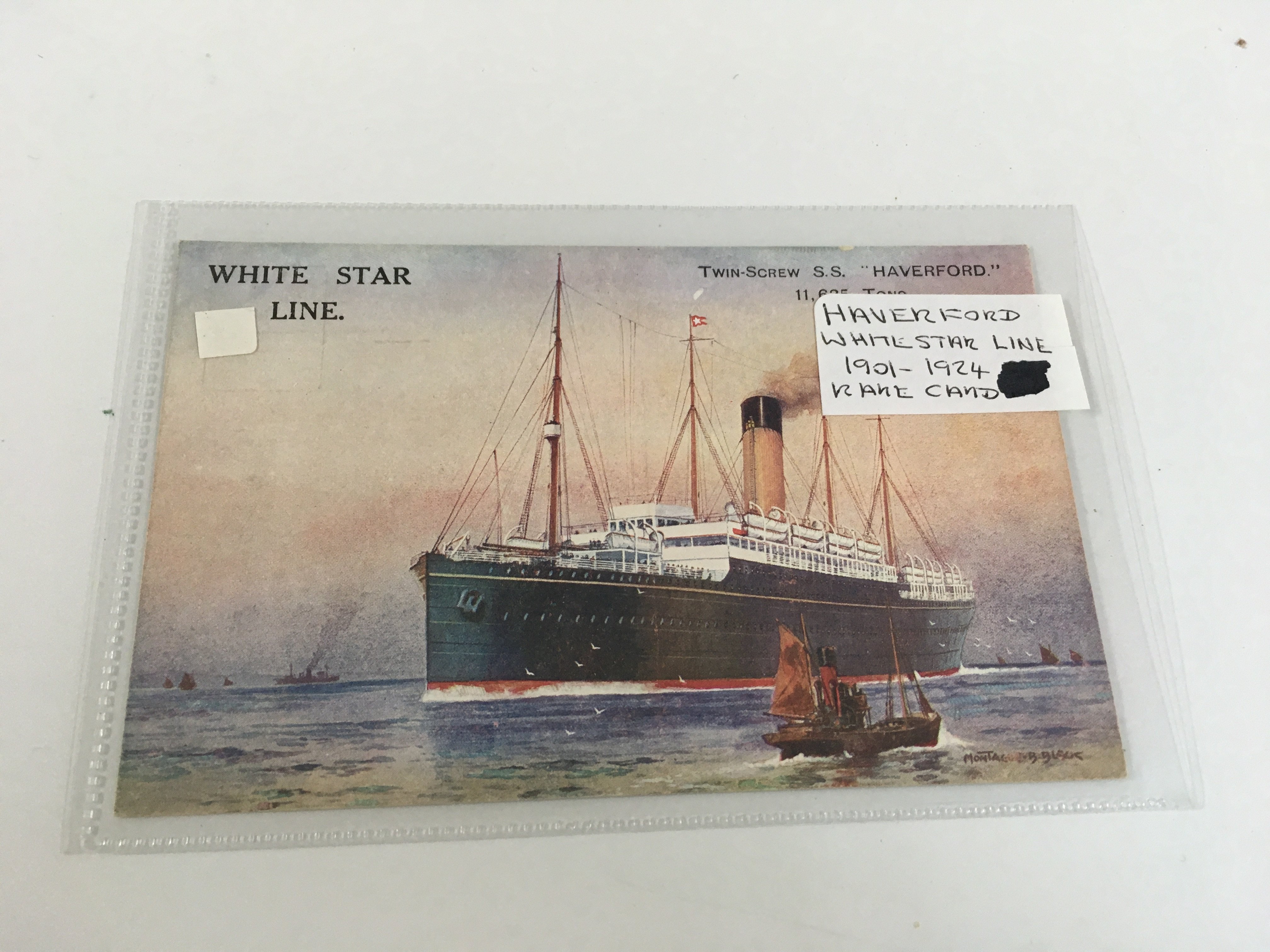 Collection of White Star Line postcards consisting of a used postcard from the RMS Doric posted 25/09/1933, used colour postcard from the RMS Olympic dated 1928, unused colour postcard from the SS Haverford from the white star line, early unused colour postcard from the white star line vessel the SS Medic, unused rare colour postcard from the white star line vessel the Cedric and abstract of log card from the white star line vessel the SS Regina