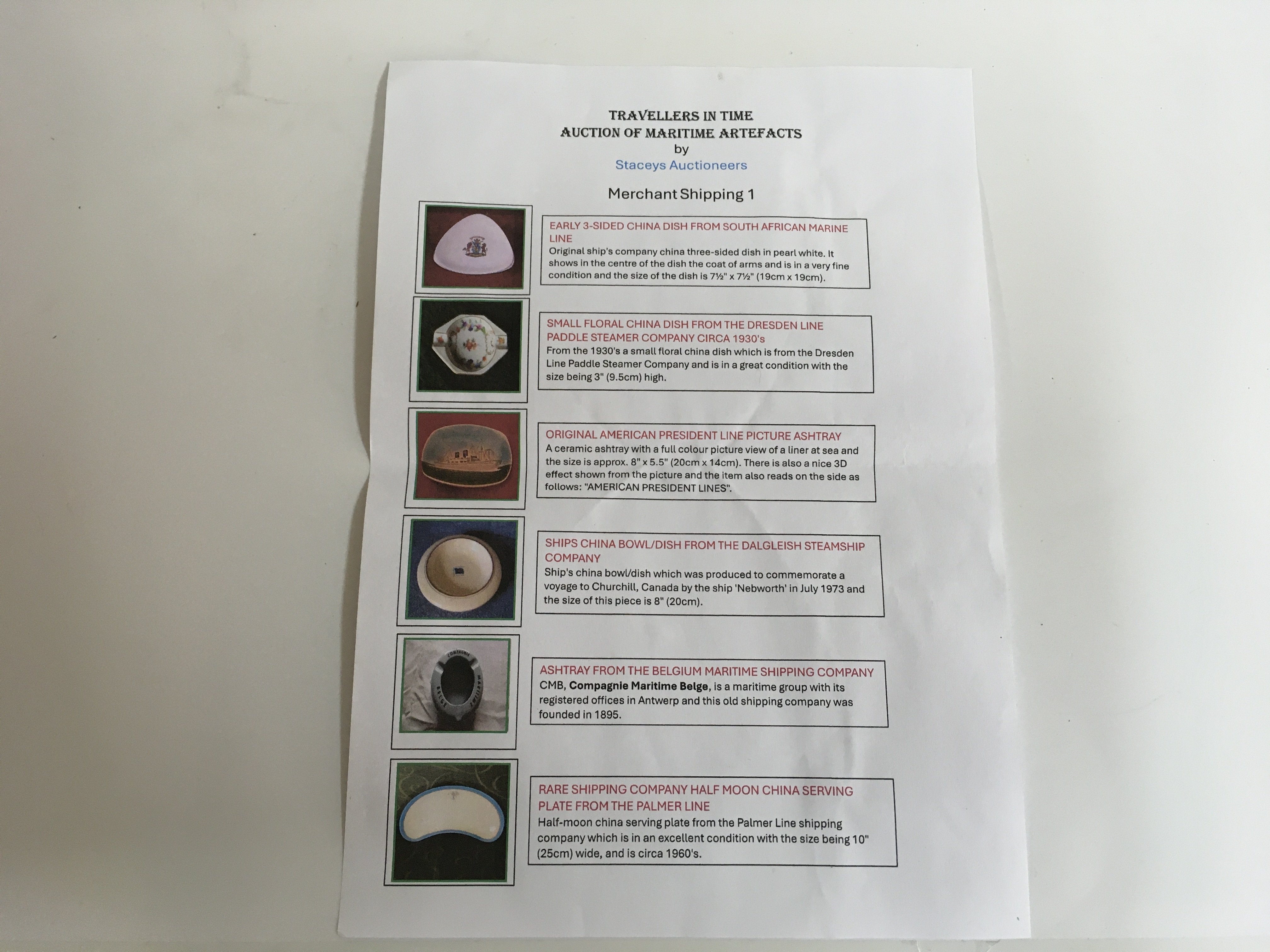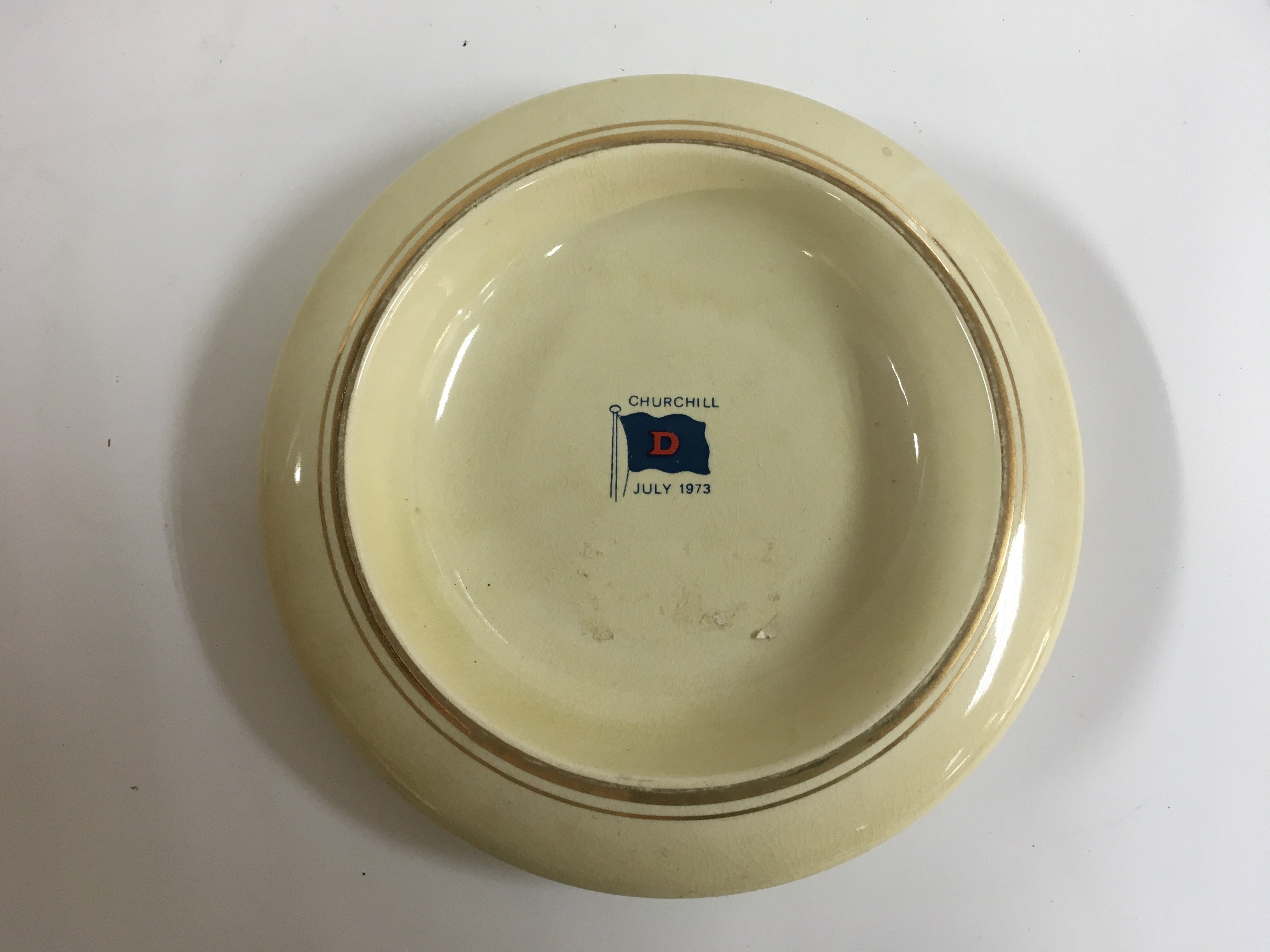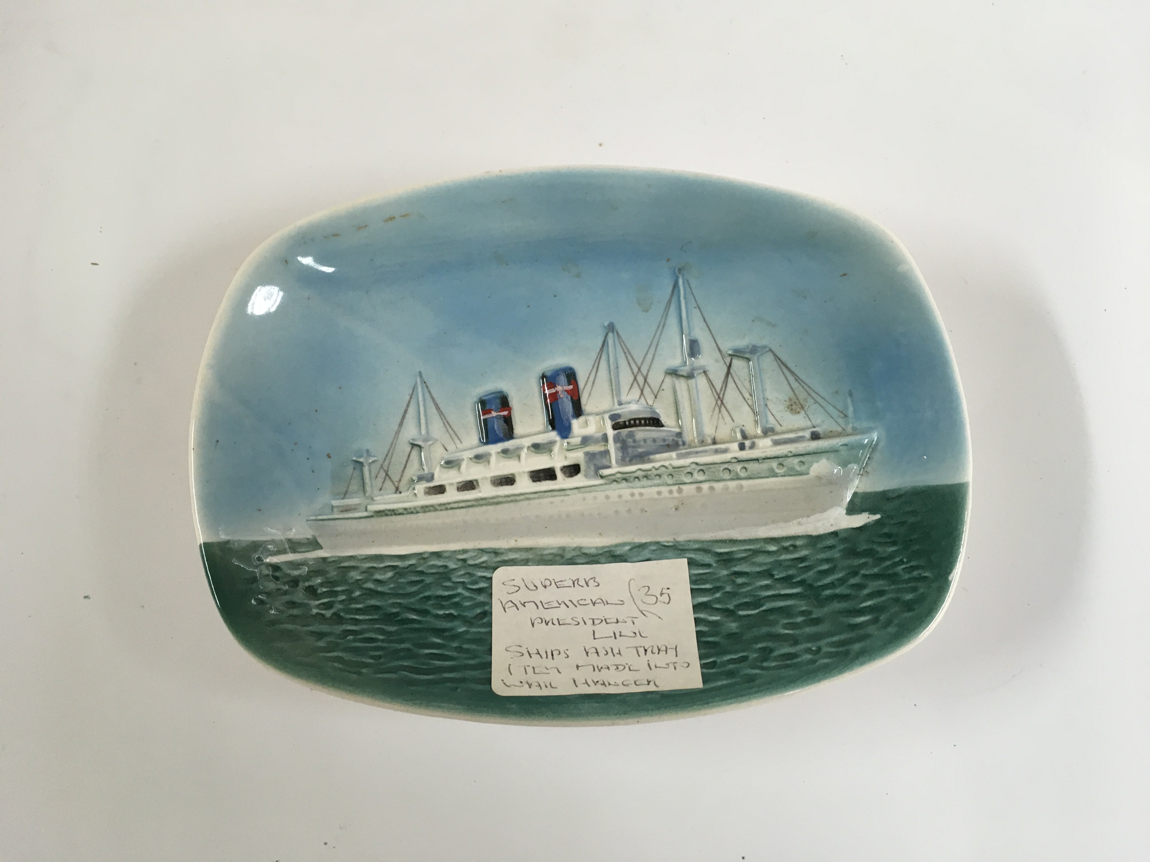 Collection of merchant shipping items consisting of early 3-sided China dish from South African marine line, small floral China dish from the Dresden line paddle steamer company circa 1930s, original American president line picture ashtray, ships China bowl from the Dalgeish steamship company and rare shipping company half moon China serving plate from the palmer line