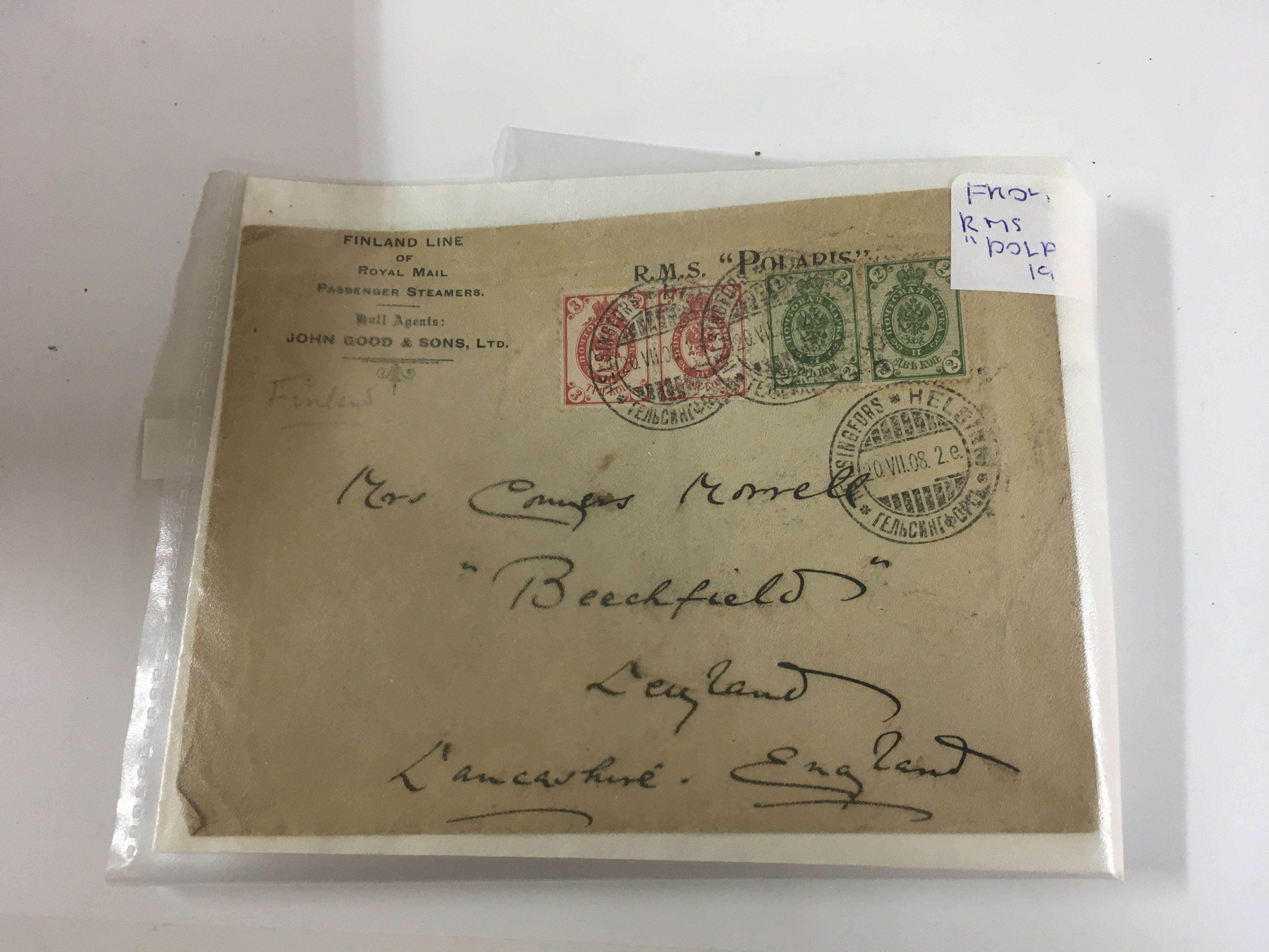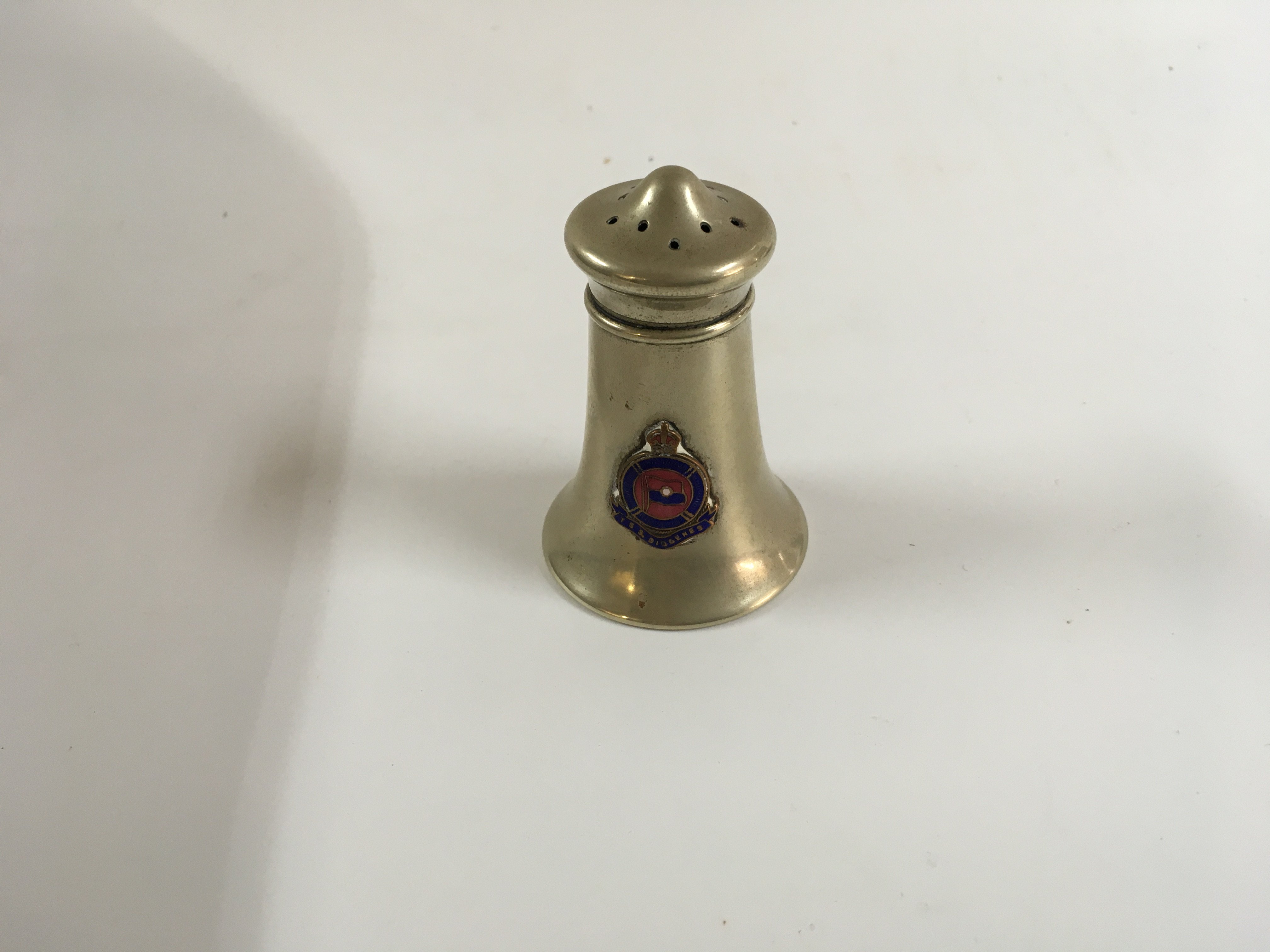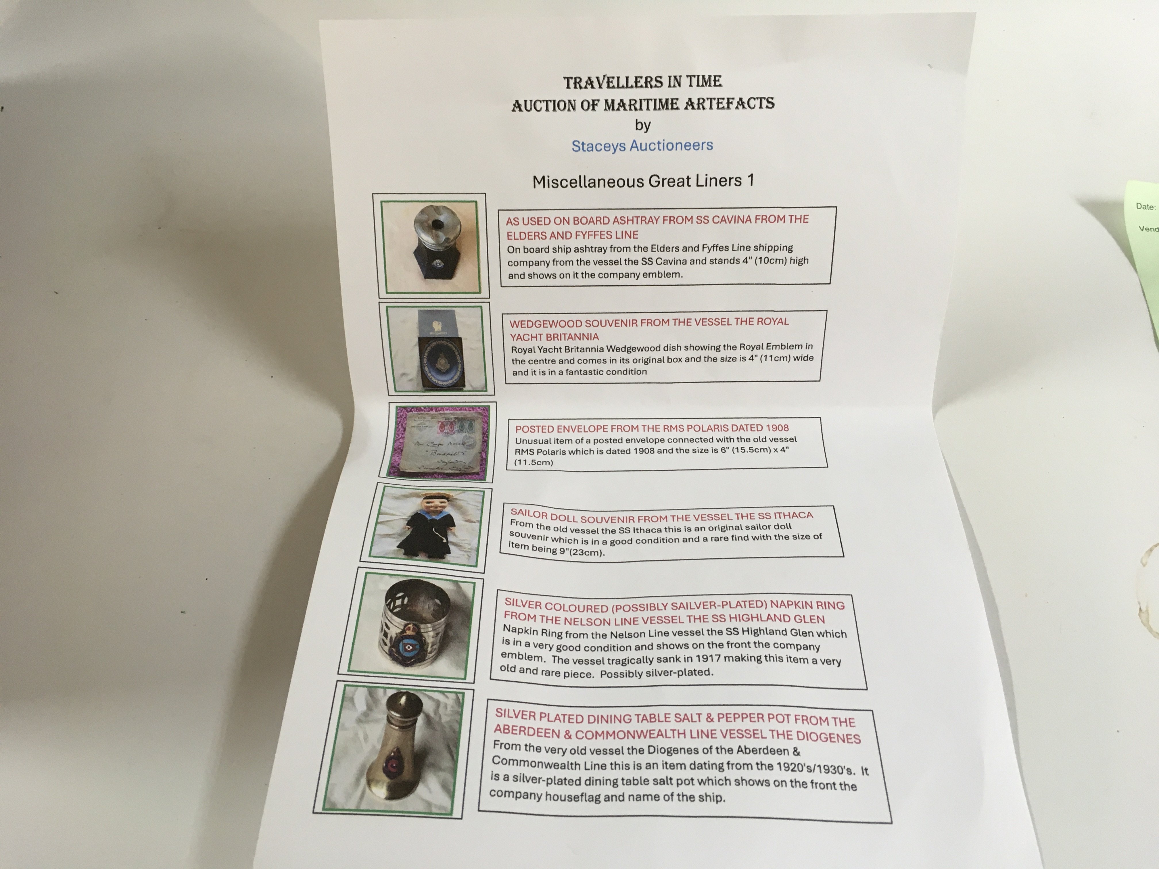 A collection of miscellaneous great liners items consisting of an as used on board ashtray from SS Cavina from the elders and fyffes line, Wedgewood souvenir from the vessel the royal yacht Britannia, posted envelope from the RMS Polaris dated 1908, sailor doll souvenir from the vessel the SS Ithaca, silver coloured napkin ring from the Nelson line vessel the SS Highland Glen and silver plated dining table salt & pepper pot from the Aberdeen & commonwealth line vessel the Diogenes