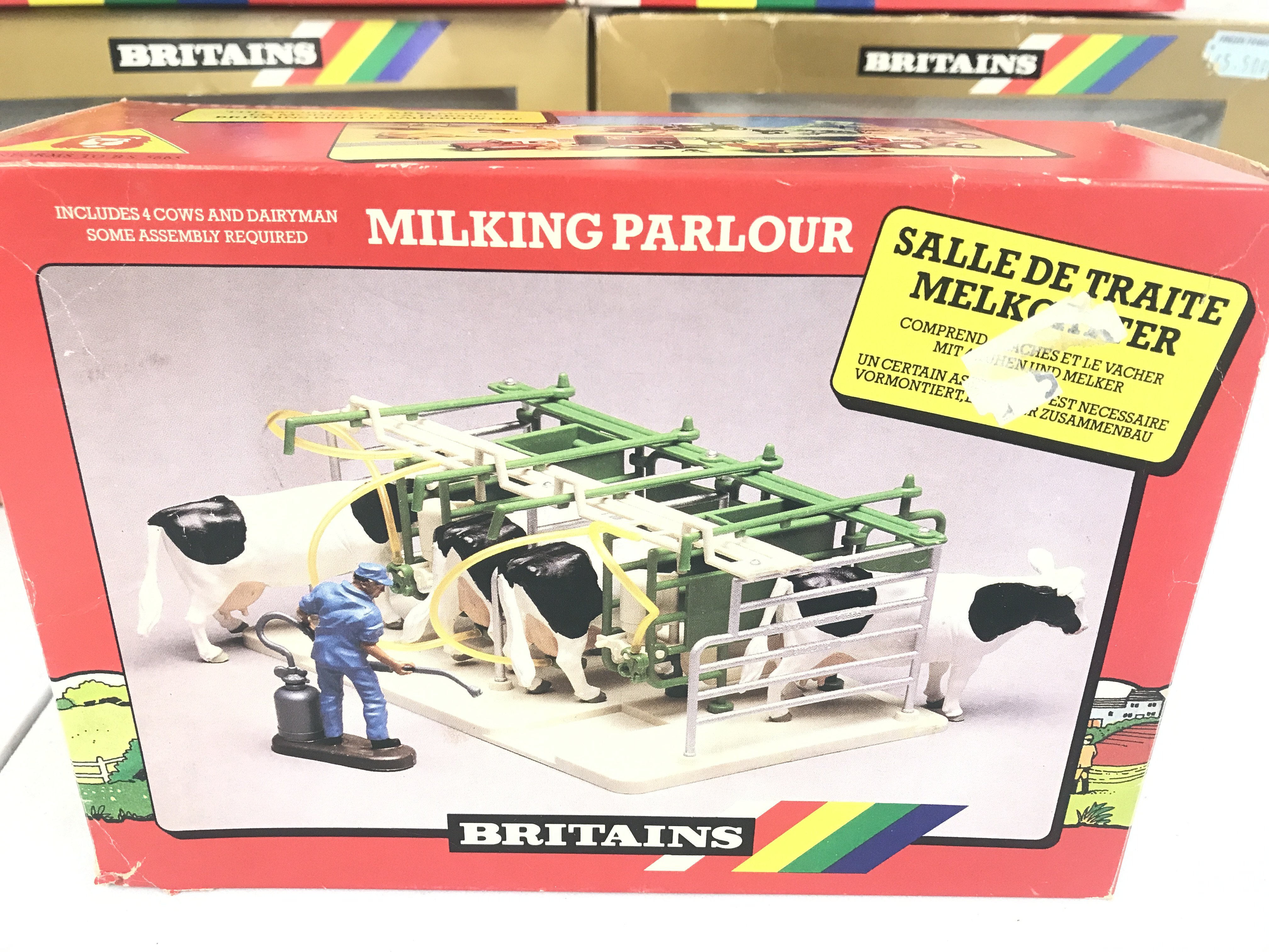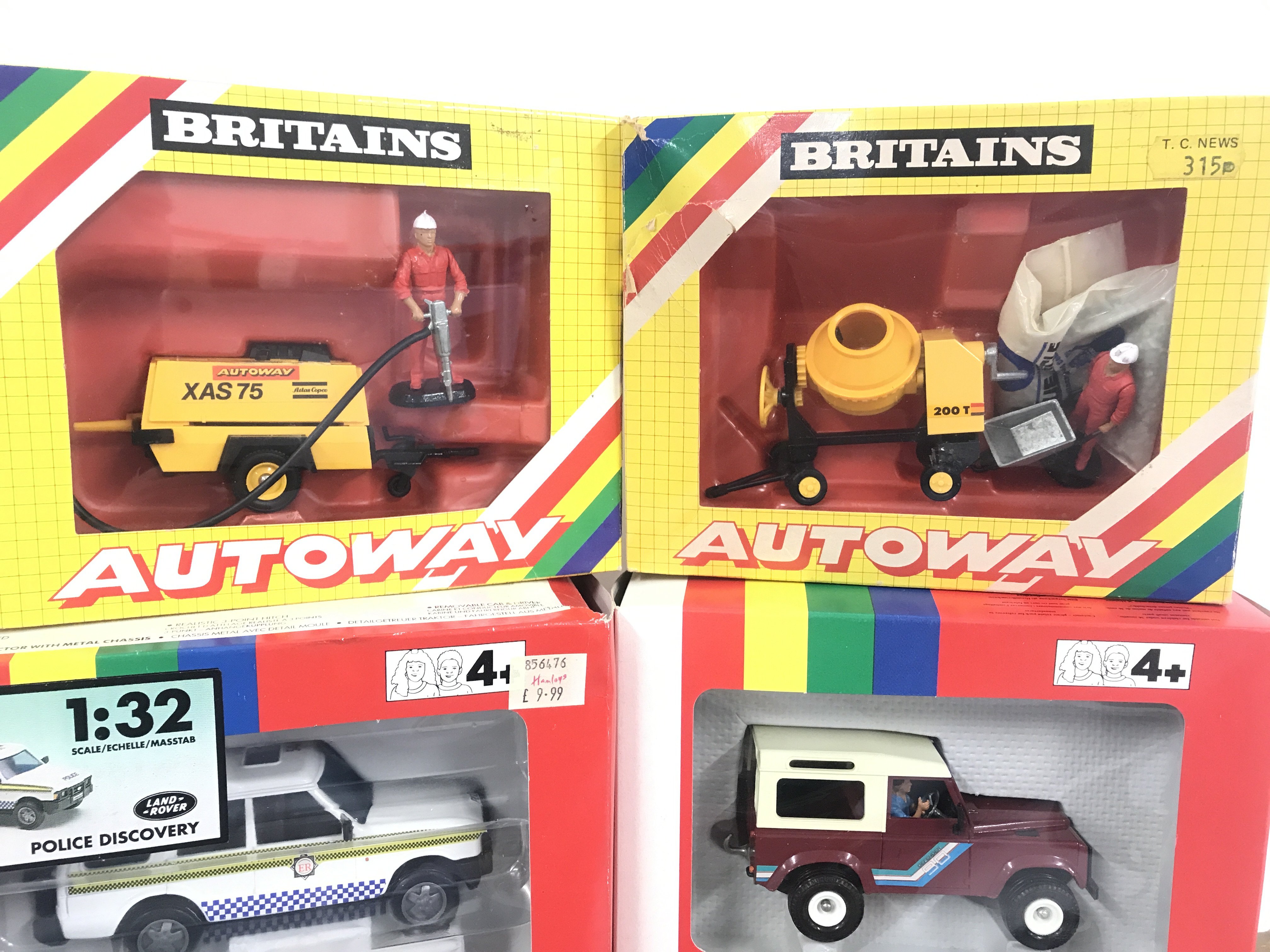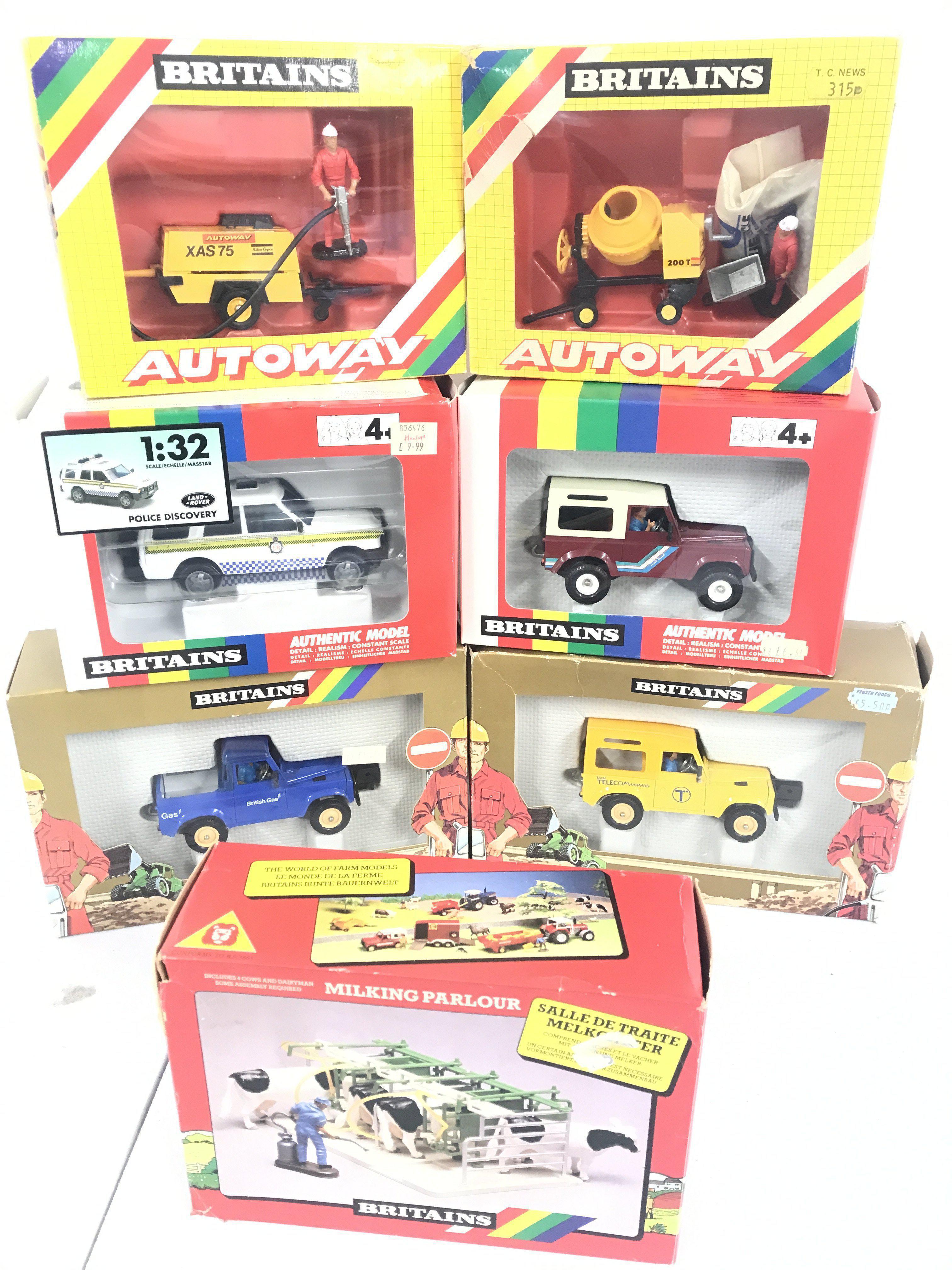 A Collection Of Boxed Britains Land Rovers. Autoway Sets And A Milking Parlour.(7).