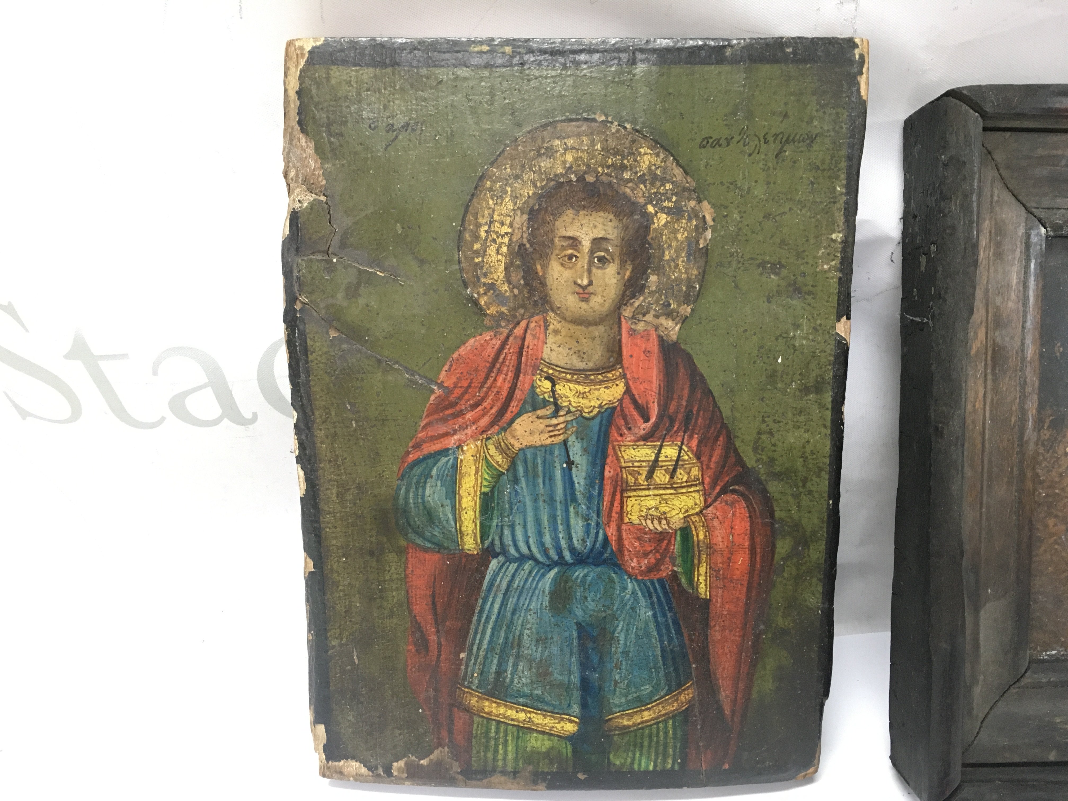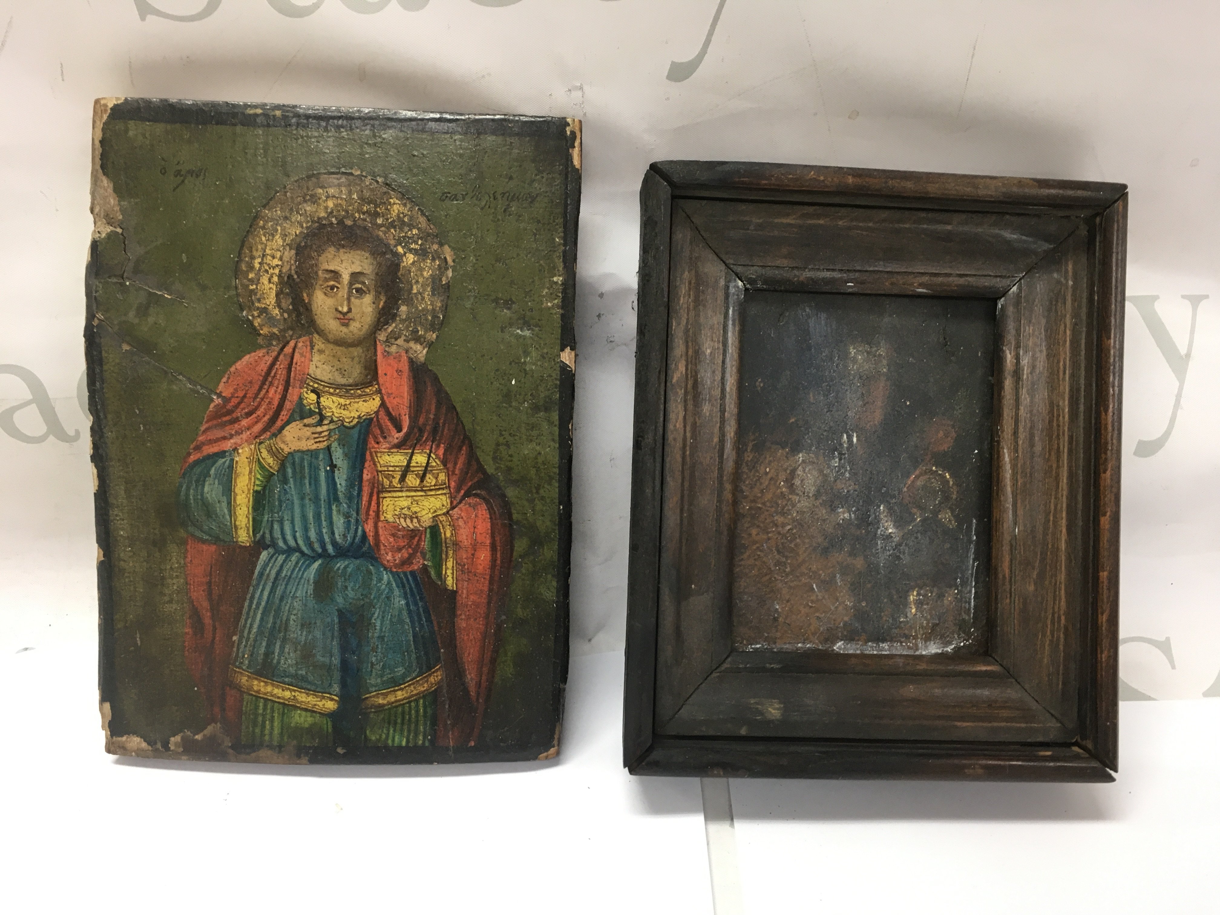 An antique Greek icon depicting Saint Panteleimon Approx 18cm wide by 24 cm tall and one other
