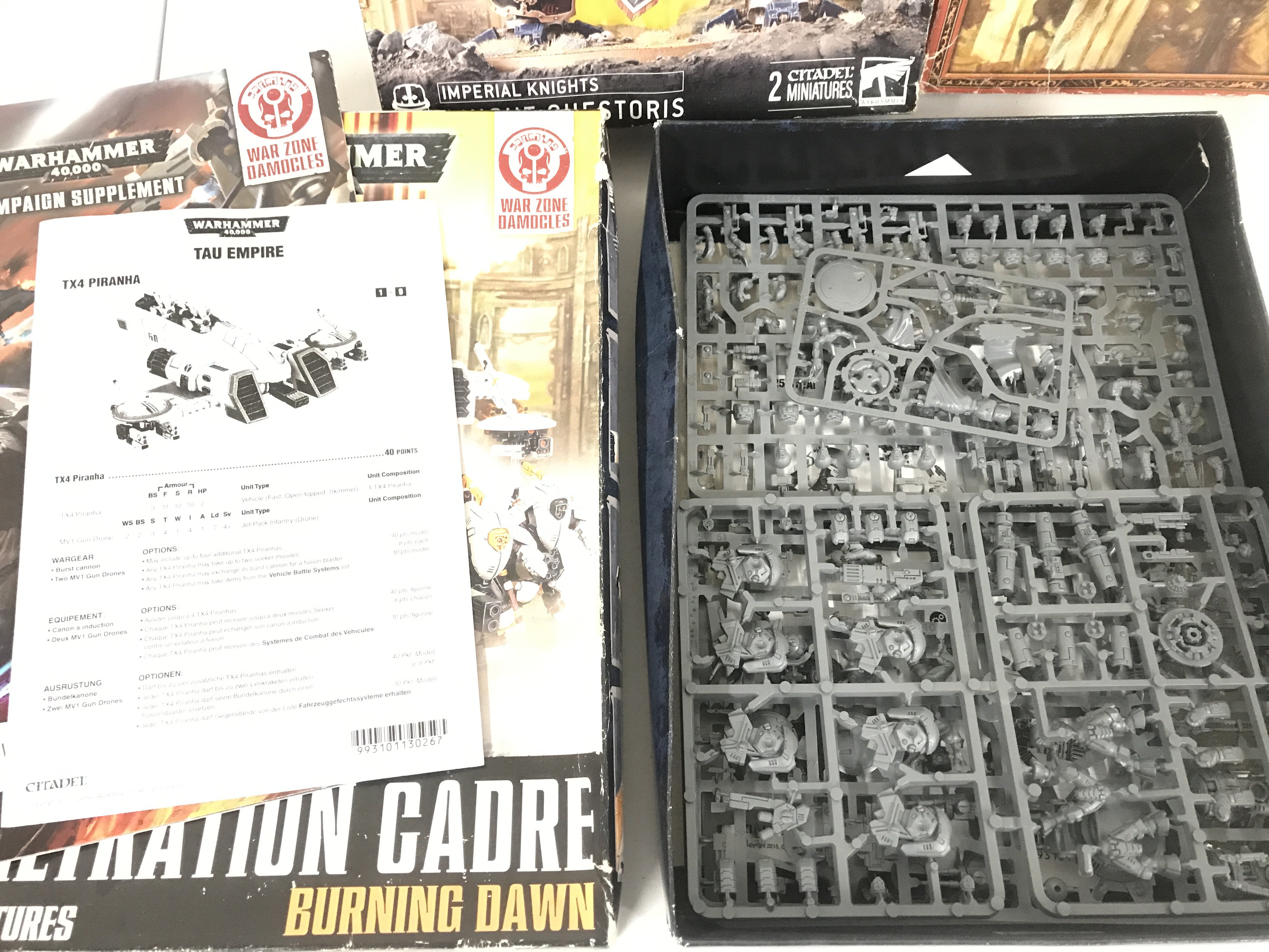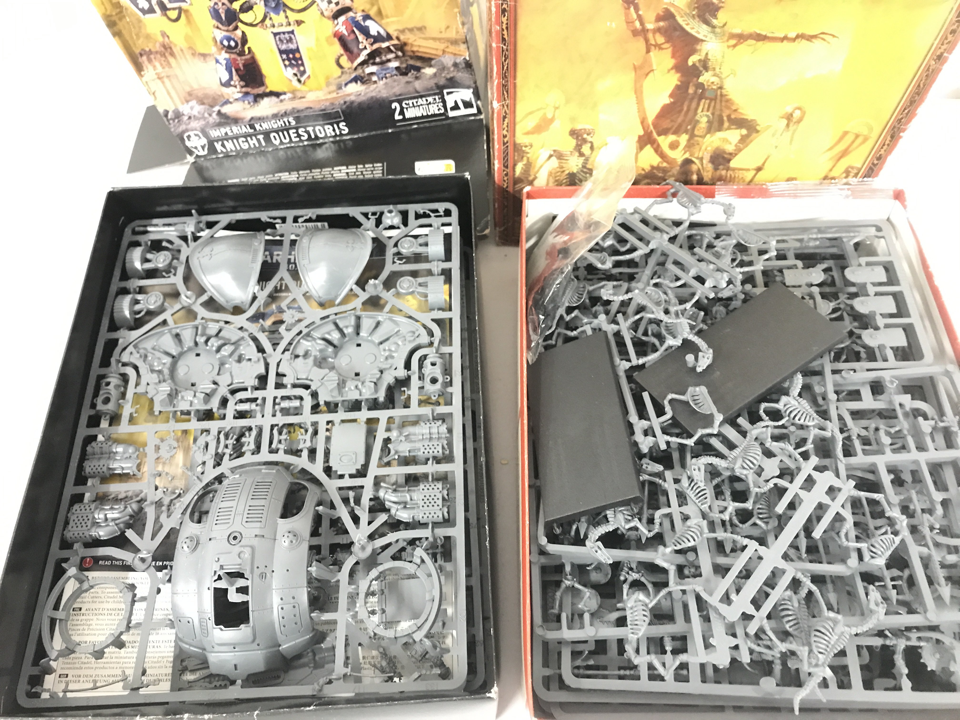 4 Boxed War Hammer Sets. Infiltration Gadre. Knight Questoris. High Elves Battalion and Tomb Kings Battalion. Som have been stated.