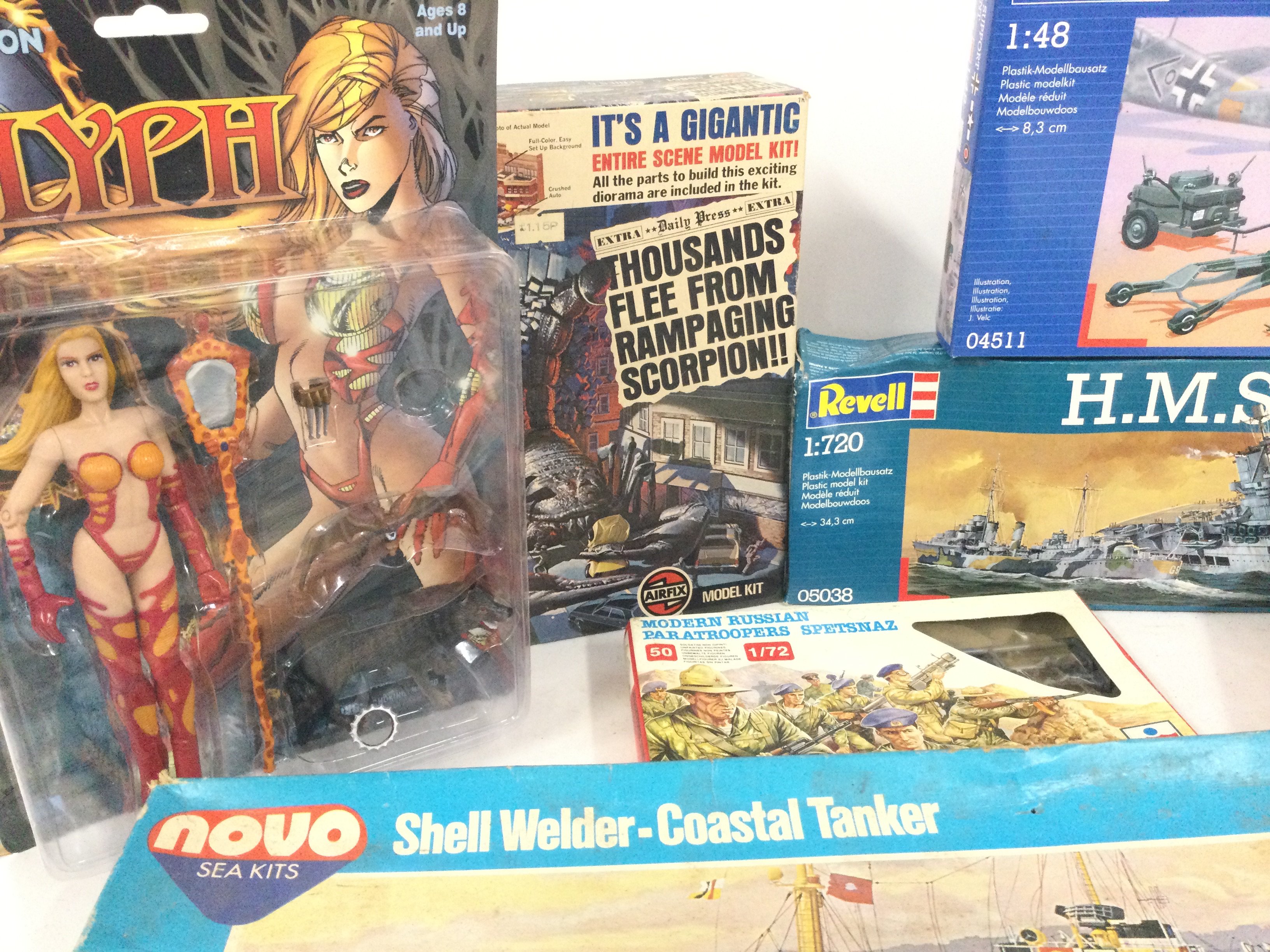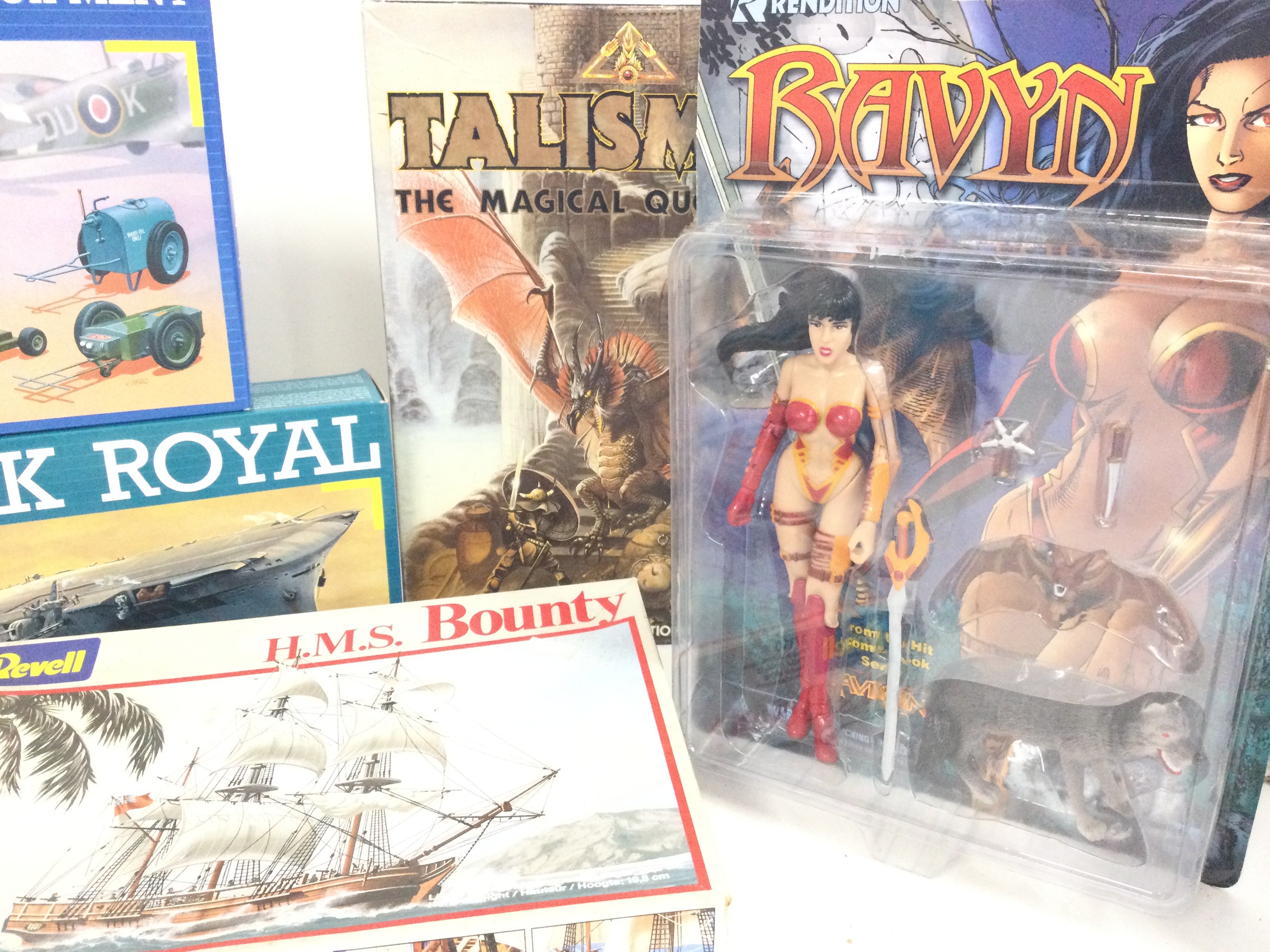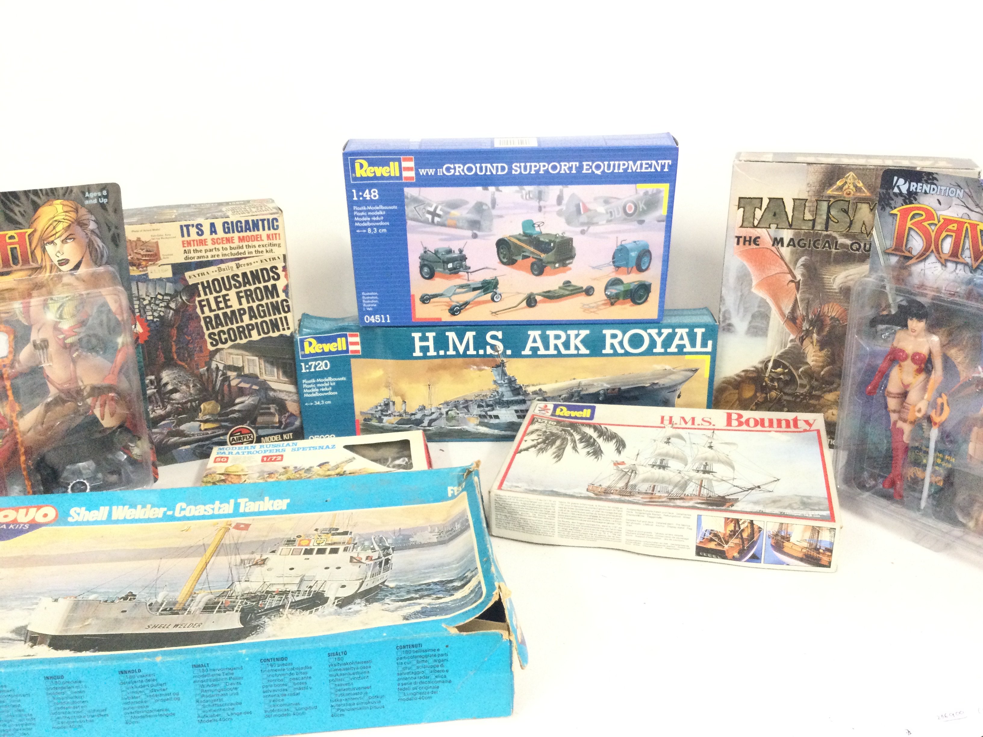 A Collection of Boxed Model Kits. 2X Rendition Figures. And a Tailsman board game.