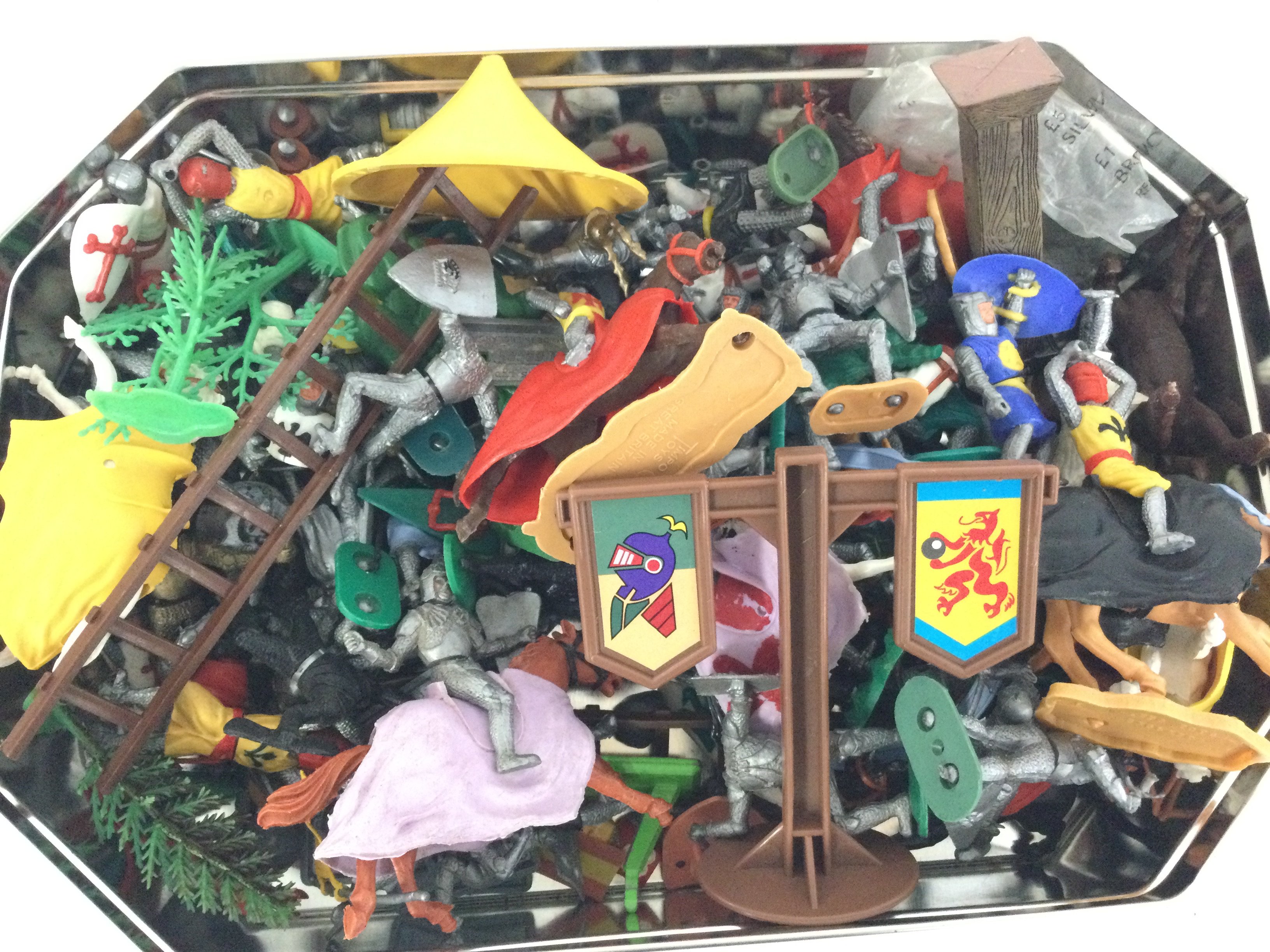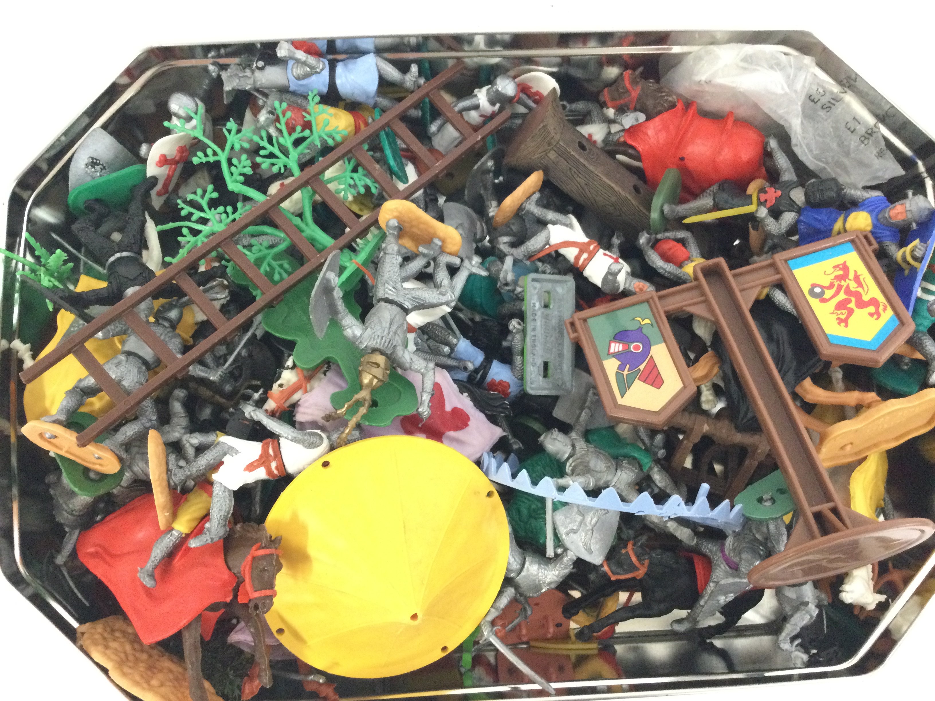 A Tin Containing plastic Knights Includes Timpo and Britains. No Reserve.