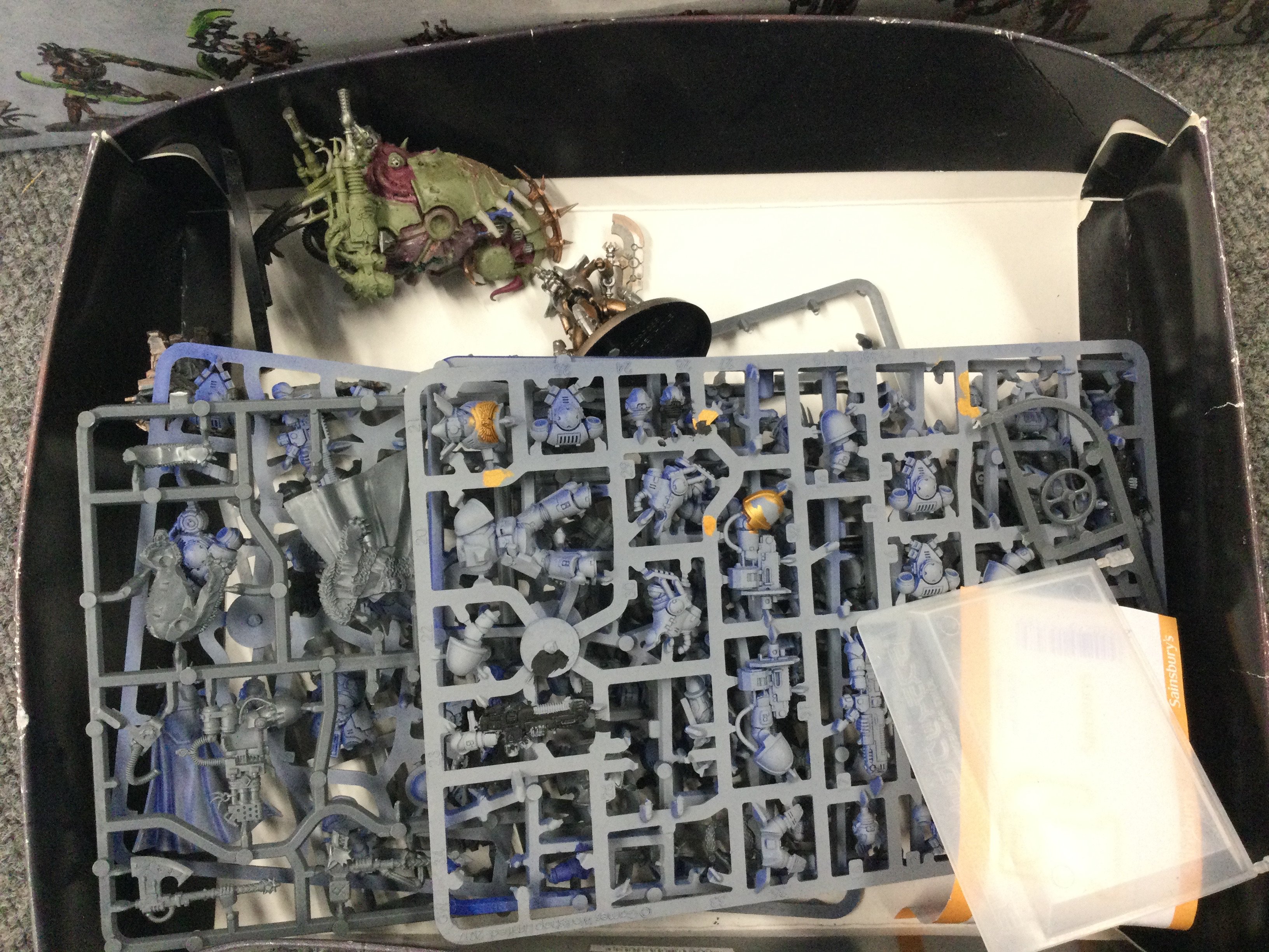 A Box Containing Plastic Warhammer Kits. Some have been painted and built.