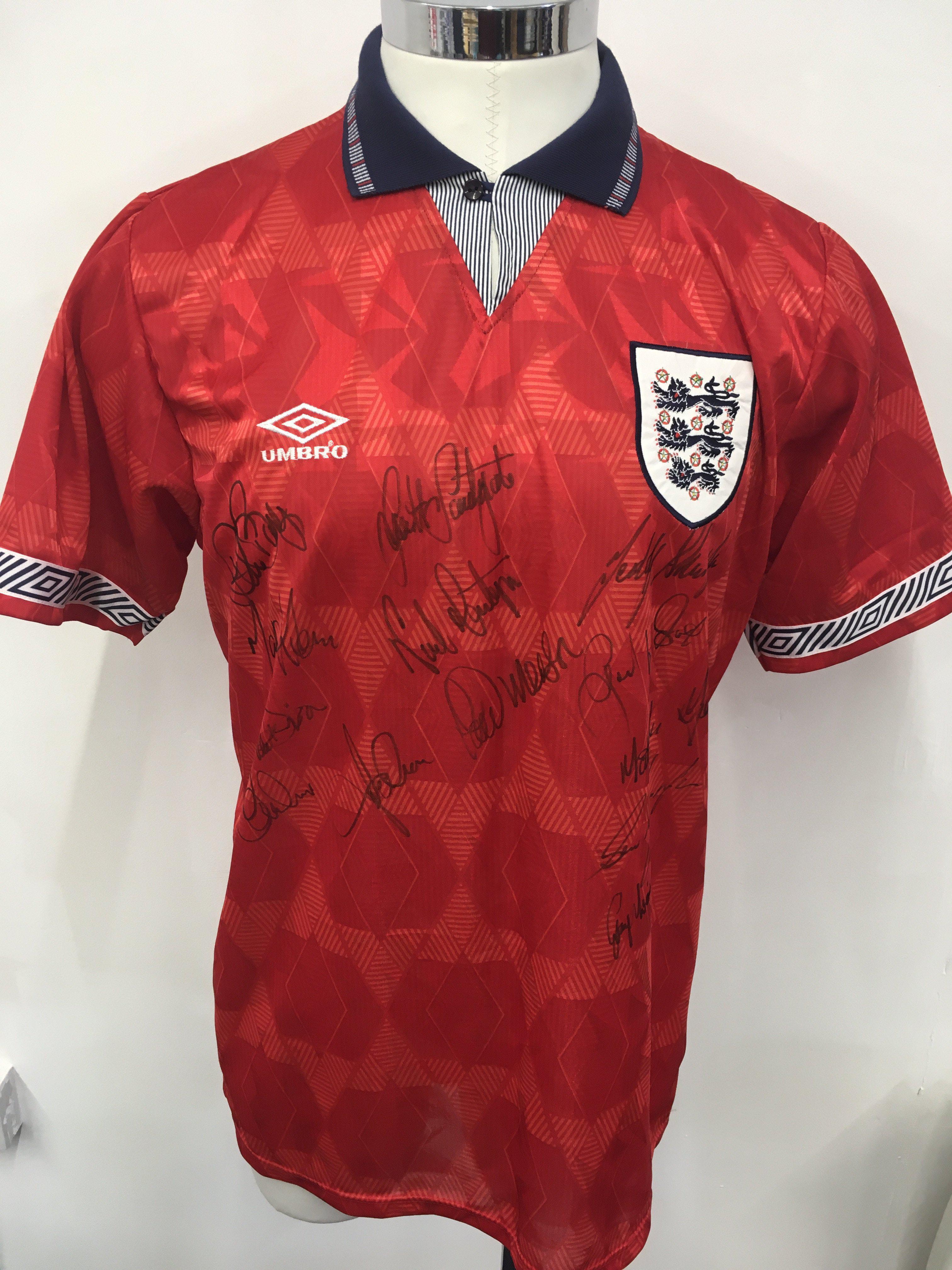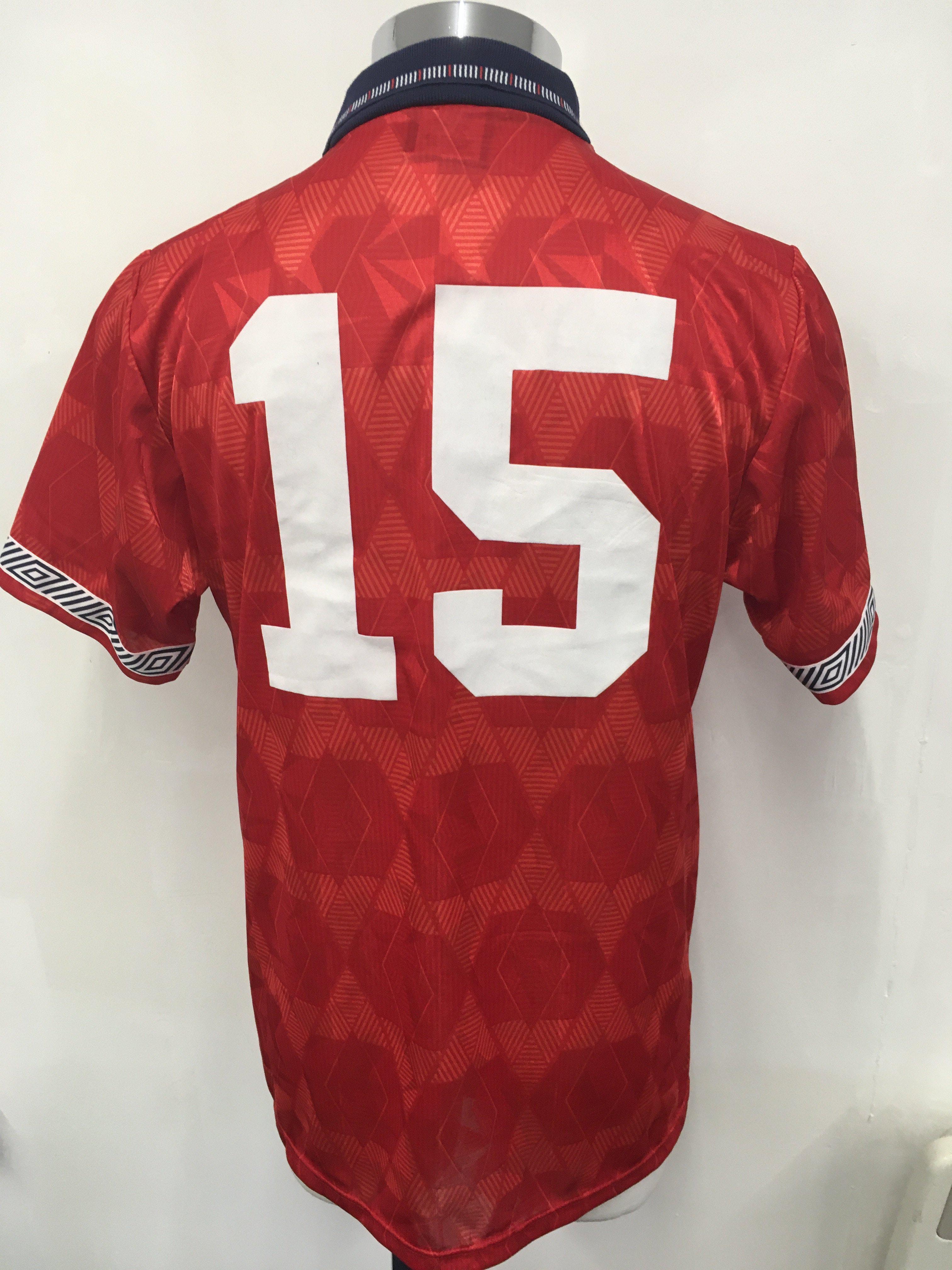 1992 Paul Merson England B Match Worn Football Shirt: Red away short sleeve with blue collar. Number 15 to rear. Signed by 13 squad members including Merson Le Saux Southgate Dixon and Martyn.